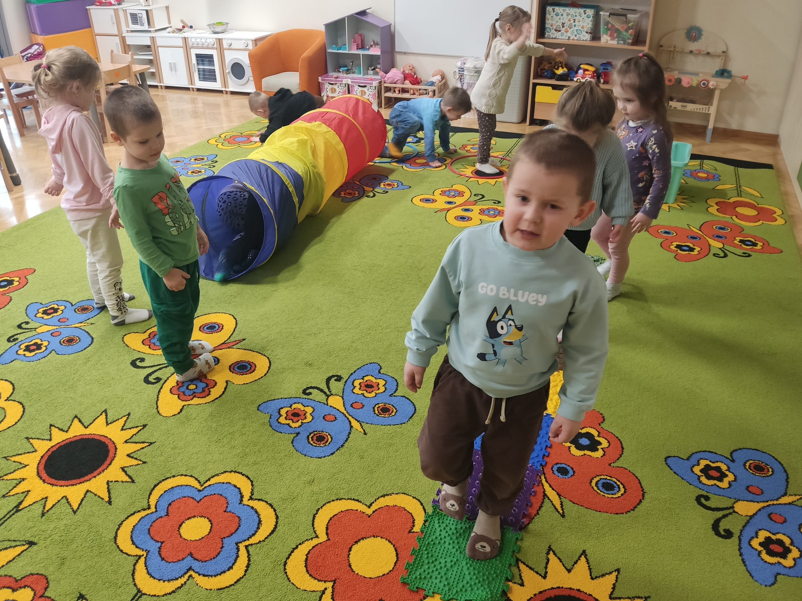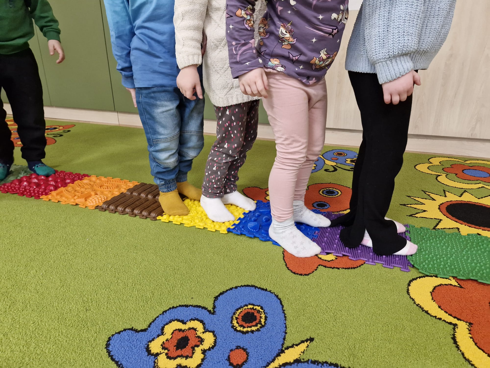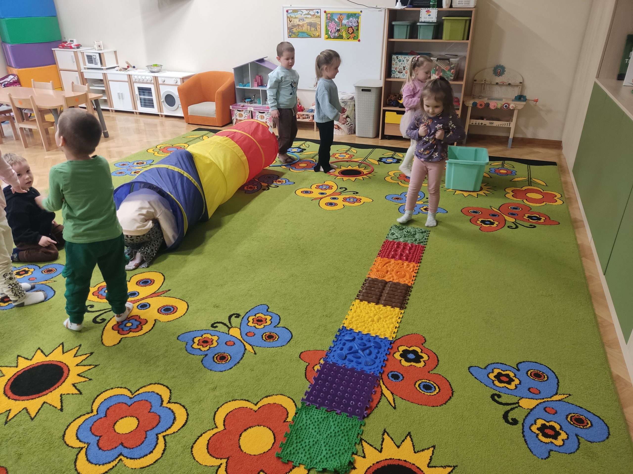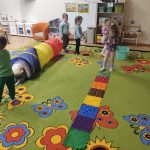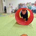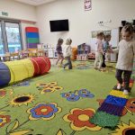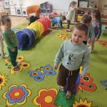 W ramach realizowanej innowacji pedagogicznej pt. „Kraina Zmysłów – sensoryczna podróż przez świat natury” w grupie Jeżyków odbyły się zajęcia rozwijające zmysły oraz sprawność motoryczną dzieci. Mali odkrywcy wyruszyli w sensoryczną podróż pełną różnorodnych faktur, dźwięków i kolorów, angażując wszystkie zmysły. Dzieci miały okazję przejść przez specjalnie przygotowany labirynt sensoryczny, w którym stąpały po ścieżce wykonanej