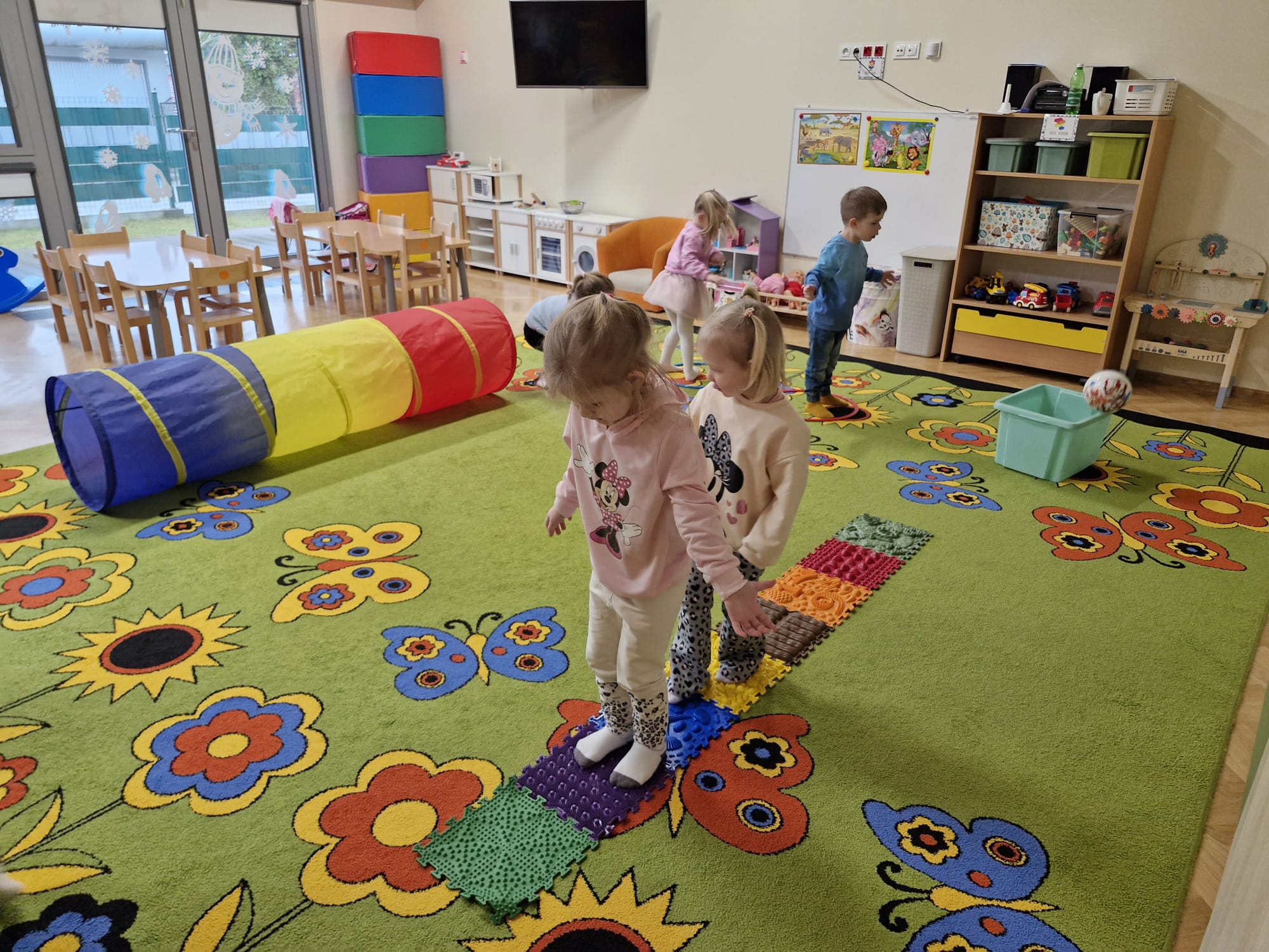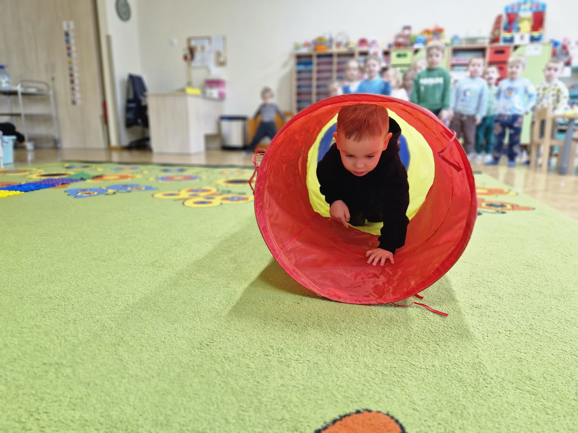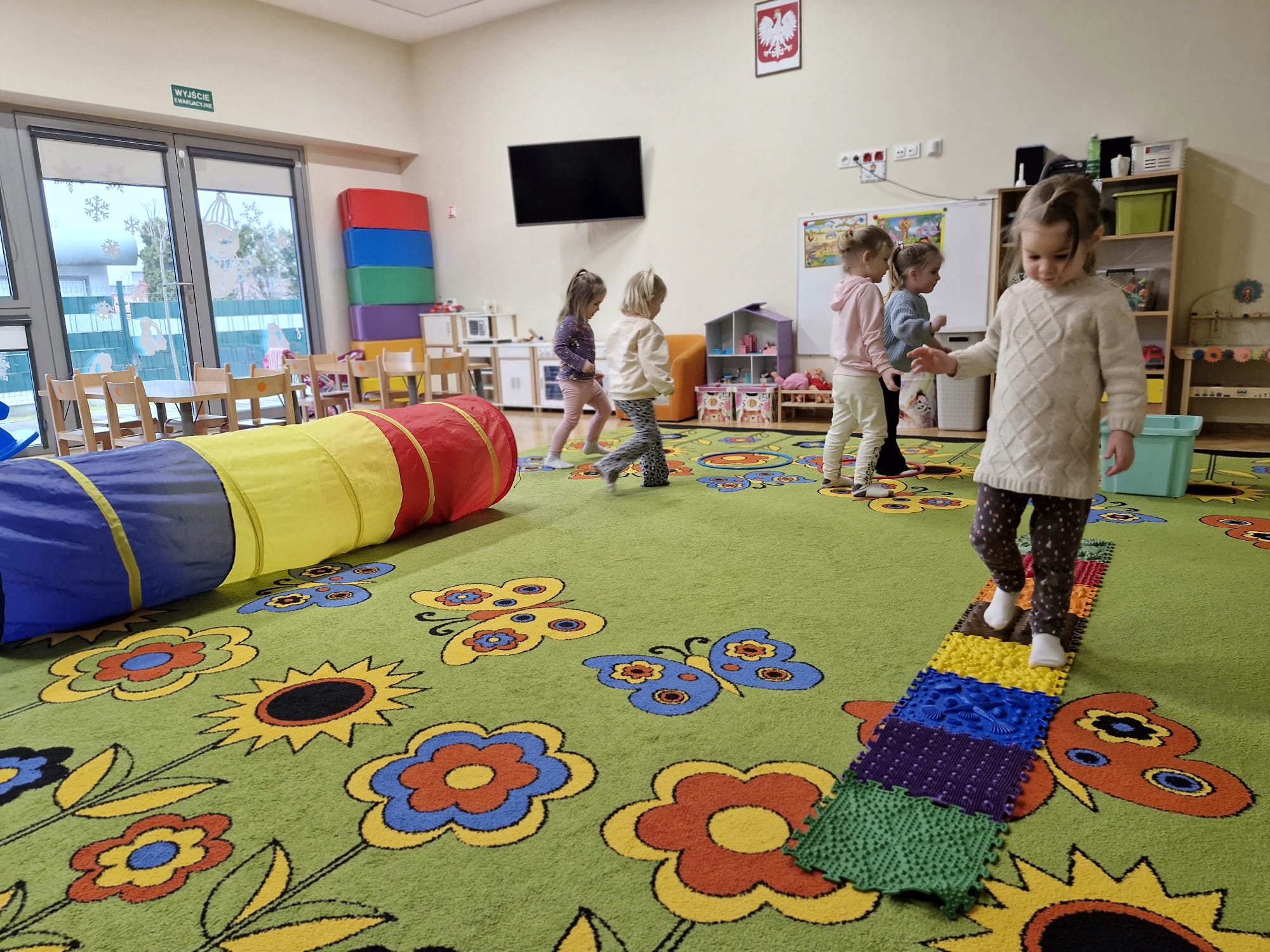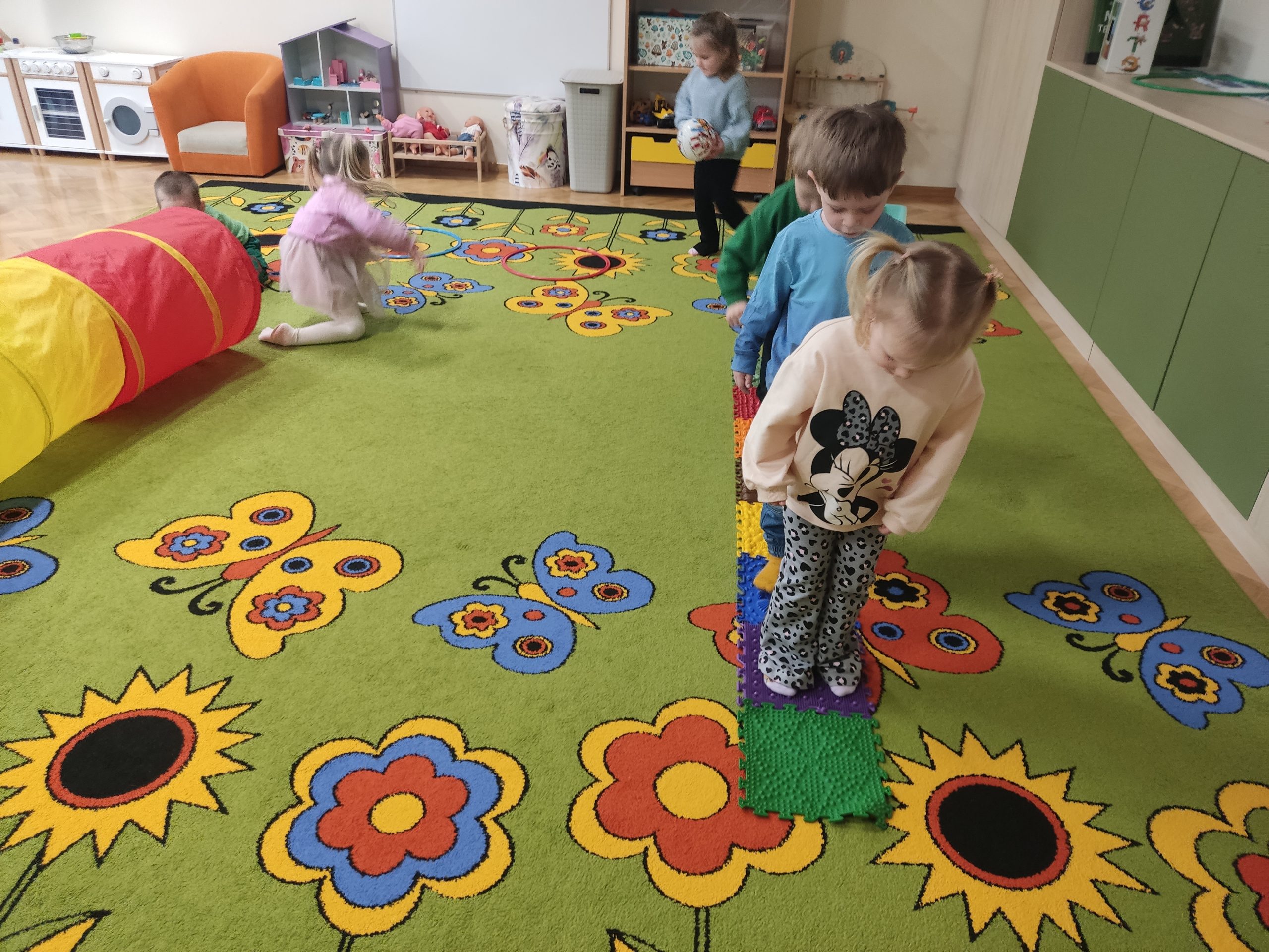 W ramach realizowanej innowacji pedagogicznej pt. „Kraina Zmysłów – sensoryczna podróż przez świat natury” w grupie Jeżyków odbyły się zajęcia rozwijające zmysły oraz sprawność motoryczną dzieci. Mali odkrywcy wyruszyli w sensoryczną podróż pełną różnorodnych faktur, dźwięków i kolorów, angażując wszystkie zmysły. Dzieci miały okazję przejść przez specjalnie przygotowany labirynt sensoryczny, w którym stąpały po ścieżce wykonanej