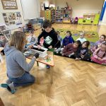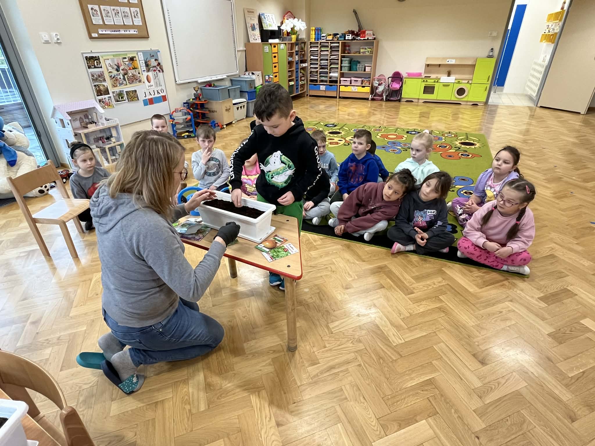 Następnie przystąpiliśmy do sadzenia warzyw. Przedszkolaki miały okazję samodzielnie posadzić nasionka lub sadzonki w doniczkach z ziemią. Dzieci uczyły się, jak prawidłowo umieścić nasionko w glebie oraz jak je podlać.