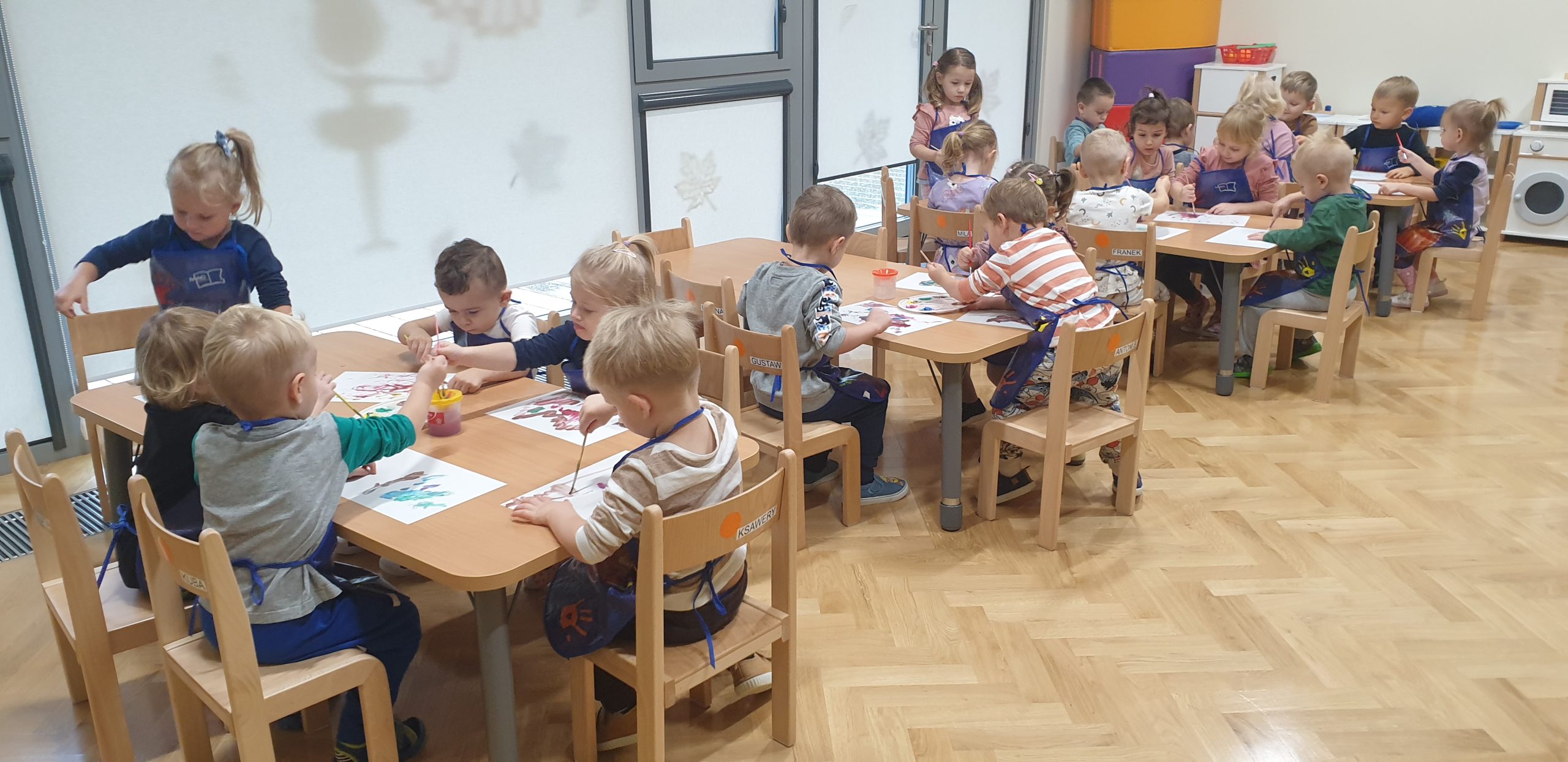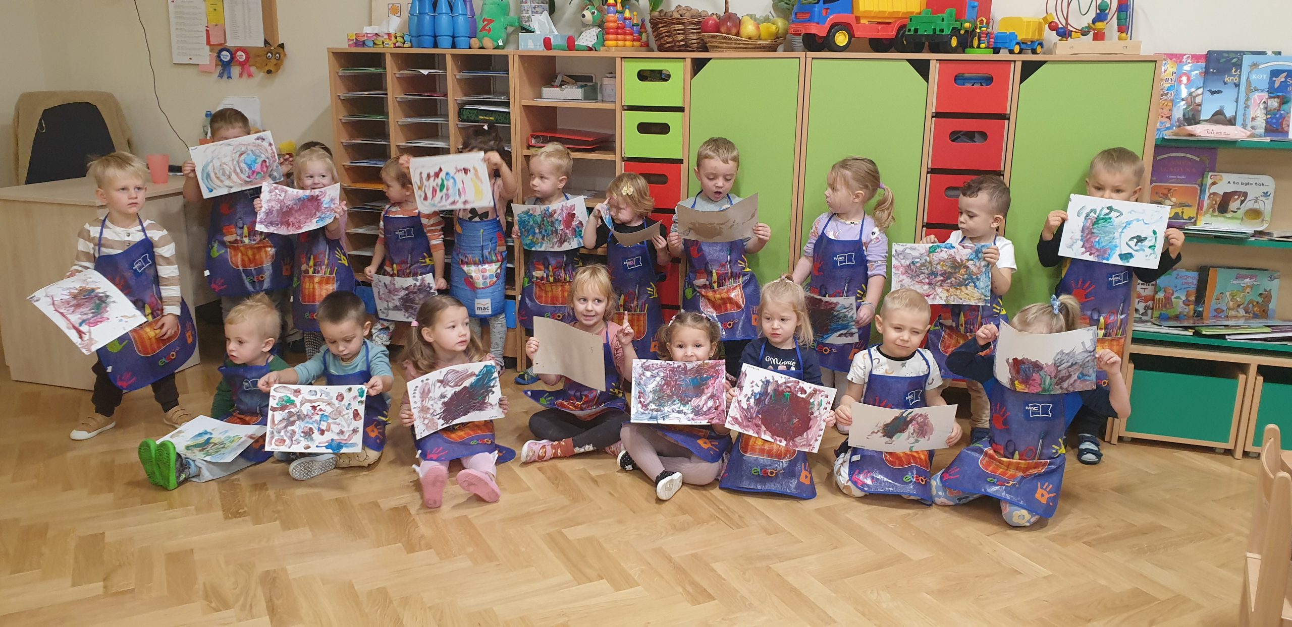 „Jeżyki” zaopatrzone w fartuszki, pędzle, farby i kartkę papieru tworzyły swoje małe dzieła. Ćwiczyły sprawność manualną, ale także starały się wykonać pracę według własnego pomysłu. Przy dźwiękach muzyki relaksacyjnej powstały nasze małe arcydzieła!