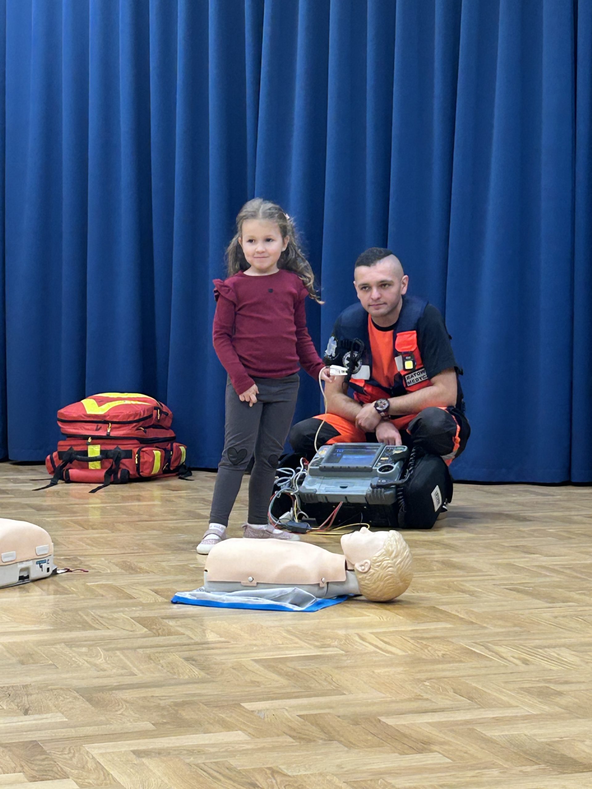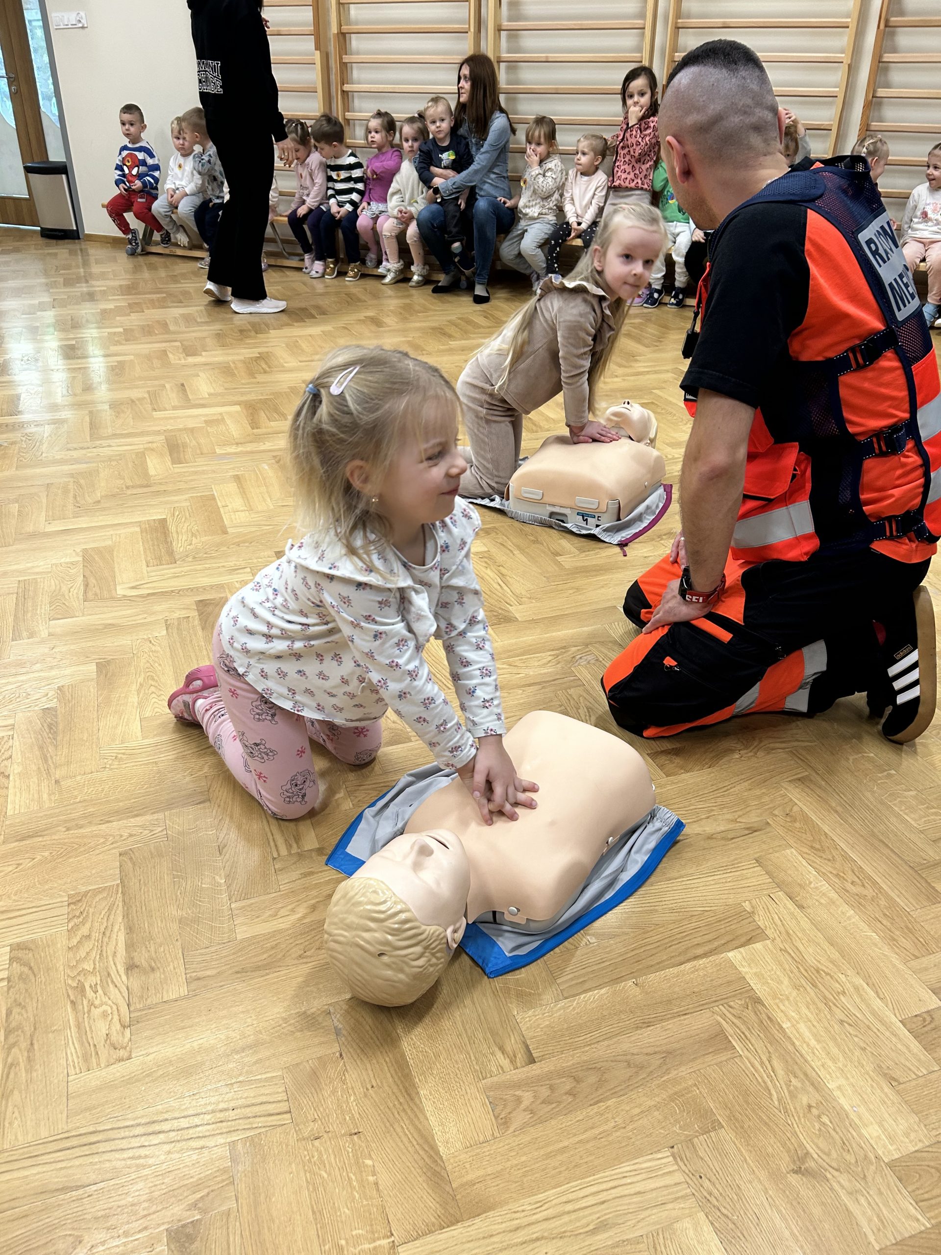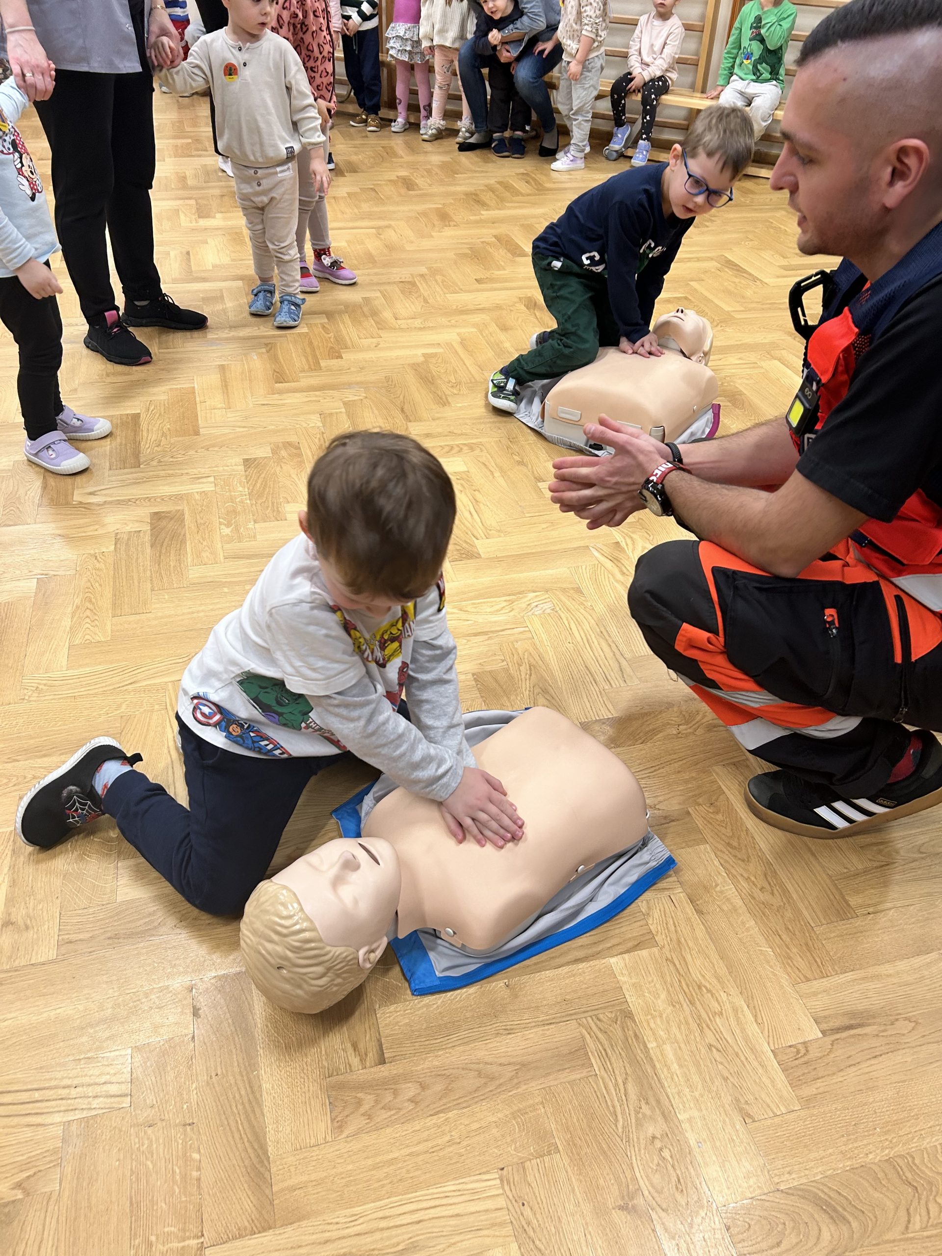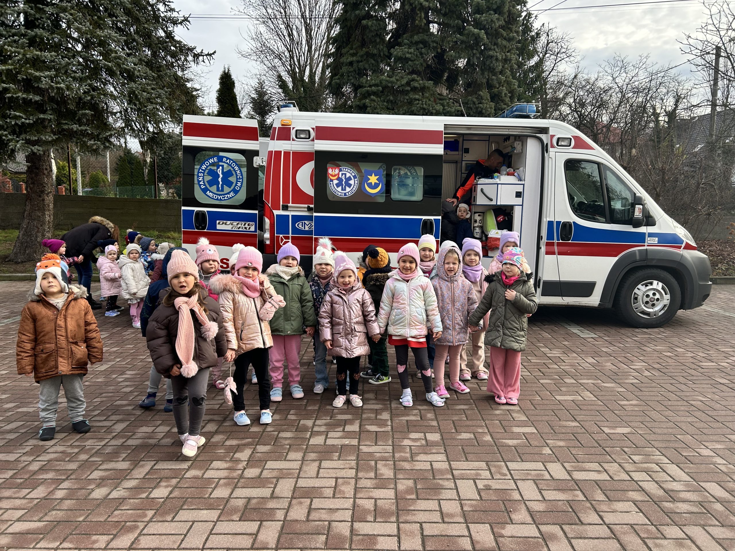 Dnia 10.12.2025 Nasze przedszkole odwiedził ratownik medyczny ,który uczył dzieci udzielania pierwszej pomocy. Nasza grupa bardzo odważnie i z zainteresowaniem podchodziła do ćwiczeń z fantomem. Na koniec ratownik służby zdrowia zabrał dzieci do karetki, by poznały jakie sprzęty znajdują się w środku niezbędne do ratowania życia ludzkiego.