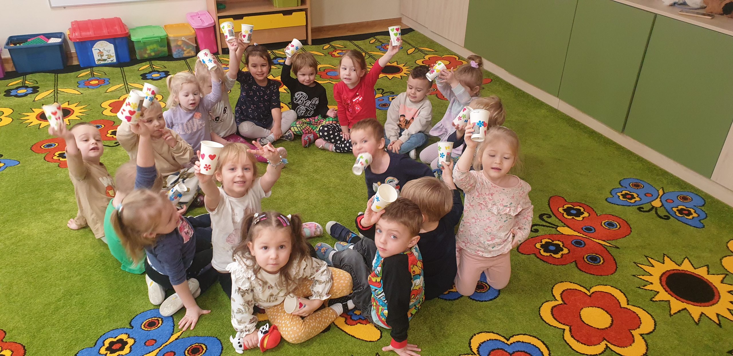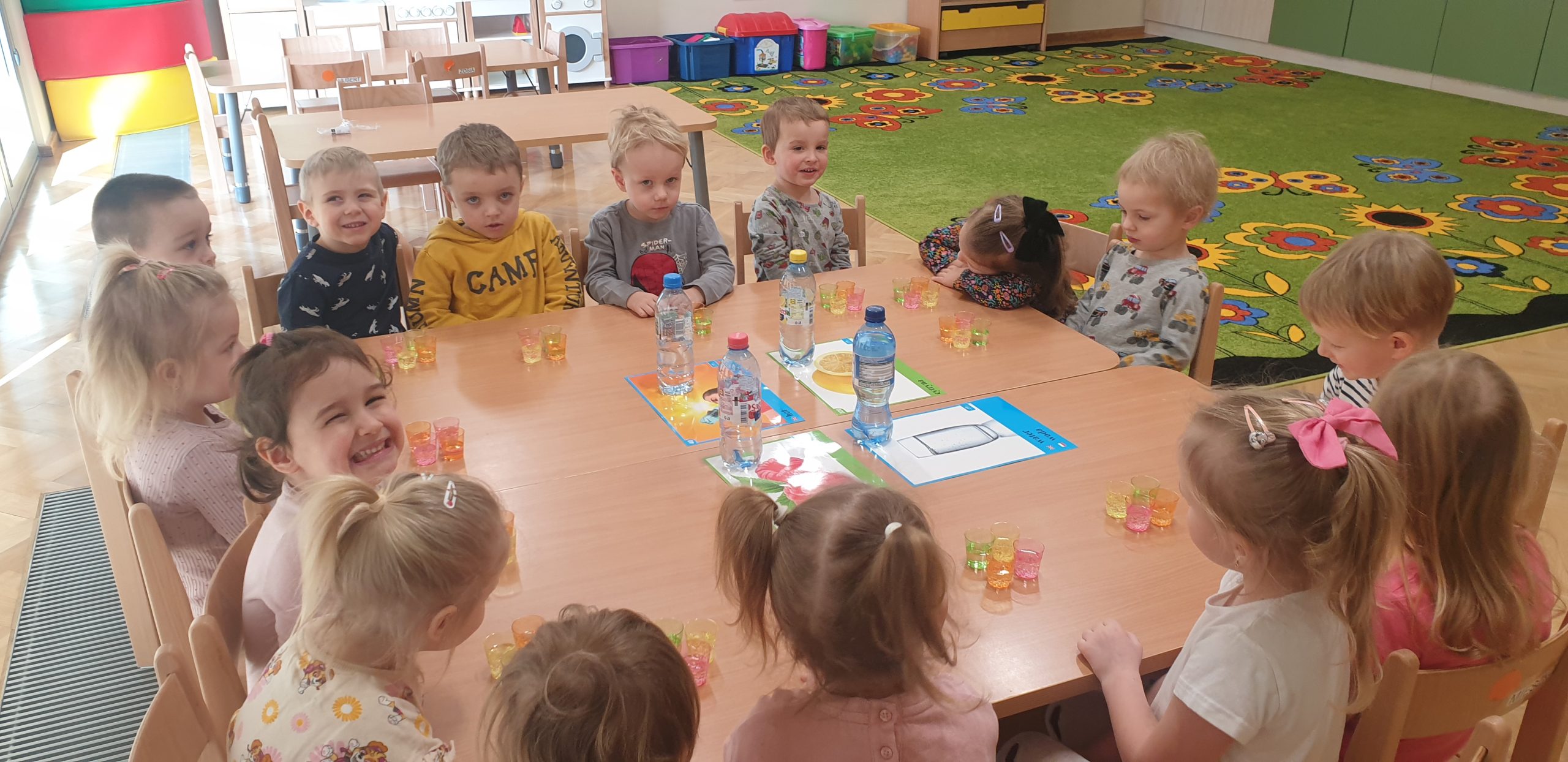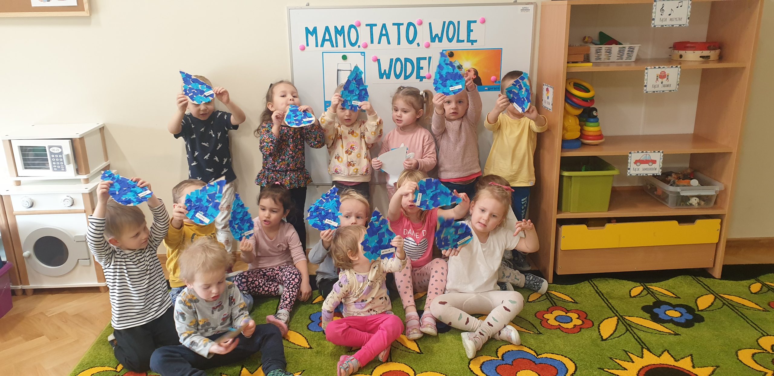 W dniach 11-15 marca realizowaliśmy w naszej grupie Program „Mamo, Tato wolę wodę!”. Dzieci dowiedziały się jak woda krąży po Ziemi, poznały sposoby jak można oszczędzać wodę. Wykonywaliśmy wiele ćwiczeń oddechowych robią wodne bąbelki czy też eksperymenty z wodą. Dzieci wykonały swoje kubeczki na wodę, kropelki wody z niebieskiej bibuły, a także dzięki zmysłowi smaku rozróżniały poprzez degustację różne smaki wody. Bawiliśmy się wspólnie do piosenek o wodzie, a tydzień zakończyliśmy ćwiczeniami gimnastycznymi z butelką wody!