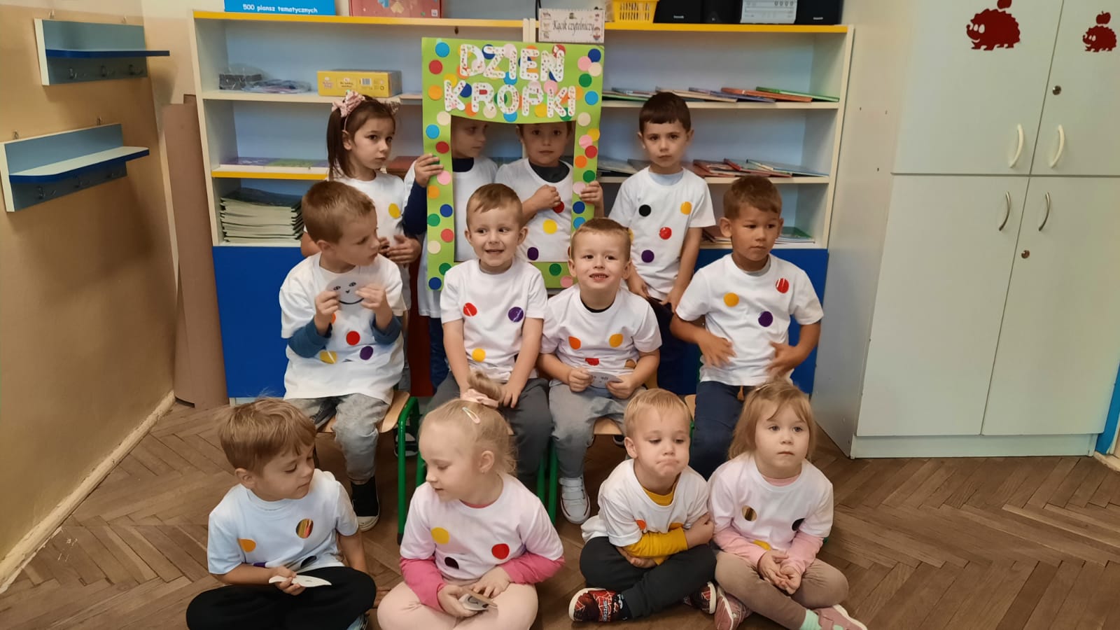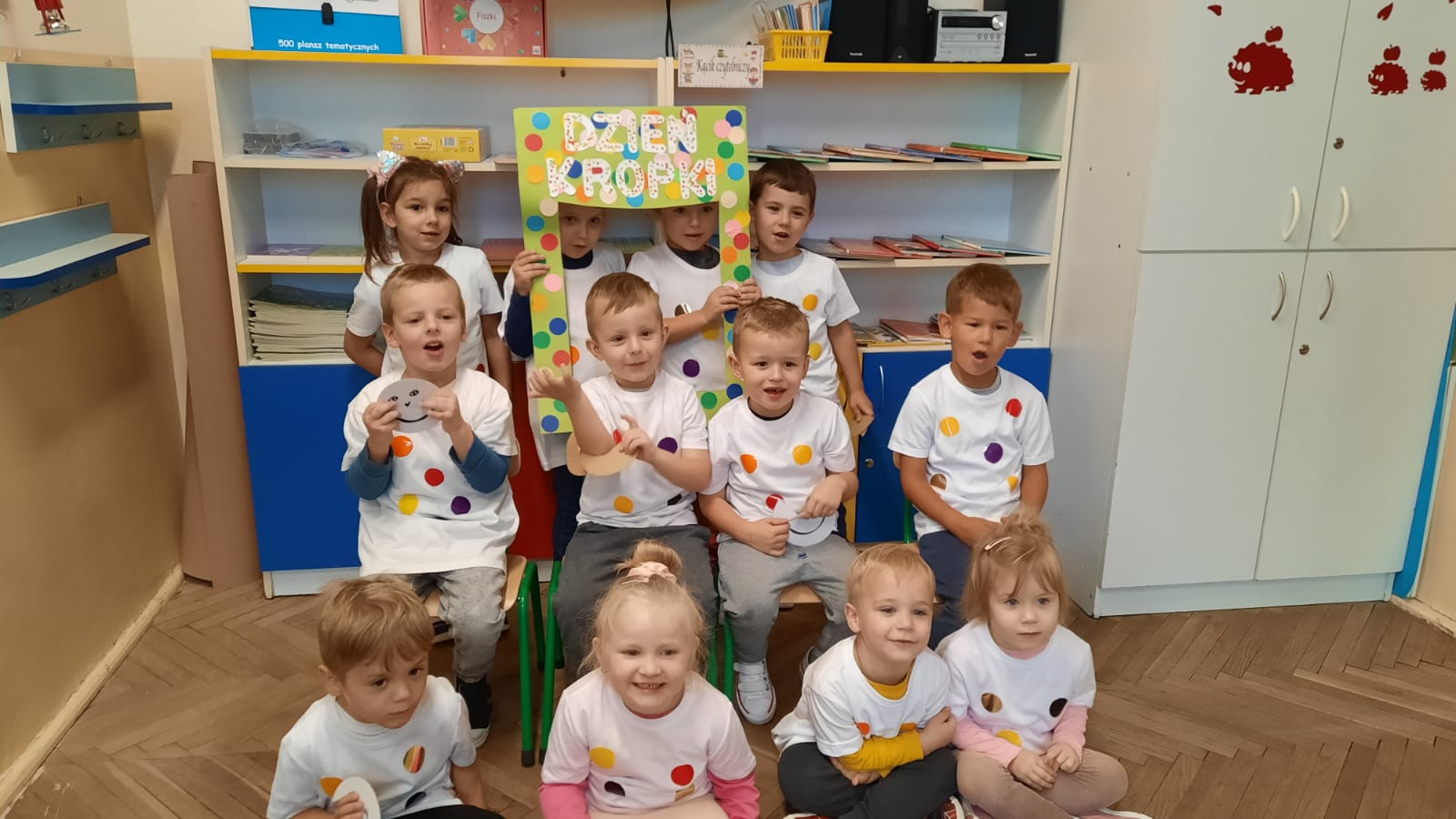 W dniu 15 września 2022 roku w naszej grupie świętowaliśmy Międzynarodowy Dzień Kropki, czyli The Dot Day. Międzynarodowy Dzień Kropki to święto kreatywności, którego inspiracją stała się książka Petera H. Reynoldsa „Kropka”. International Dot Day jest świętem kreatywności, odwagi i zabawy. Jego celem jest pomoc dzieciom w odkrywaniu własnych talentów, poznaniu mocnych stron, wyrabianiu wiary we własne siły… W tym dniu radości i uśmiechu oraz fantazji w stawianiu kolorowych kropek nie zabrakło, bawiliśmy się w szukanie kropki, ustawianie się na kropce, w łapanie kropki. Te zadania bardzo się przedszkolakom podobały, dlatego z ochotą powtórzyły zabawę kilkakrotnie. Na zakończenie wszystkich zabaw zaprosiłyśmy dzieci do „małej” sesji zdjęciowej z ramką w kropki.