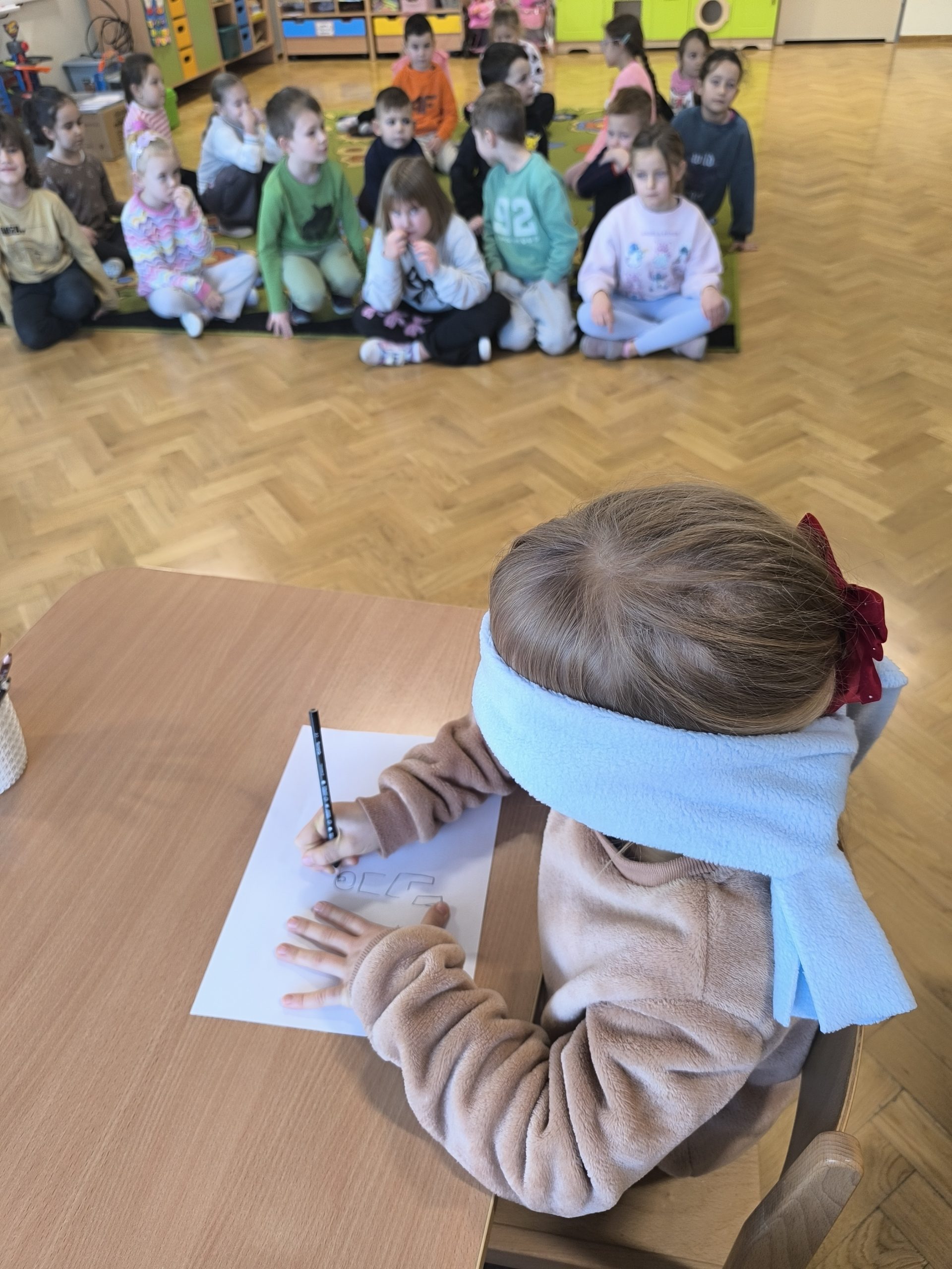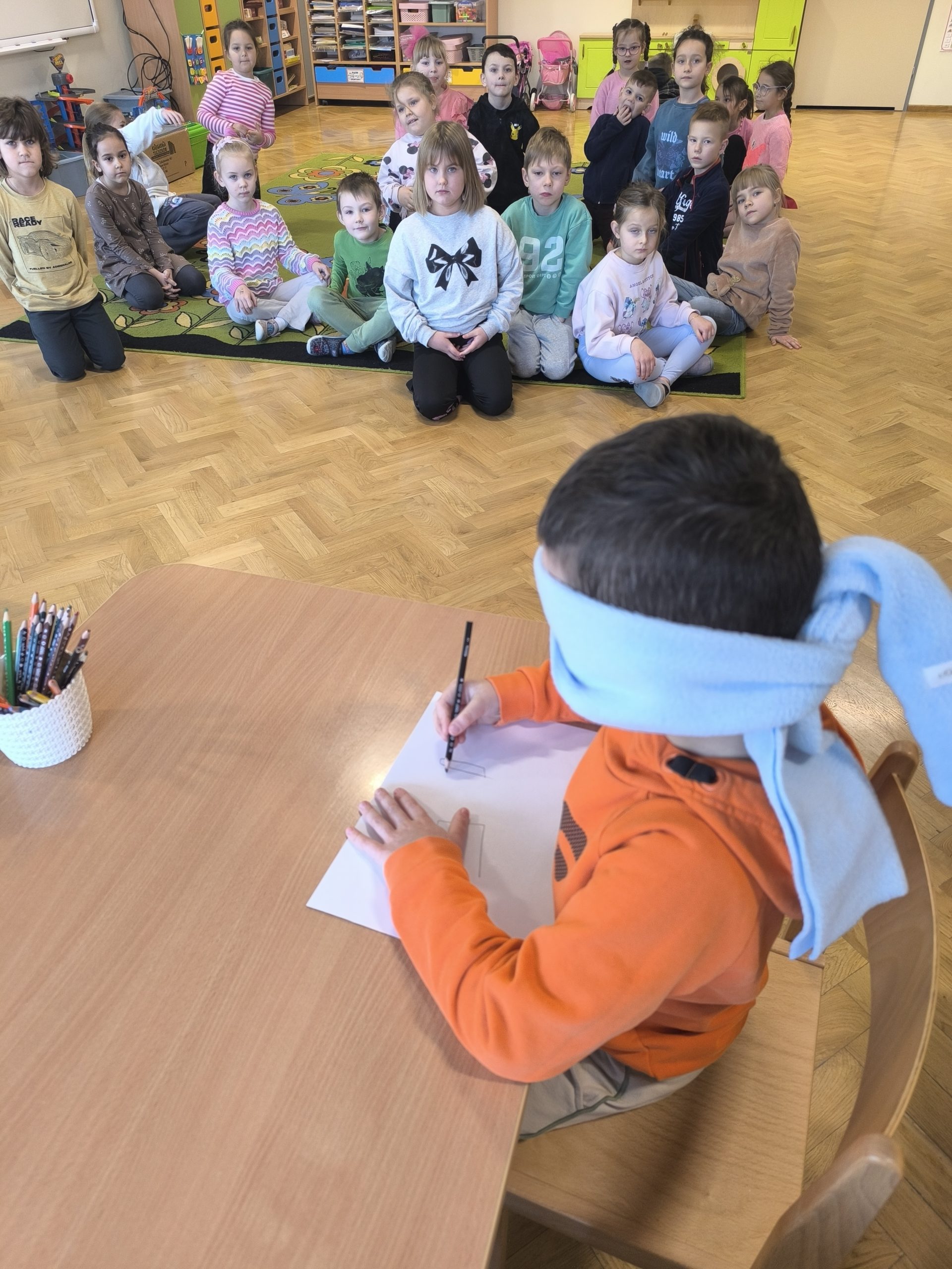 z różnymi niepełnosprawnościami. Przedszkolaki wykonywały proste zadania z zasłoniętymi oczami np. rysowanie, próbowały porozumiewać się bez użycia mowy,