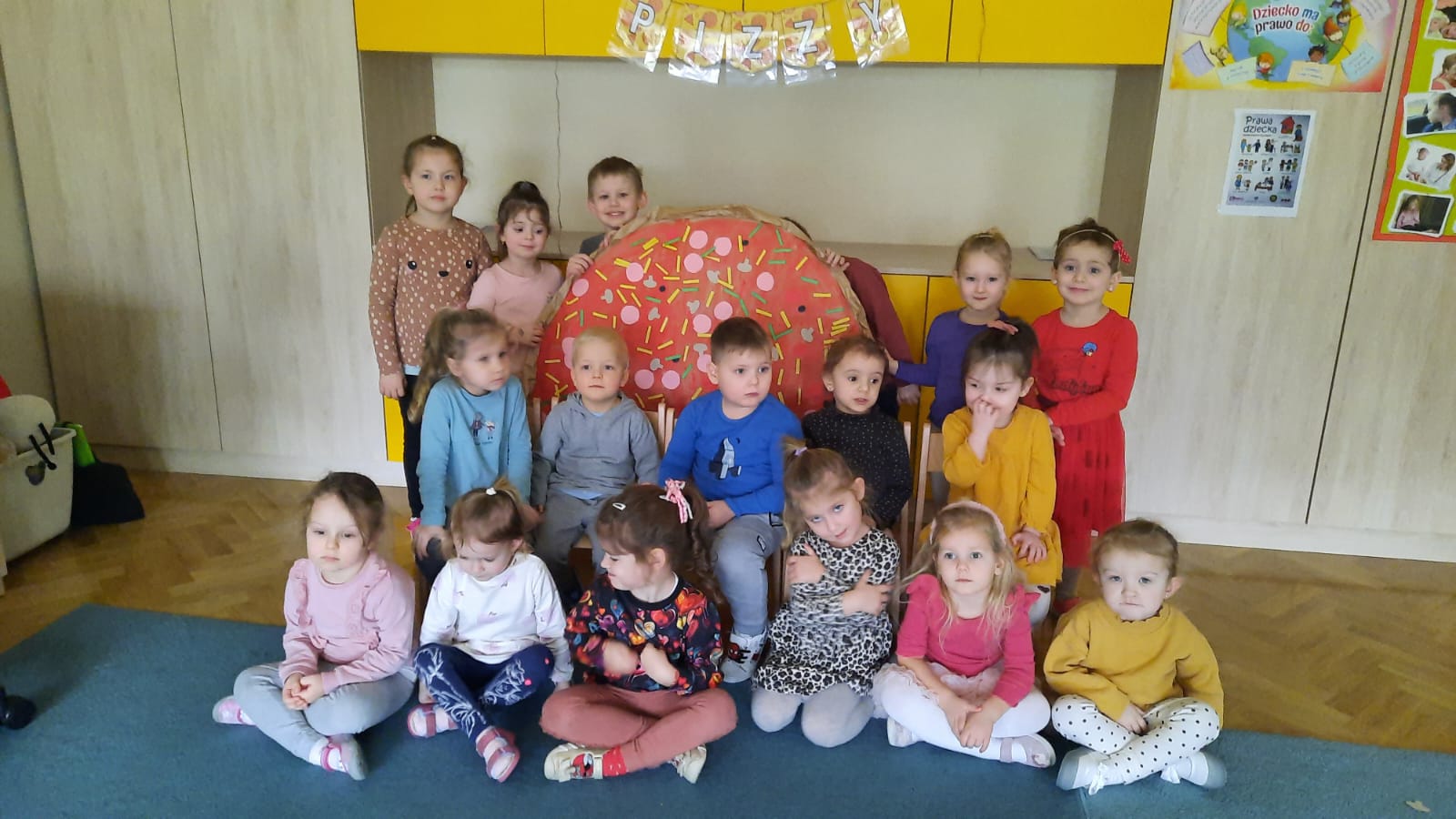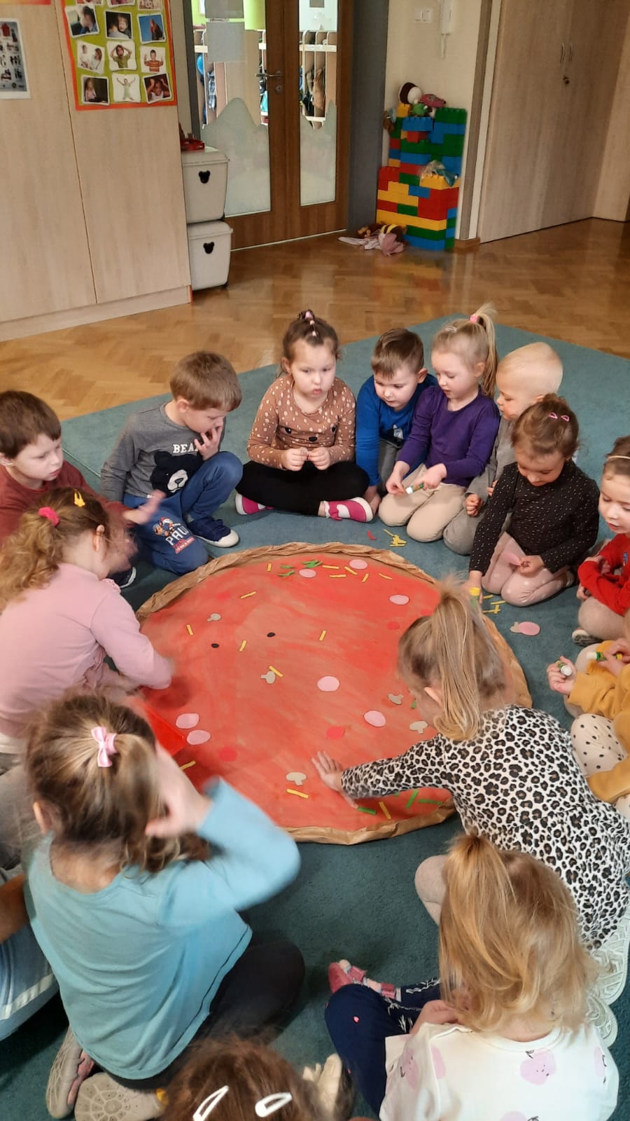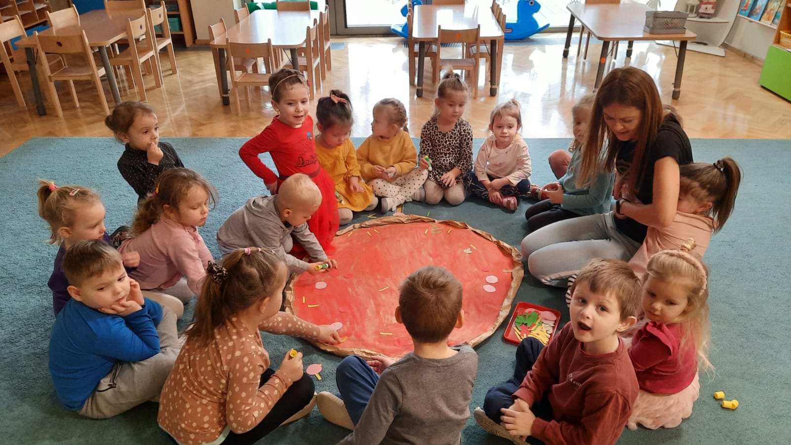 Dnia 9 lutego w grupie Misiów obchodzony był „Międzynarodowy Dzień Pizzy”. Tego dnia sala naszej grupy zamieniła się w prawdziwą, włoską pizzerię. Na zajęciach dzieci miały okazję zobaczyć jak powstaje ten włoski placek i jakich składników potrzeba, aby go przygotować. Poznały historię jego powstania oraz dowiedziały się, z którego kraju pochodzi. Wszystkie dzieci opowiadały jaka jest ich ulubiona pizza i z jakich składników się składa. Misie miały także możliwość stworzenia ogromnej pizzy, używając do tego przeróżnych materiałów. Dzisiejszy dzień upłynął nam bardzo smacznie.