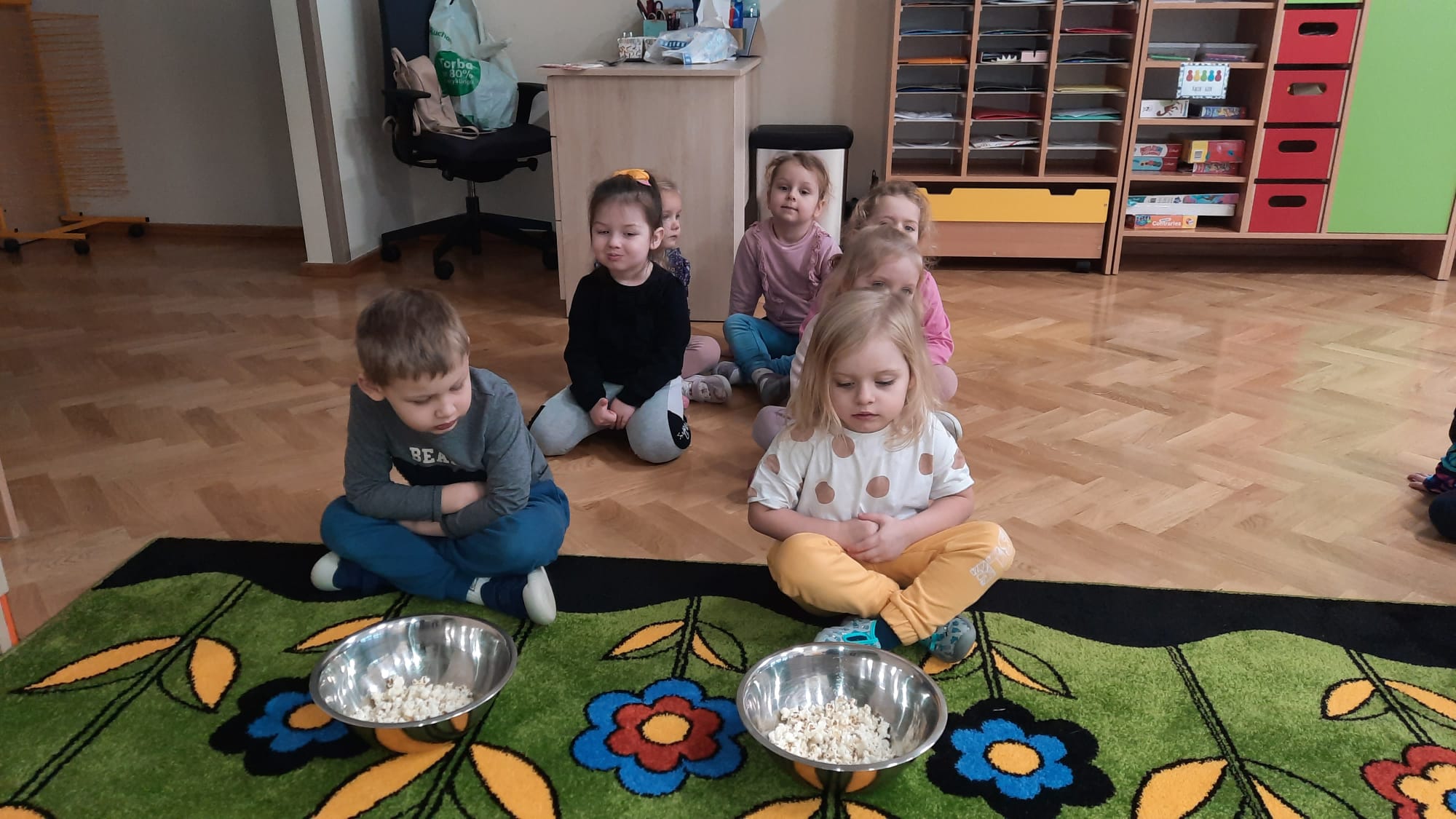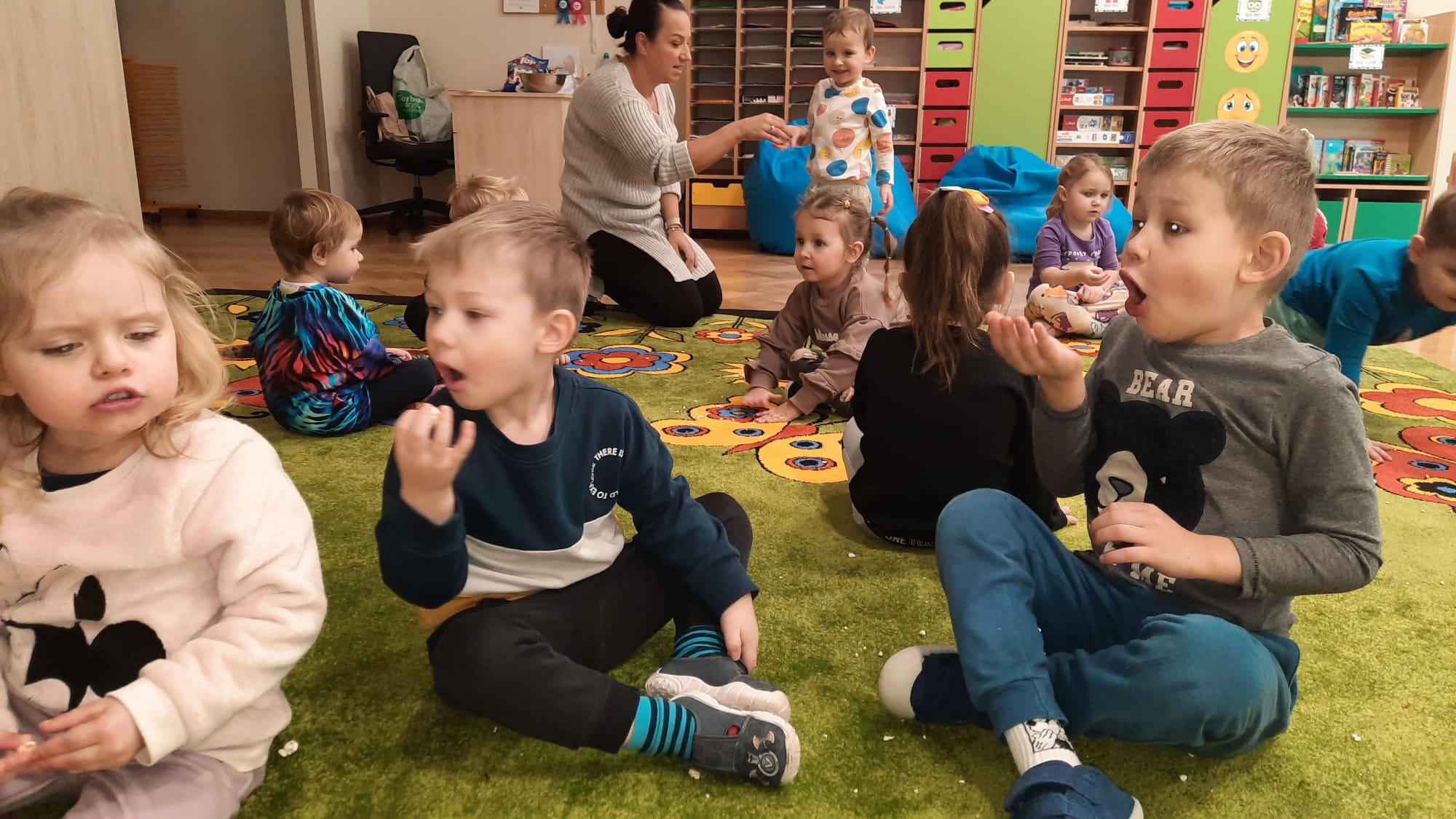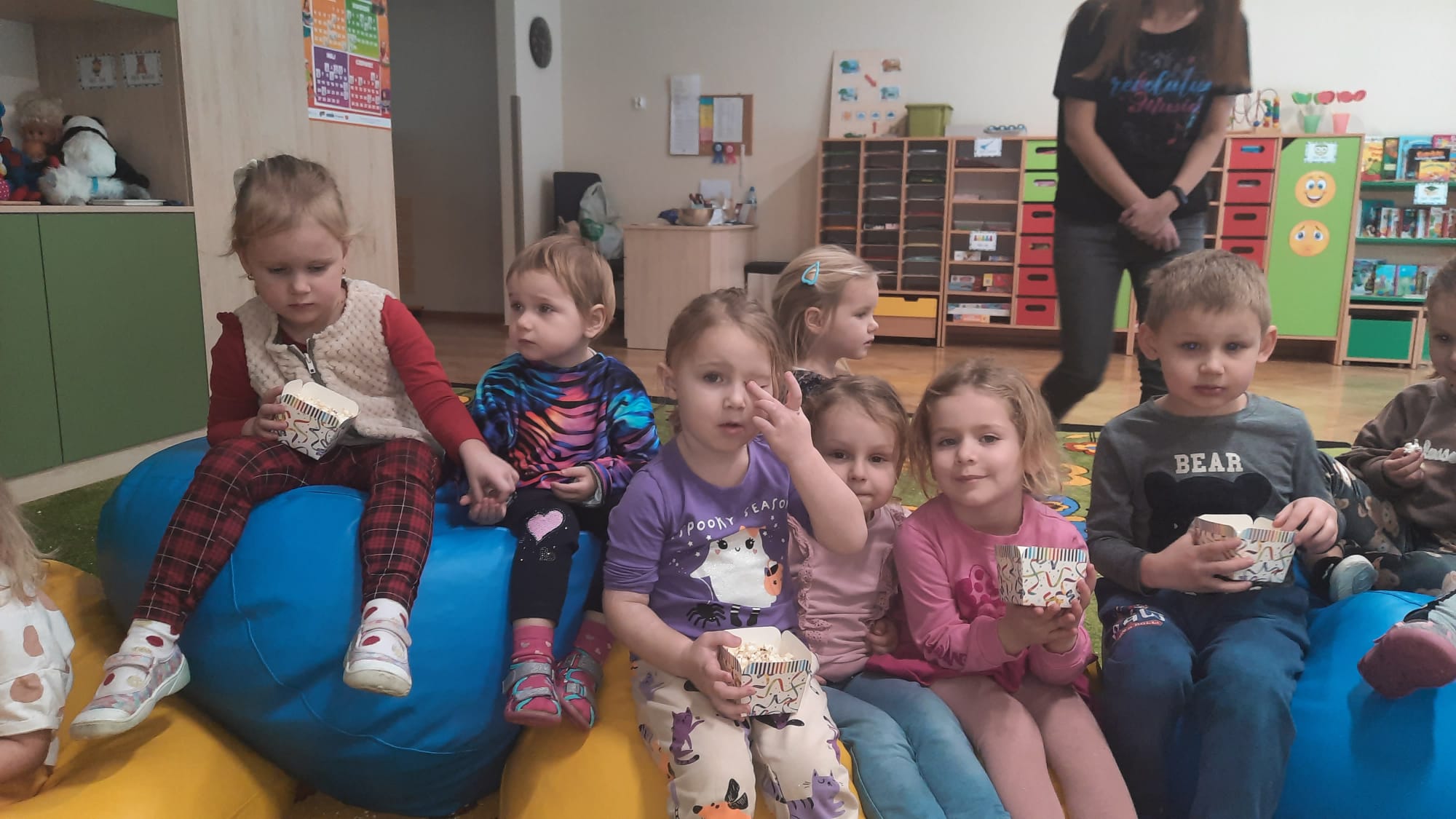 19 stycznia obchodziliśmy w grupie: Misiów i Jeżyków nietypowe święto – Międzynarodowy Dzień Popcornu. To była doskonała okazja do zorganizowania kreatywnych zabaw i aktywności z przysmakiem wszystkich dzieci – popcornem. Dzieci dowiedziały się, z czego powstaje popcorn i jak go przygotować. Oglądały kolbę, ziarna kukurydzy, a także obserwowały proces powstawania popcornu. Były zabawy ruchowe, matematyczne z popcornem, praca plastyczna „Popcorn w pudełku” i oczywiście seans kinowy z tą pyszną przekąską. Przedszkolaki aktywnie uczestniczyły w zawodach na czas w układaniu popcornu po linii, w „popcornowym dmuchaniu” – w utrzymaniu jak najdłużej ziarna popcornu w powietrzu, w przenoszeniu popcornu na łyżce, a także w „deszczowym popcornie”. To był dzień pełen radości, zabawy i śmiechu.