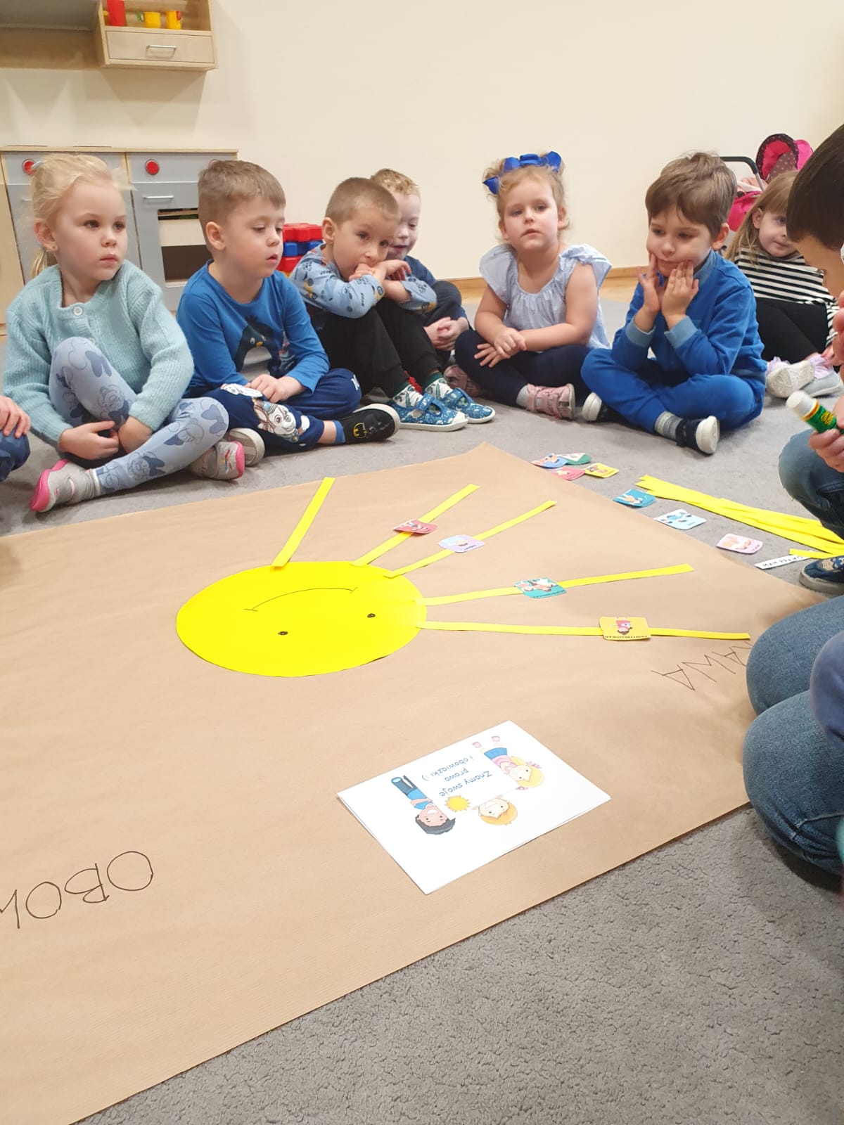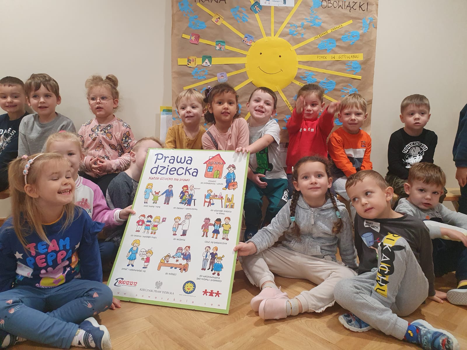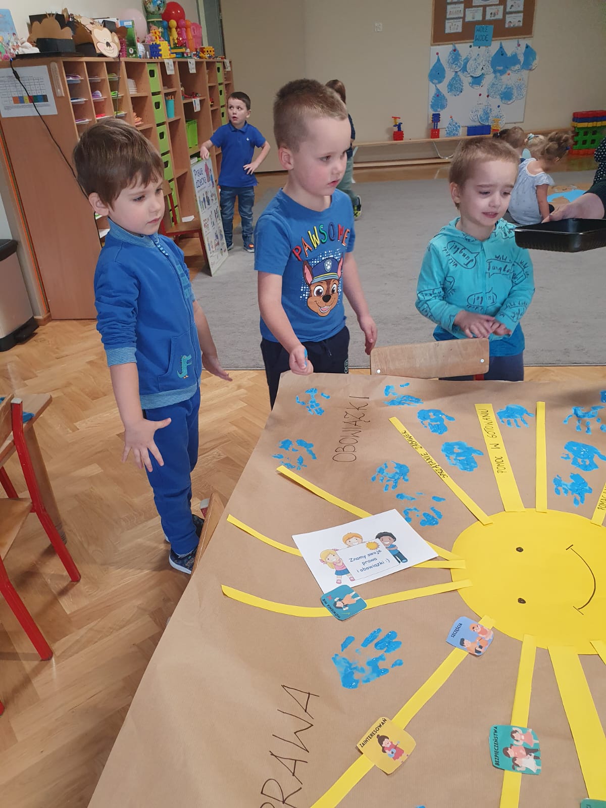 20 listopada w naszej grupie dzieci uczestniczyły w zajęciach, które miały na celu zapoznanie i wyjaśnienie PRAW DZIECKA i do kogo trzeba się zwrócić gdy są one łamane. Wspólnie stworzyliśmy plakat pt: „ Nasze Prawa i Obowiązki” i odbiliśmy niebieskie rączki na znak ich znajomości i deklaracji przestrzegania obowiązków w domu i przedszkolu.