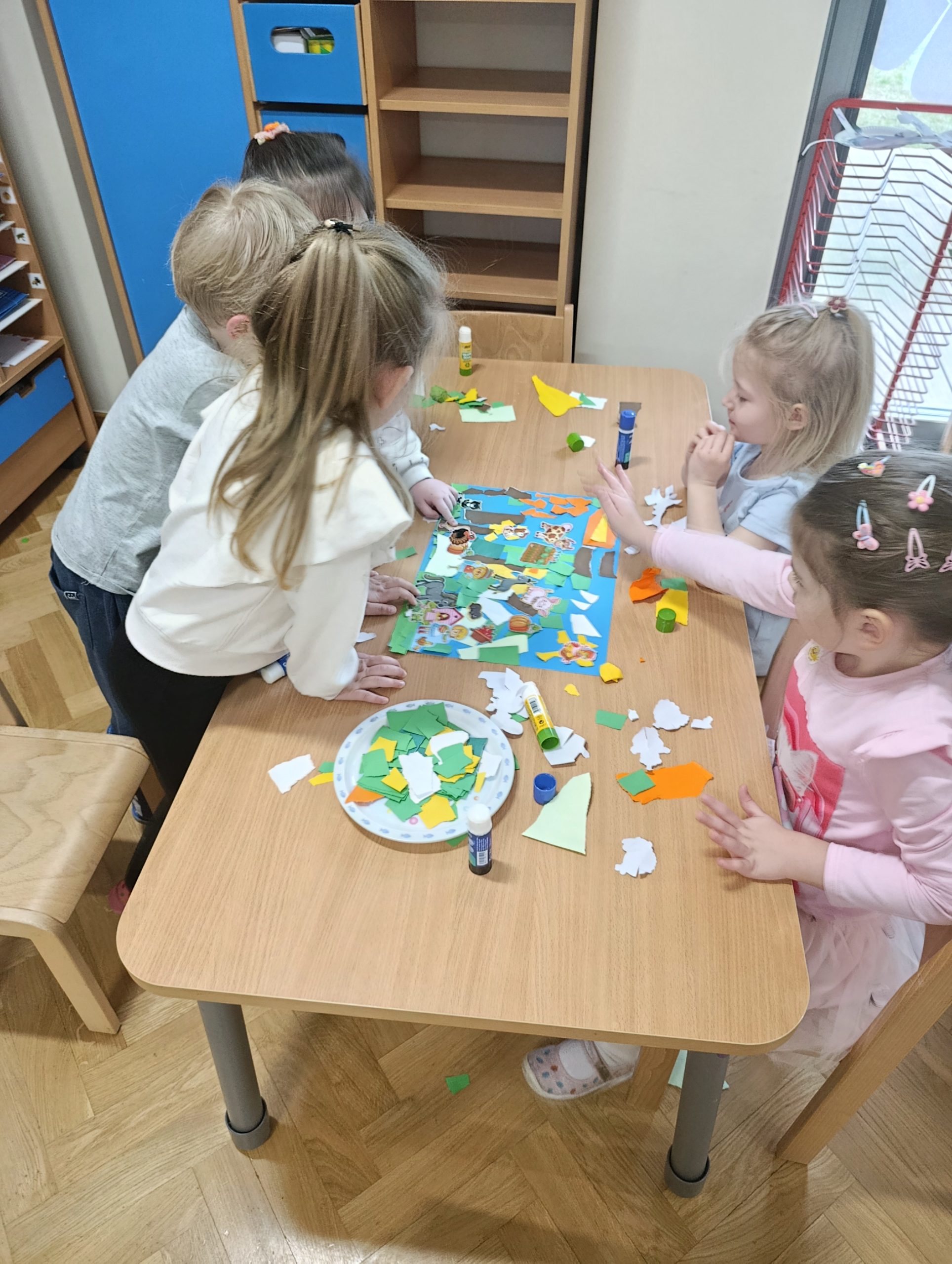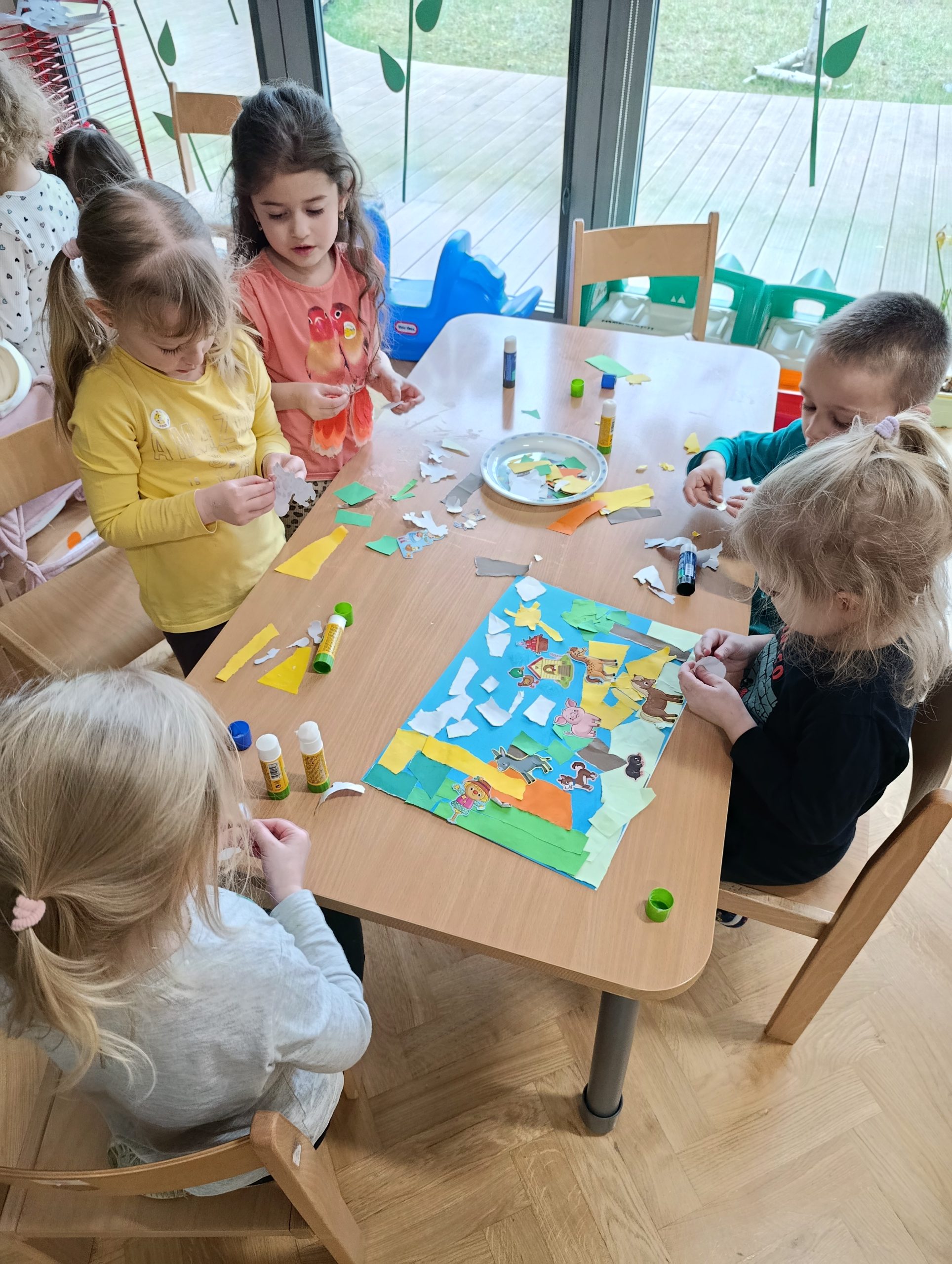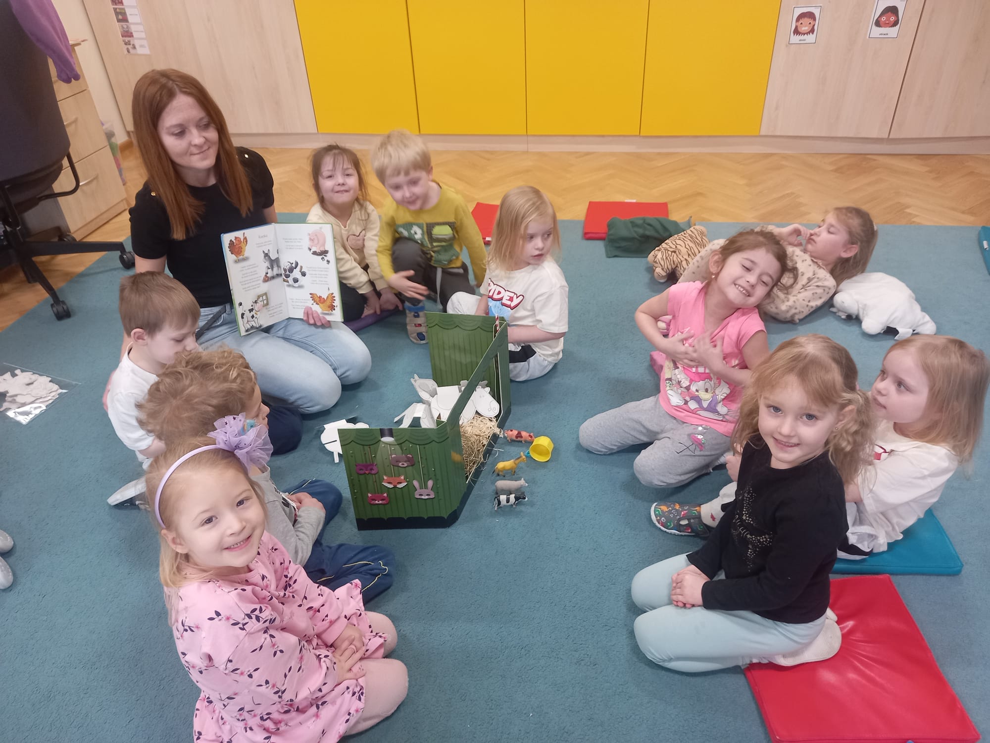 W czwartym tygodniu marca motywem przewodnim na zajęciach w grupie Misiów były zwierzęta mieszkające na wsi. Dzieci miały okazję nie tylko poznać różne zwierzęta wiejskie, ale także zrozumieć, jakie korzyści płyną z ich hodowli. Misie nazywały poszczególne zwierzęta gospodarskie, łączyły je w rodziny, a przy pomocy specjalnej aplikacji rozpoznawały je po brzmieniach ich głosów. Naśladowanie odgłosów i chodu zwierząt okazało się świetnym sposobem na rozwijanie wyobraźni oraz umiejętności motorycznych. Nie zabrakło również matematycznych aktywności, dzięki którym dzieci rozwijały umiejętności liczenia oraz logicznego myślenia. Teatrzyk sylwet pt.: „Kwoka” Jana Brzechwy przypomniał przedszkolakom nie tylko o zasadach dobrego zachowania, ale także stanowił wprowadzenie do zajęć matematycznych, w trakcie których dzieci rozwijały umiejętność przeliczania elementów w zakresie 6. Podczas zajęć plastycznych Misie stworzyły wiejską zagrodę oraz powstały biało-czarne krówki z papierowych talerzyków. Dzieci miały okazję pracować w grupach, co sprzyjało współpracy i integracji. Z radością brały również udział w zabawach muzyczno-ruchowych, które doskonale uzupełniały nasze zajęcia.