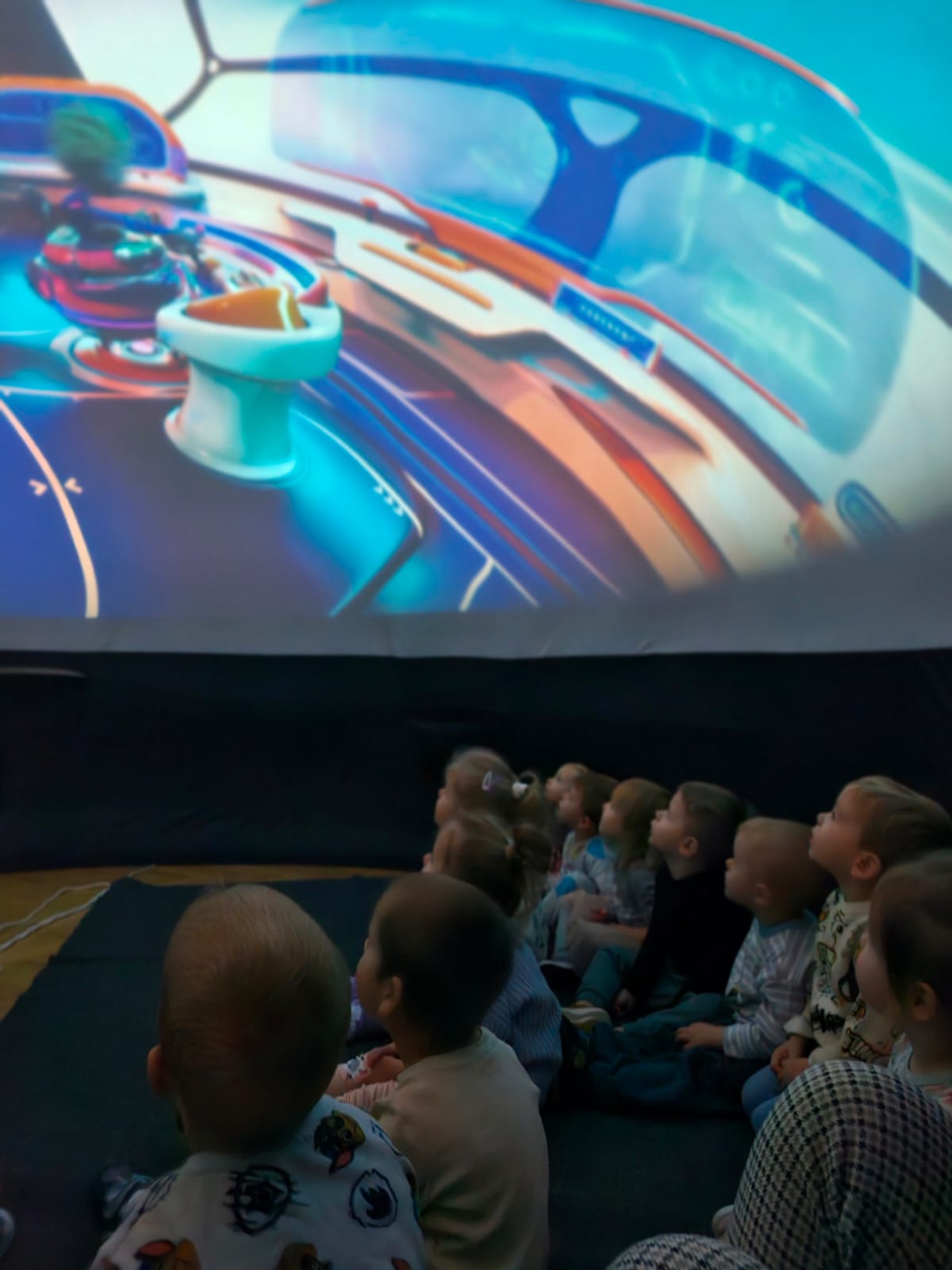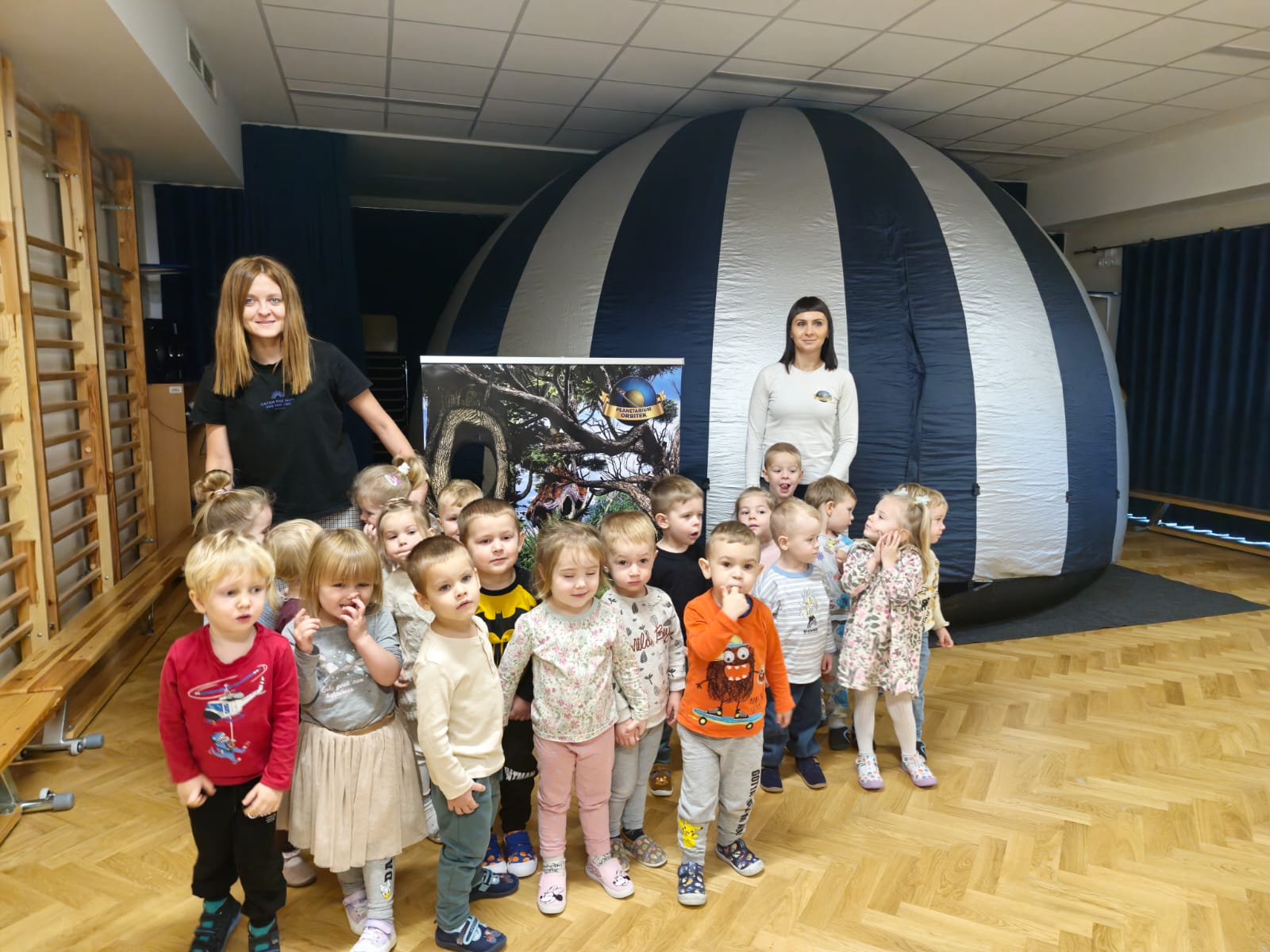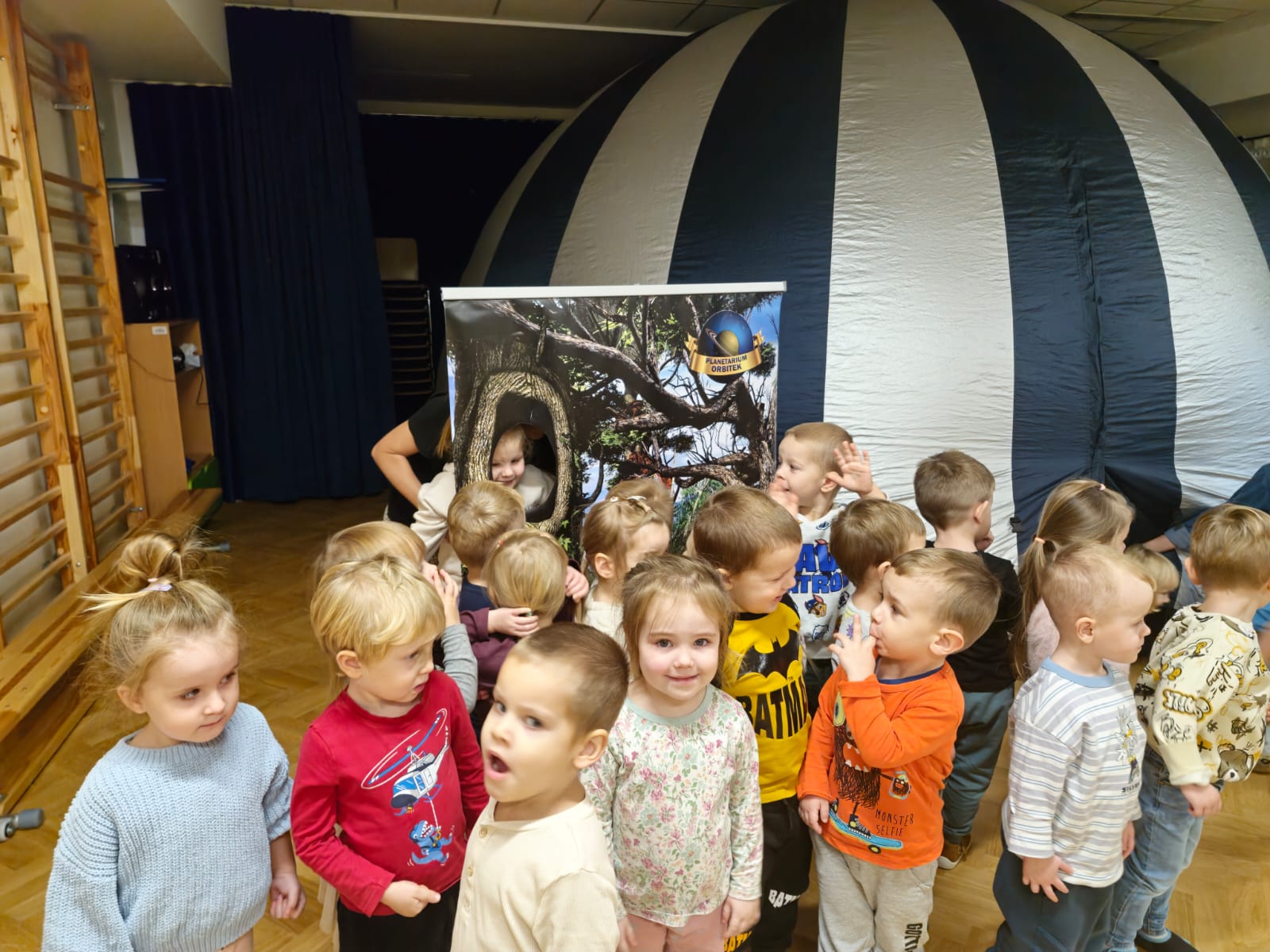 W naszym przedszkolu odbyła się niezwykła podróż w kosmos! Dzięki Mobilnemu Planetarium „Orbitek” dzieci wzięły udział w interaktywnym seansie pt. „Misja Zielone”, podczas którego pomagały kosmicznym przyjaciołom – Imani, Aki i Johnowi – uratować ich ukochany las. Podczas interaktywnego seansu dzieci odkryły, jak ważna jest przyroda wokół nas. Podczas seansu mali odkrywcy dowiedzieli się: czego rośliny potrzebują do życia, dlaczego naturalne siedliska są tak ważne dla wszystkich istot, jak wspólne działania mogą zmieniać świat na lepsze.