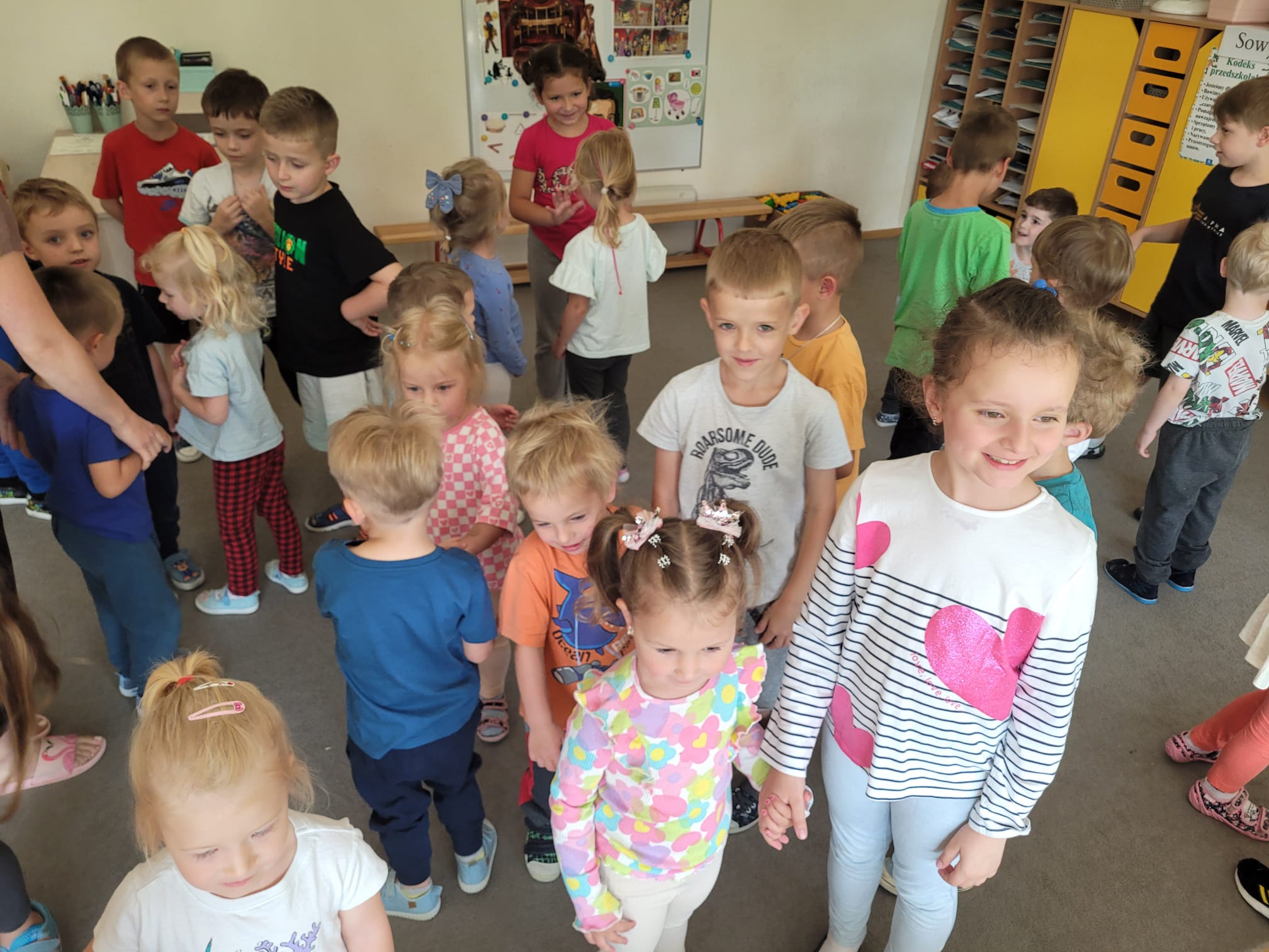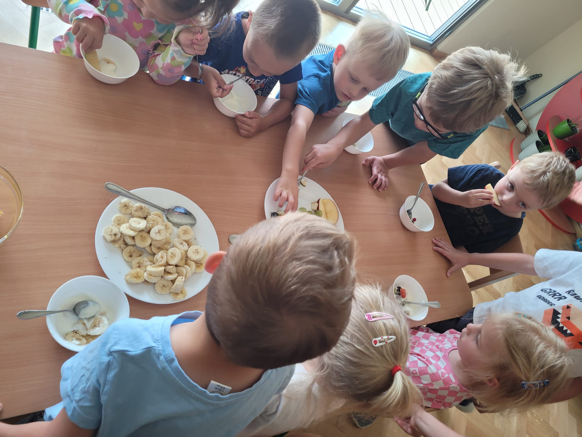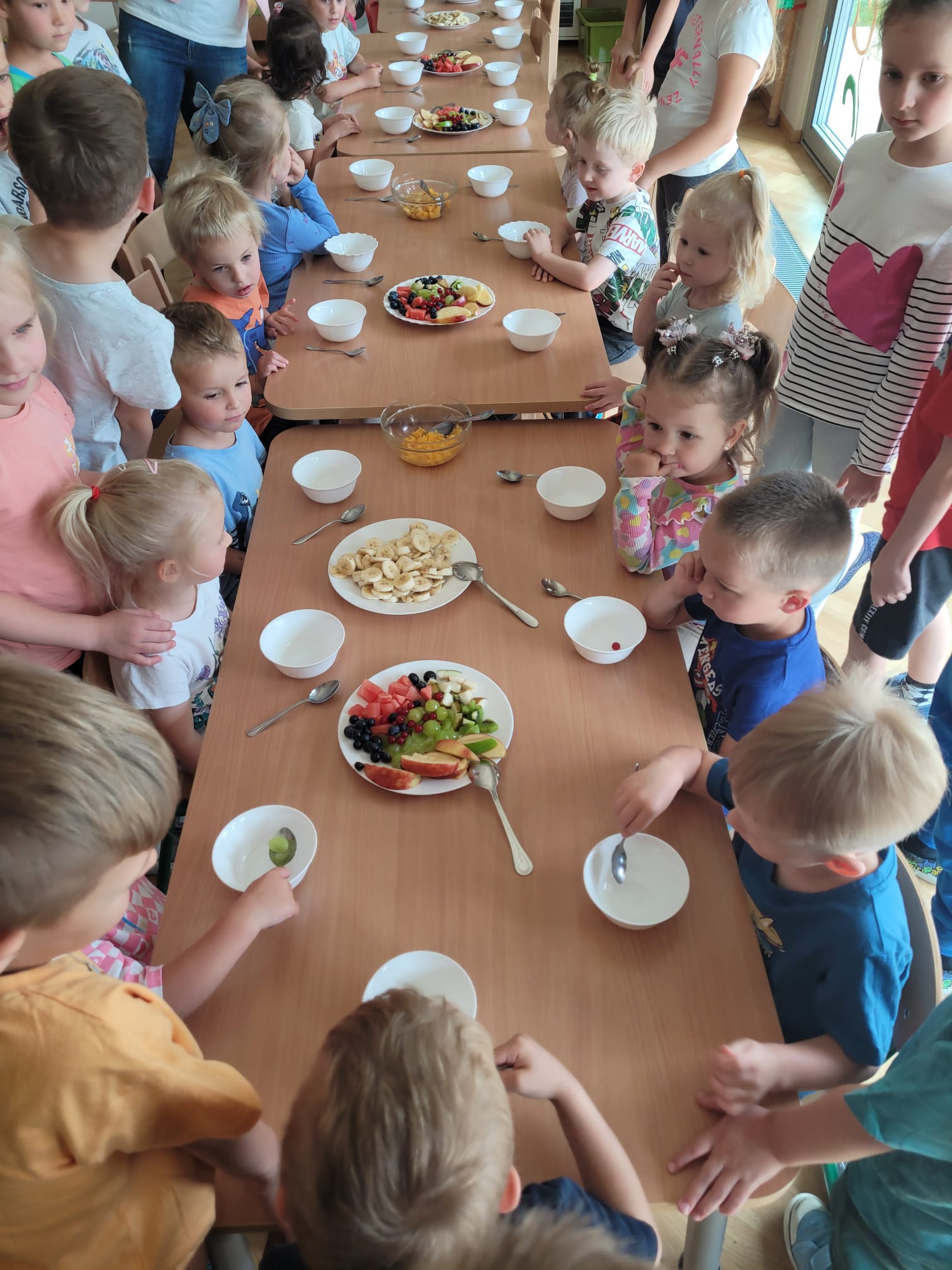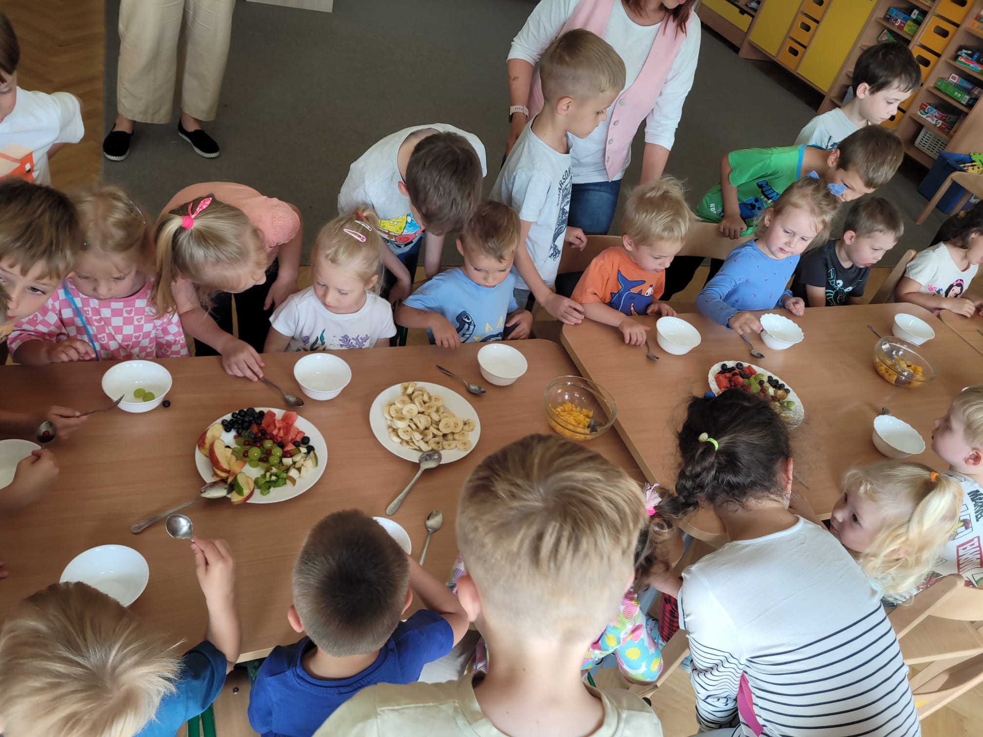 W ramach projektu „Gimnastyka na śniadanie oraz zdrowe odżywianie” dzieci z grupy „Sowy” przygotowały owocowy poczęstunek dla „Jeżyków”. Każdy starszak zaopiekował się swoim młodszym kolegom, pomógł w nałożeniu do miseczki ulubionych owoców, a także służył pomocą w razie dokładki – a było ich bardzo dużo!