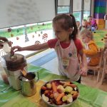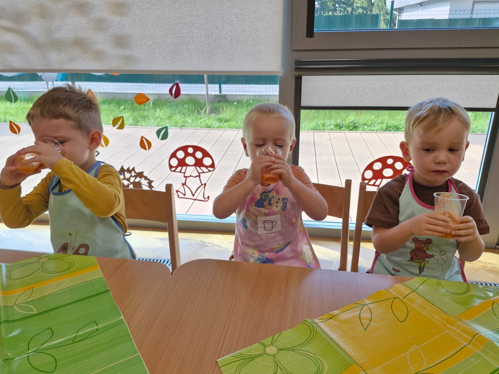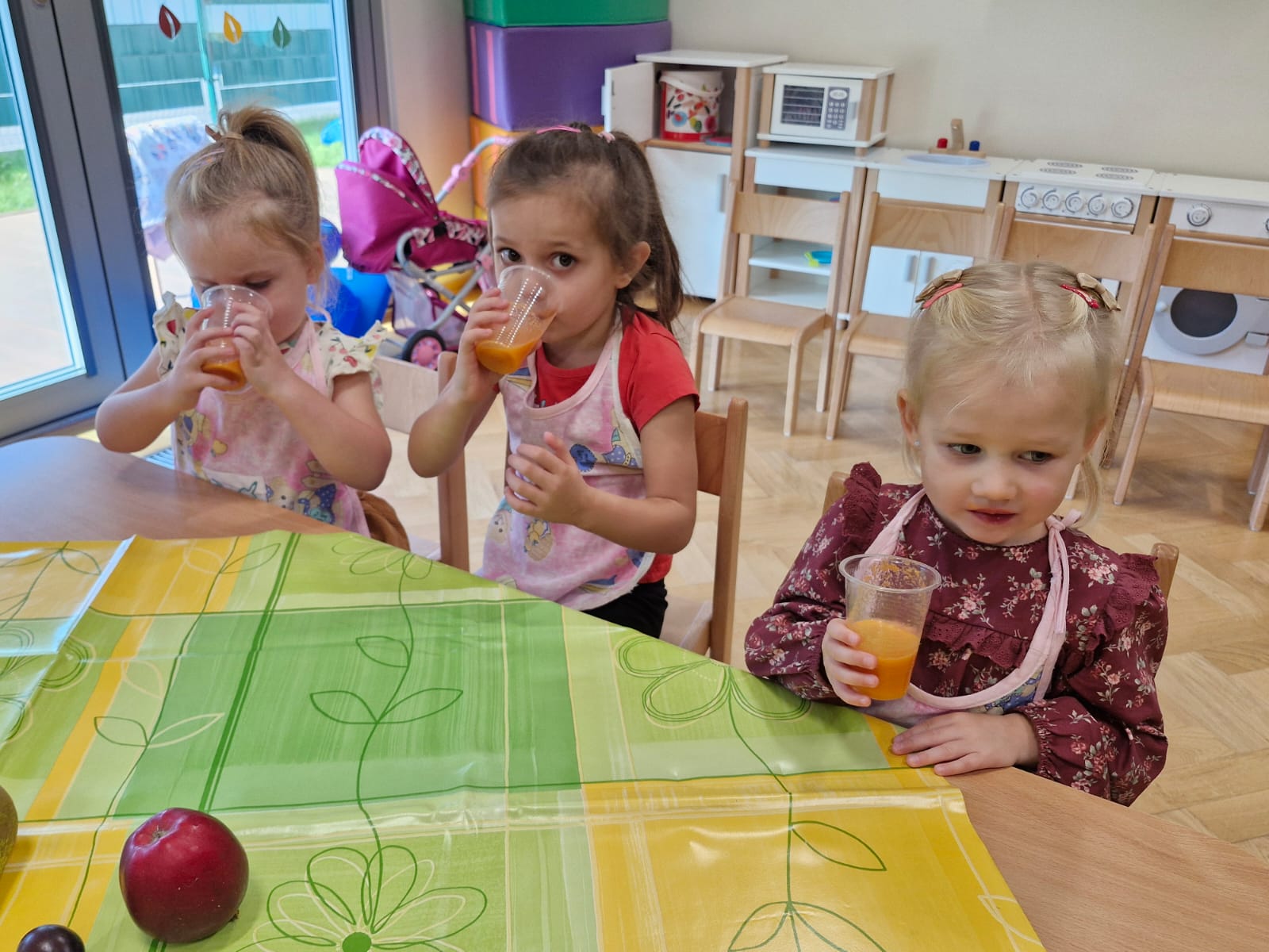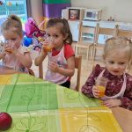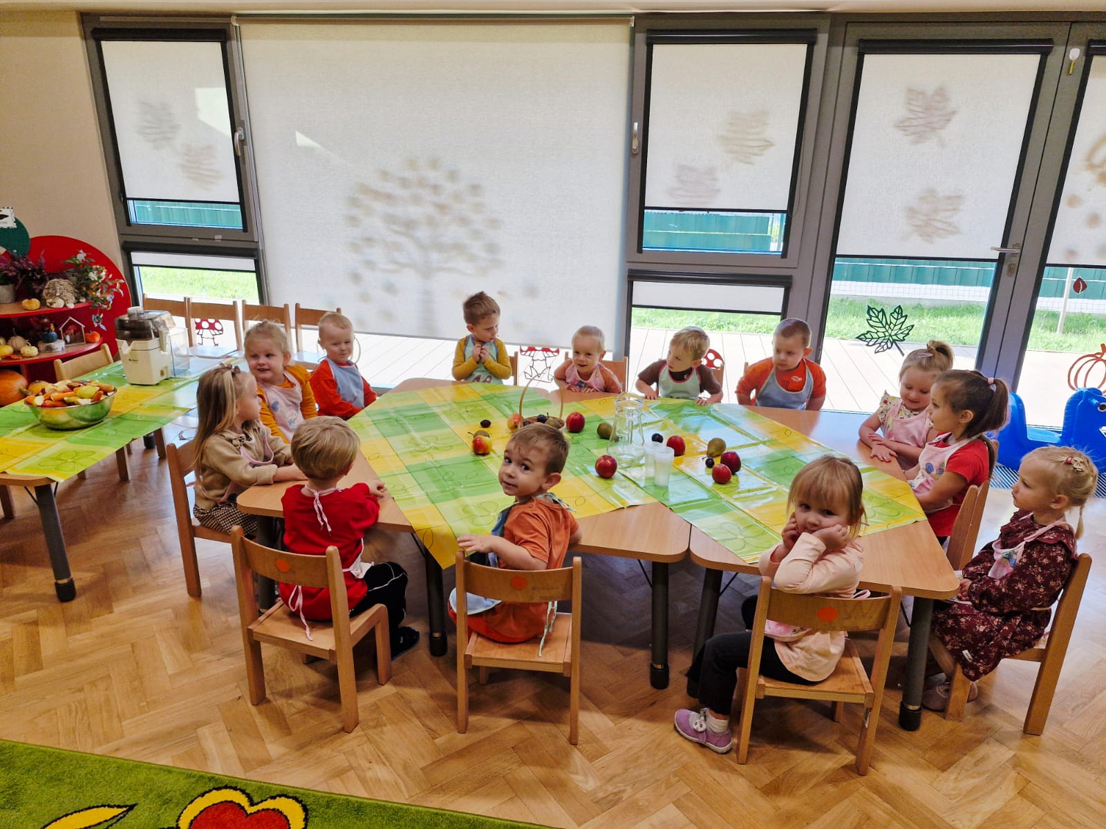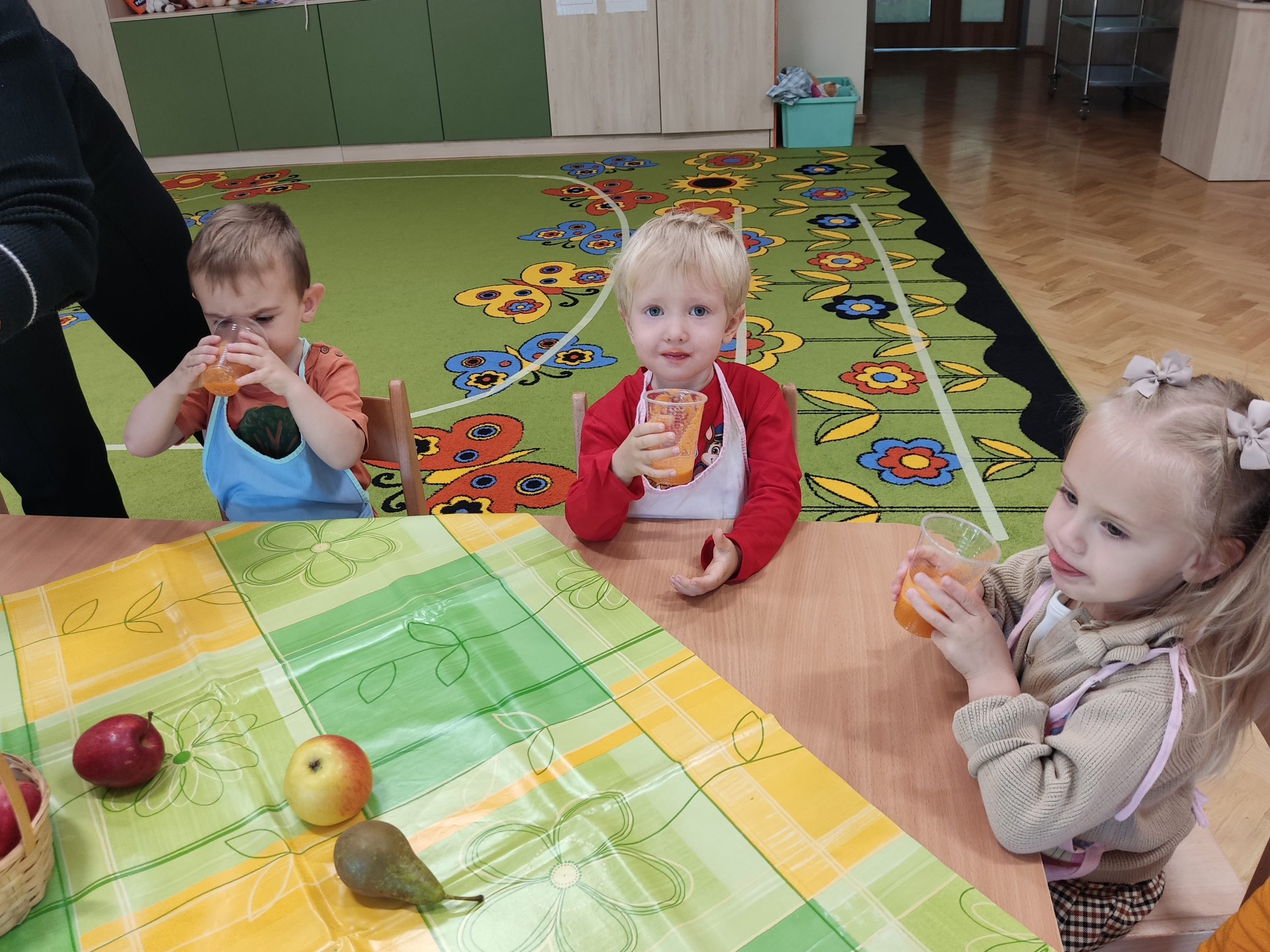 Na początku zajęć dzieci rozpoznawały owoce przy pomocy zmysłów smaku i węchu. Wspólnie zdecydowaliśmy, które składniki najlepiej sprawdzą się w naszym soku – wybór padł na jabłka, śliwki, gruszki i marchewki. Zanim jednak rozpoczęliśmy pracę, Jeżyki zapoznały się