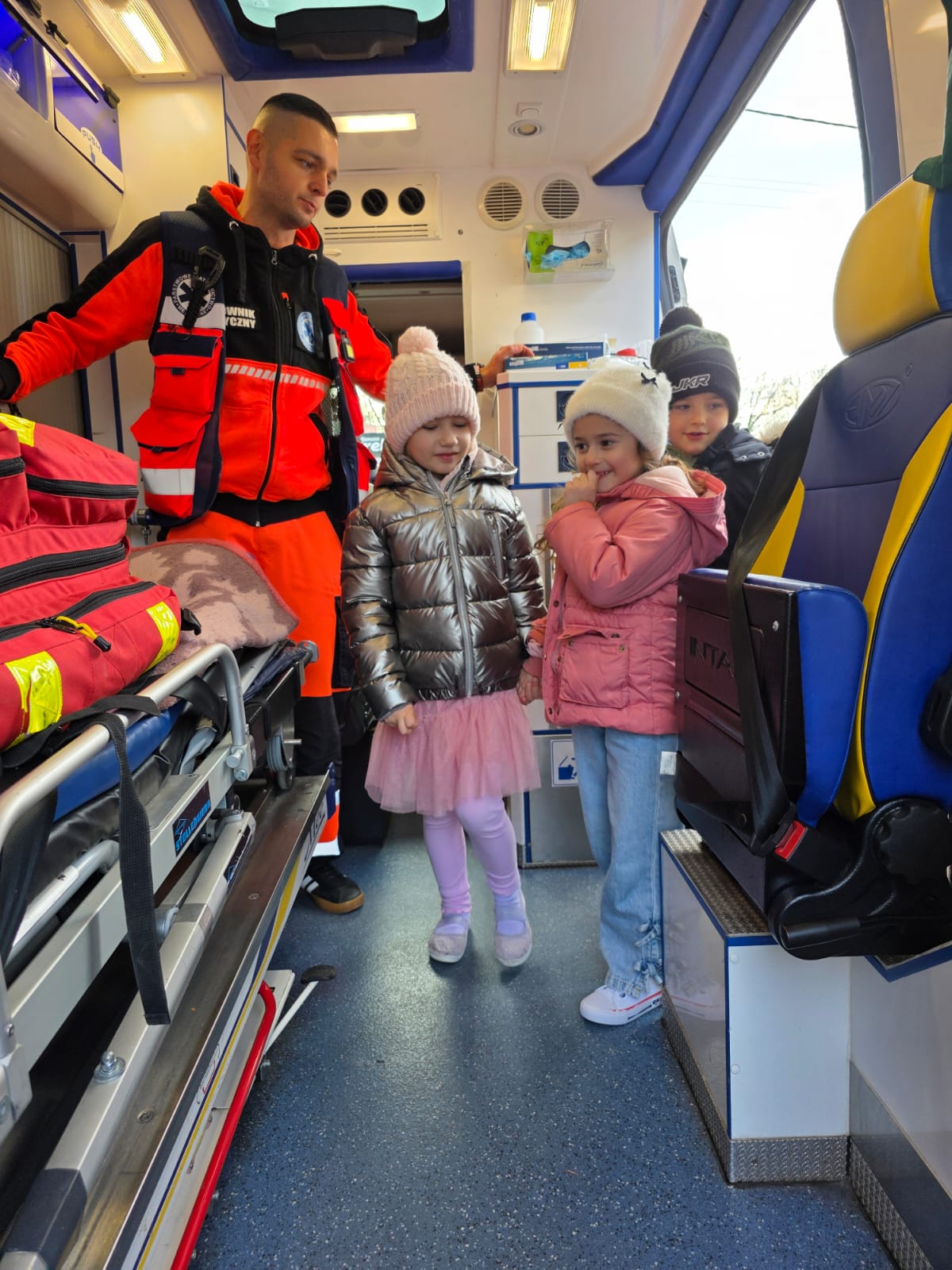 Tato naszego Tymona T. przeprowadził ciekawe zajęcia z zakresu udzielania pierwszej pomocy przedmedycznej. Dzieci poznały na czym polega praca ratownika medycznego, chętne dzieci uczyły się udzielać pomocy na fantomie a na koniec poznały wyposażenie karetki.