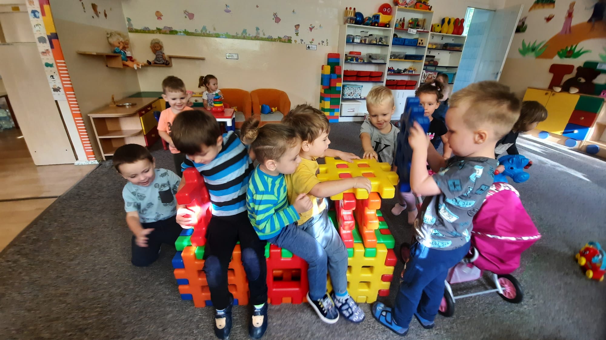Pierwsze dni w przedszkolu, czasami tygodnie, to sytuacja wzbudzająca silne emocje w całej rodzinie. Z dnia na dzień zostaje wprowadzone w nieznany świat: nowe otoczenie, przestrzeń, zwyczaje. Dlatego dołożyliśmy wszelkich starań aby trudne chwile rozstania i minuty wypełnione tęsknotą szybko ustąpiły miejsca radosnej zabawie.