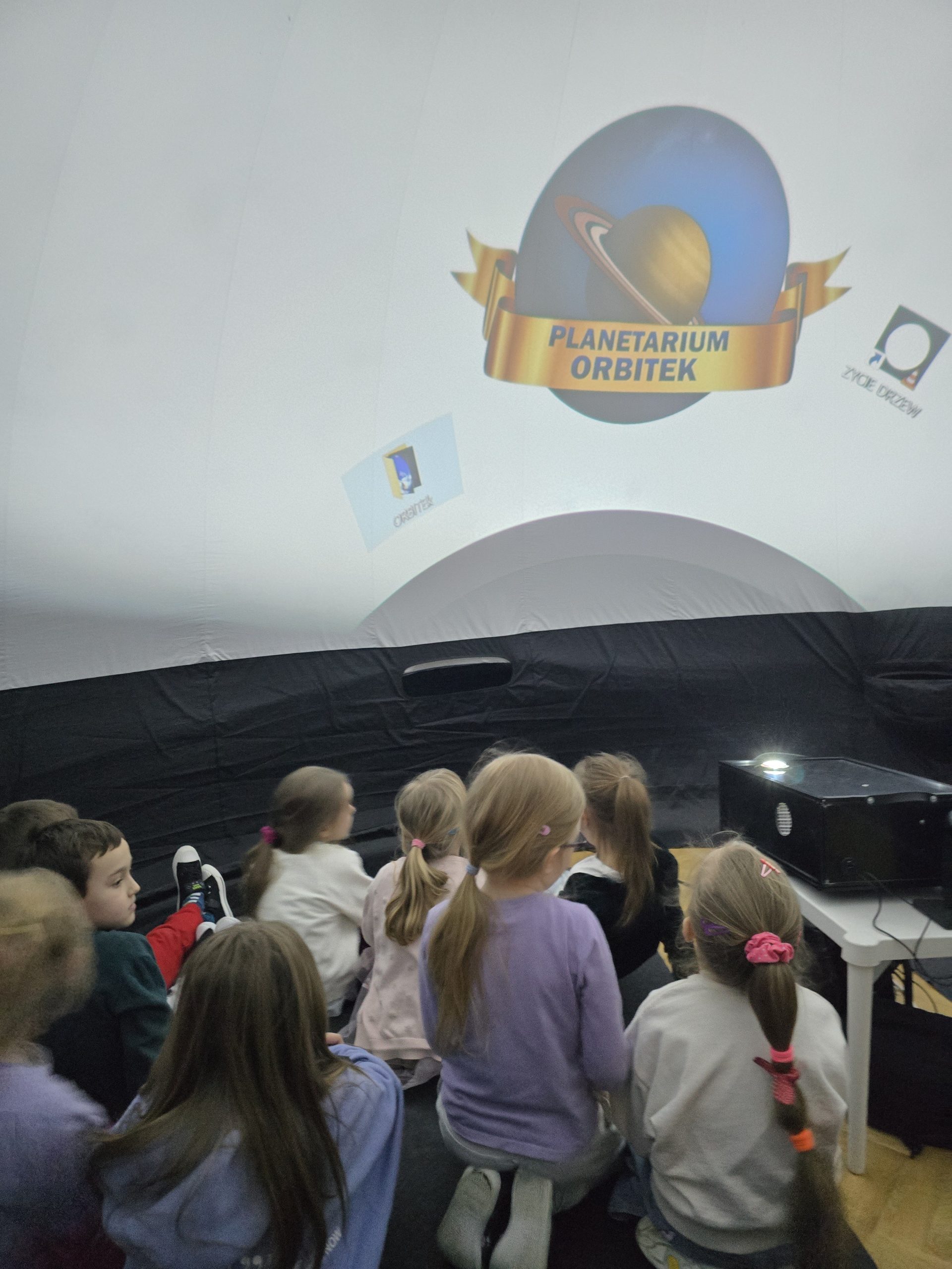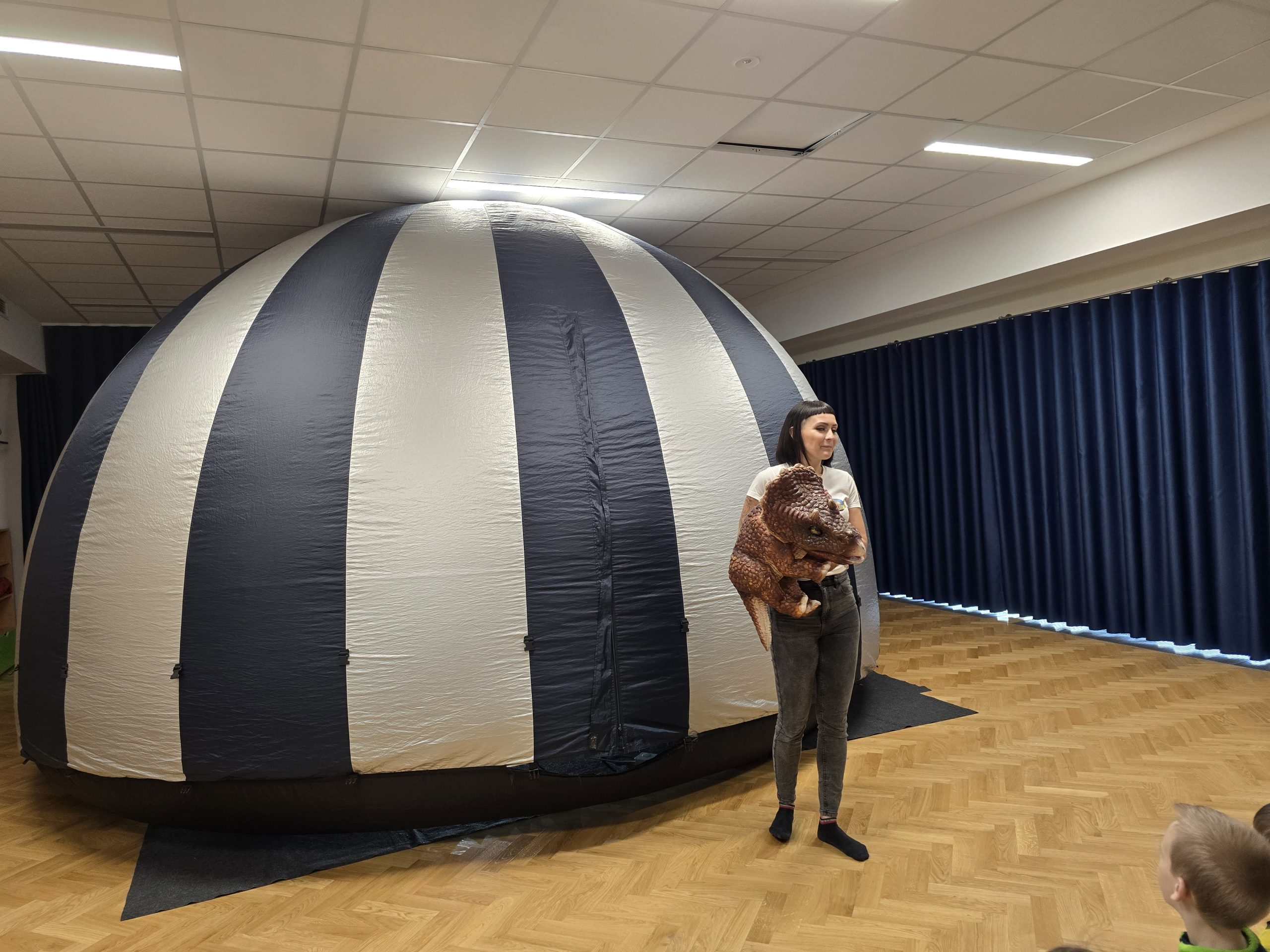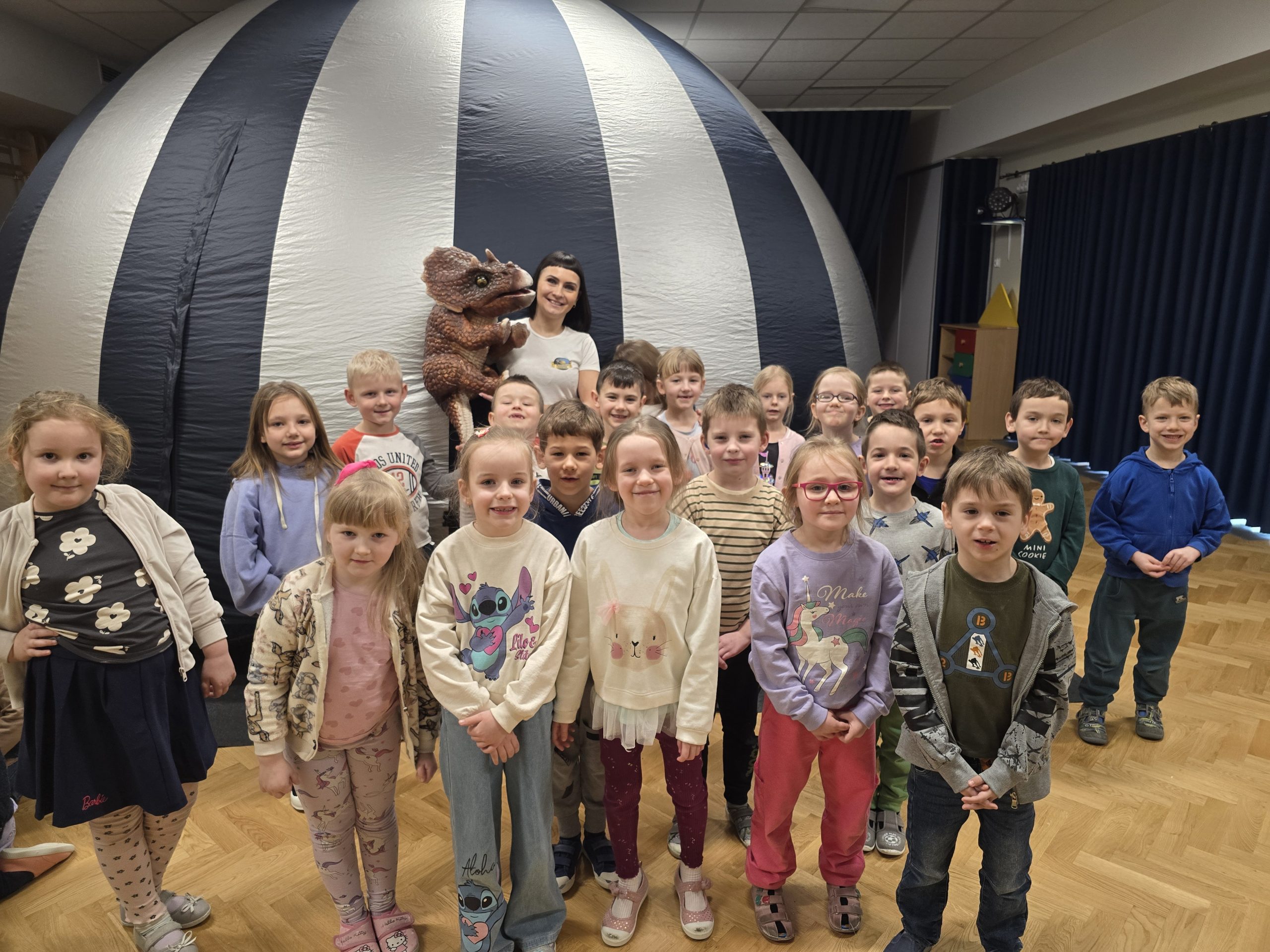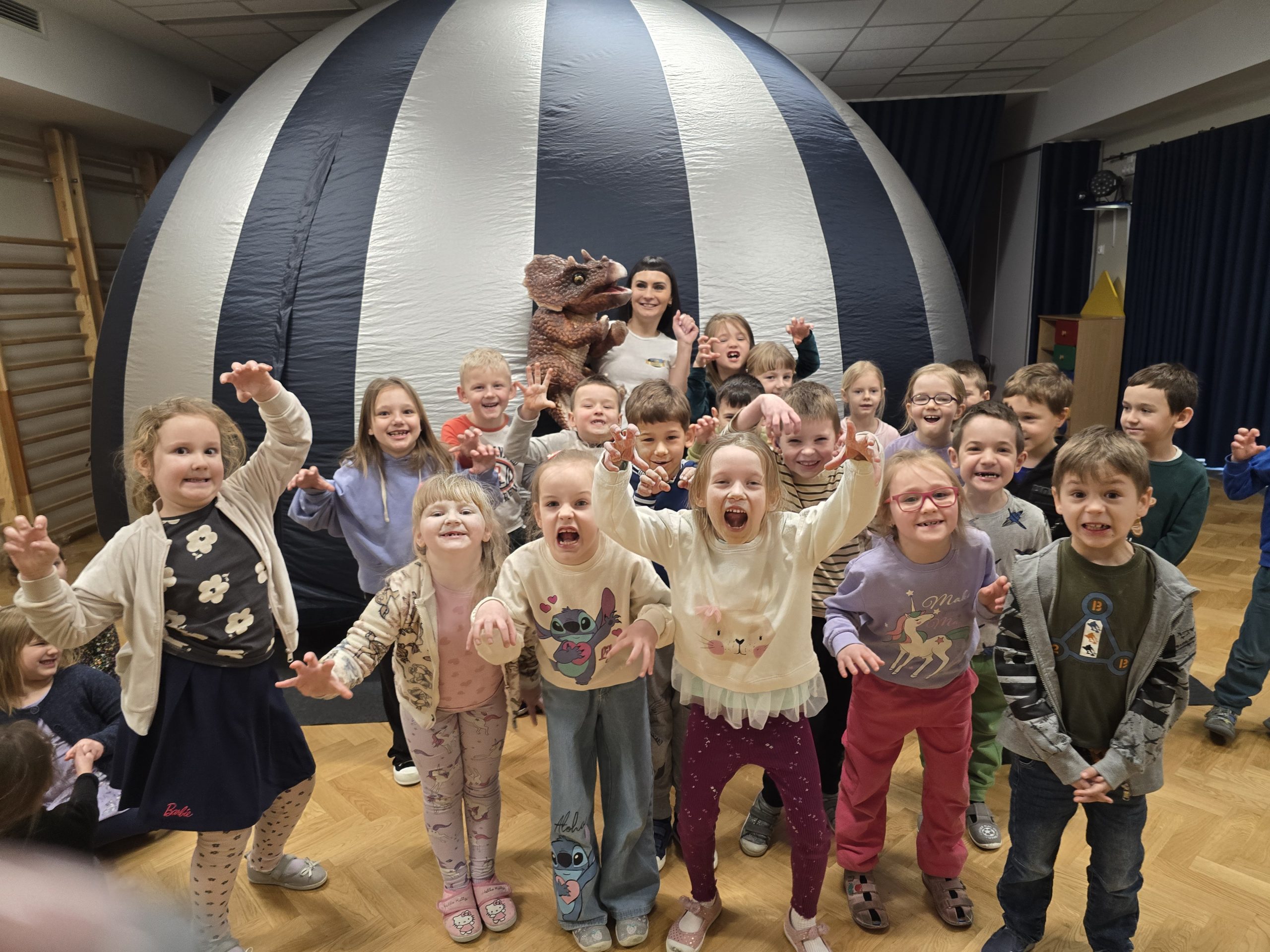 25 lutego nasze przedszkole odwiedziło Mobilne Planetarium ORBITEK. Nasza grupa uczestniczyła w niezwykłym seansie pt.: „Dinozaury – Historia Przetrwania”. Ten ciekawy film animowany w prosty sposób wyjaśnił dzieciom niektóre tajemnice życia na Ziemi. Była to pełna przygód opowieść o Celeste, która z pomocą magicznego przyjaciela poznaje tajemnicę przetrwania dinozaurów, ich historię i odkrywa, że dinozaury żyją wśród nas!