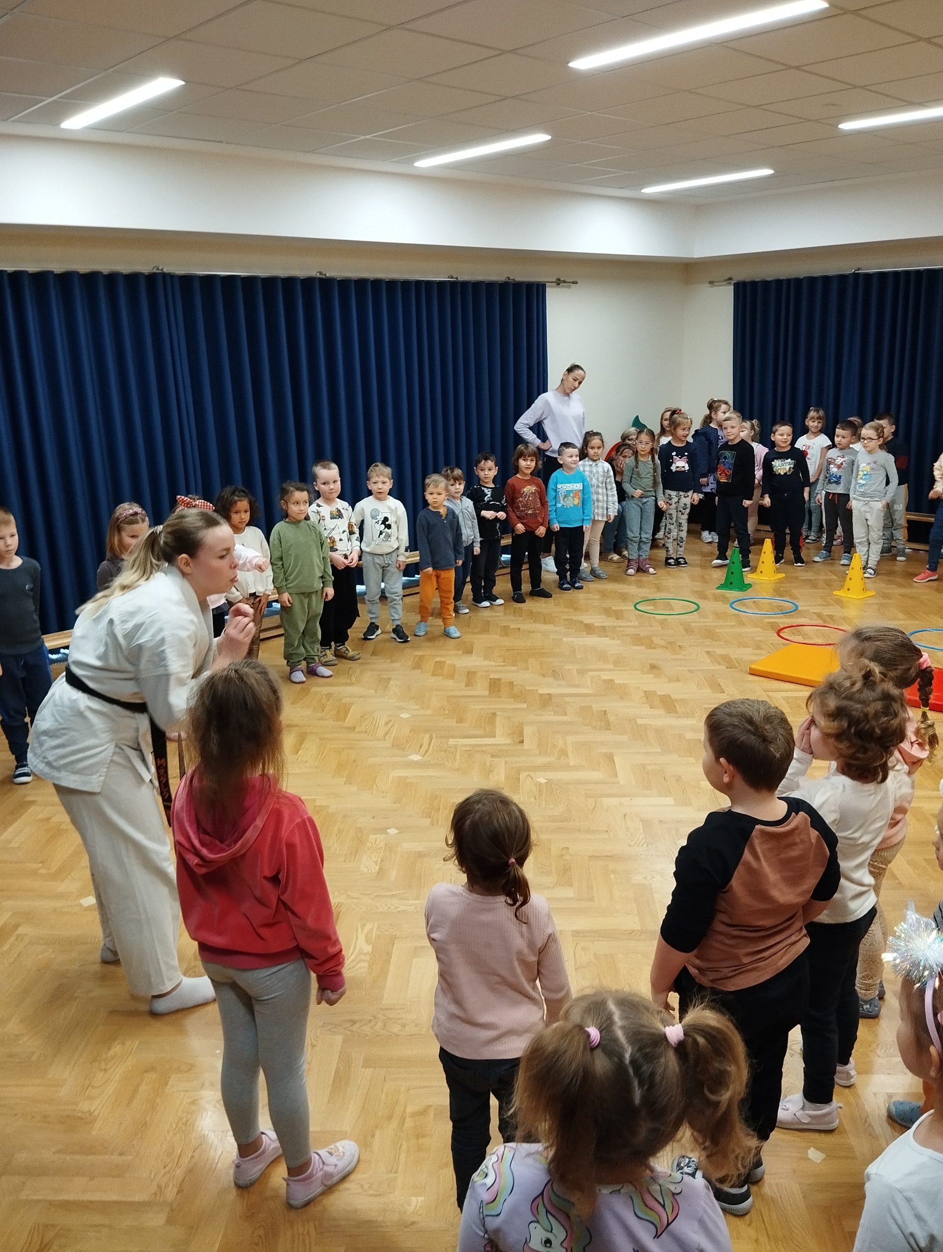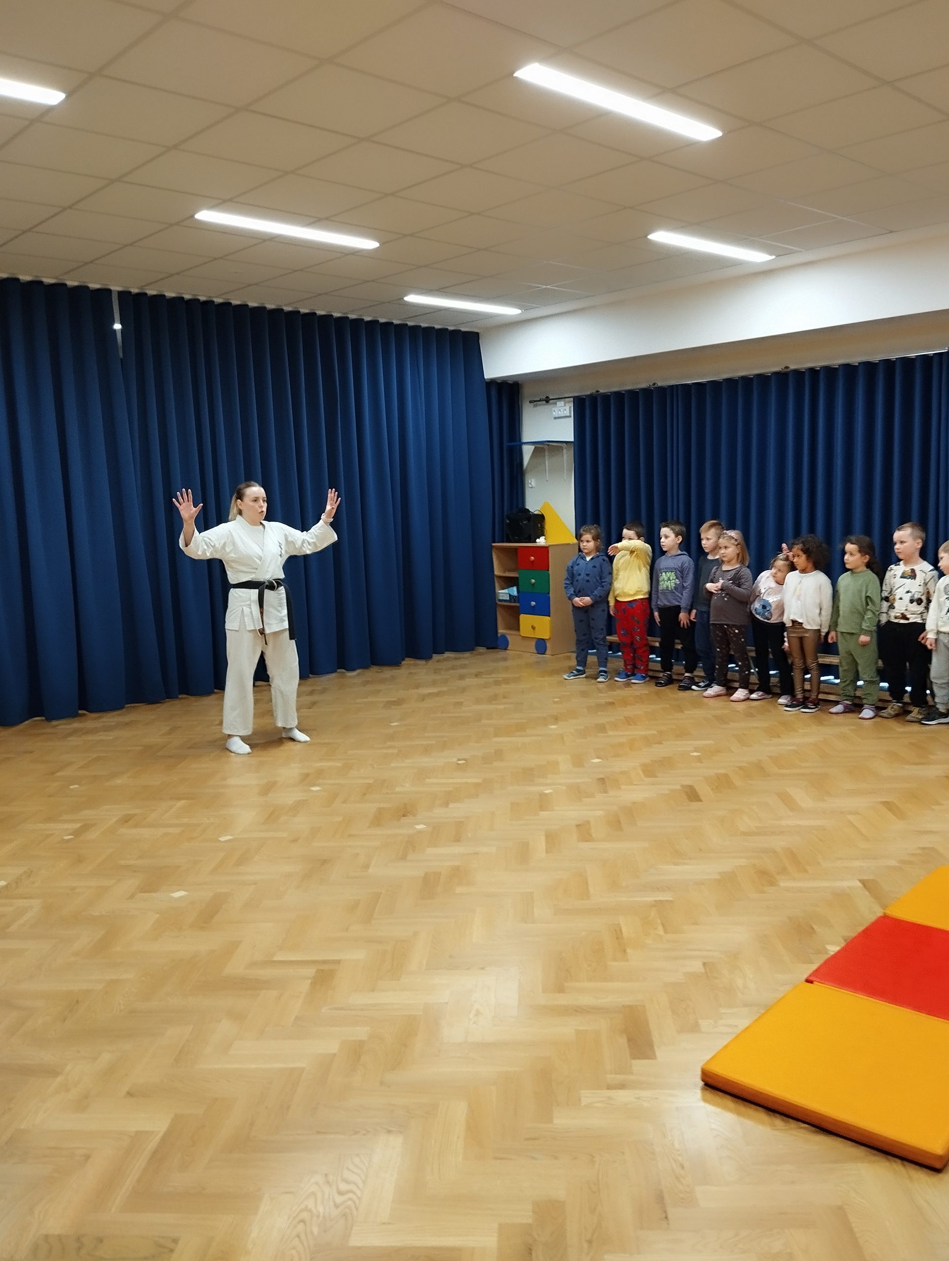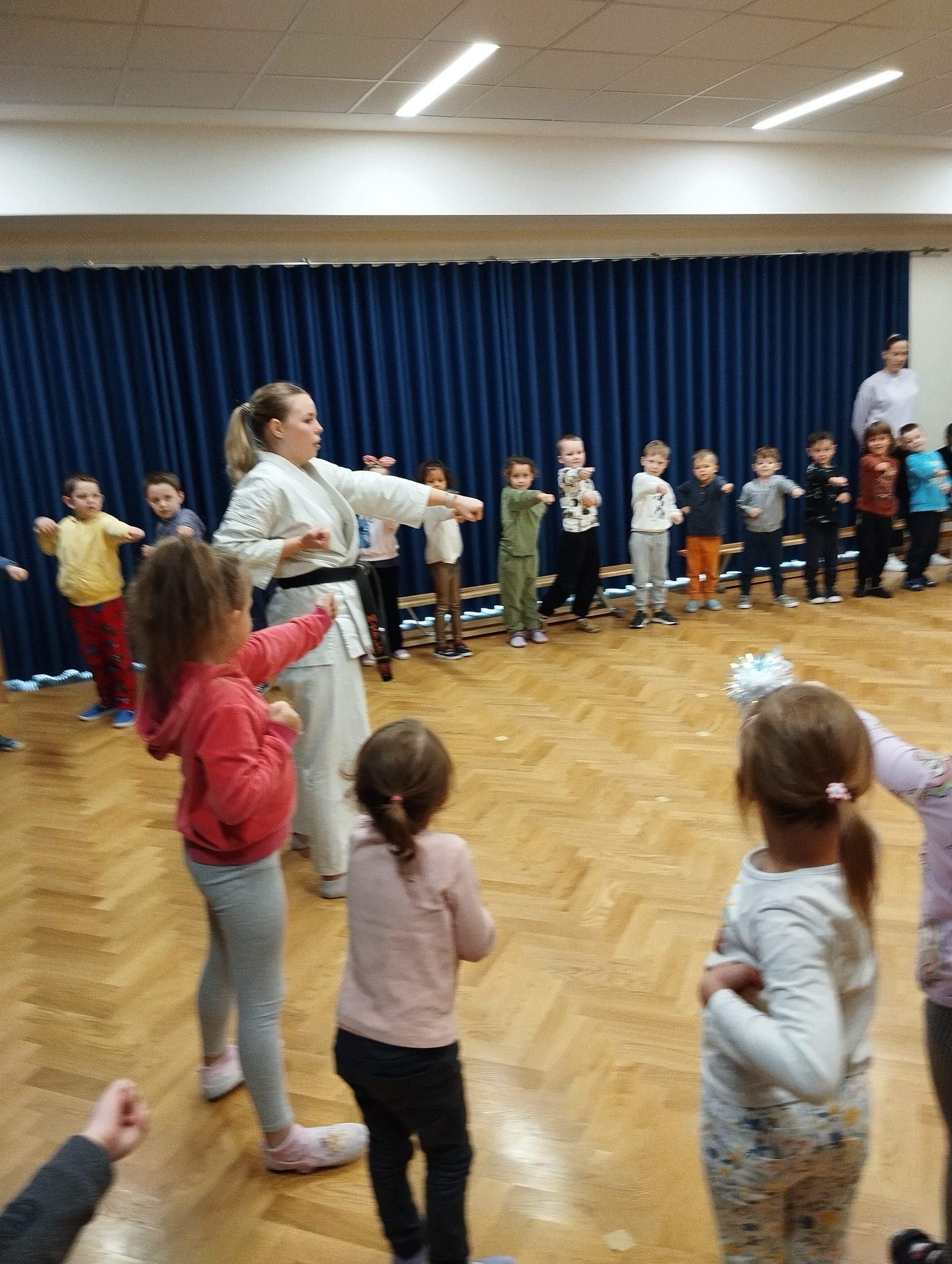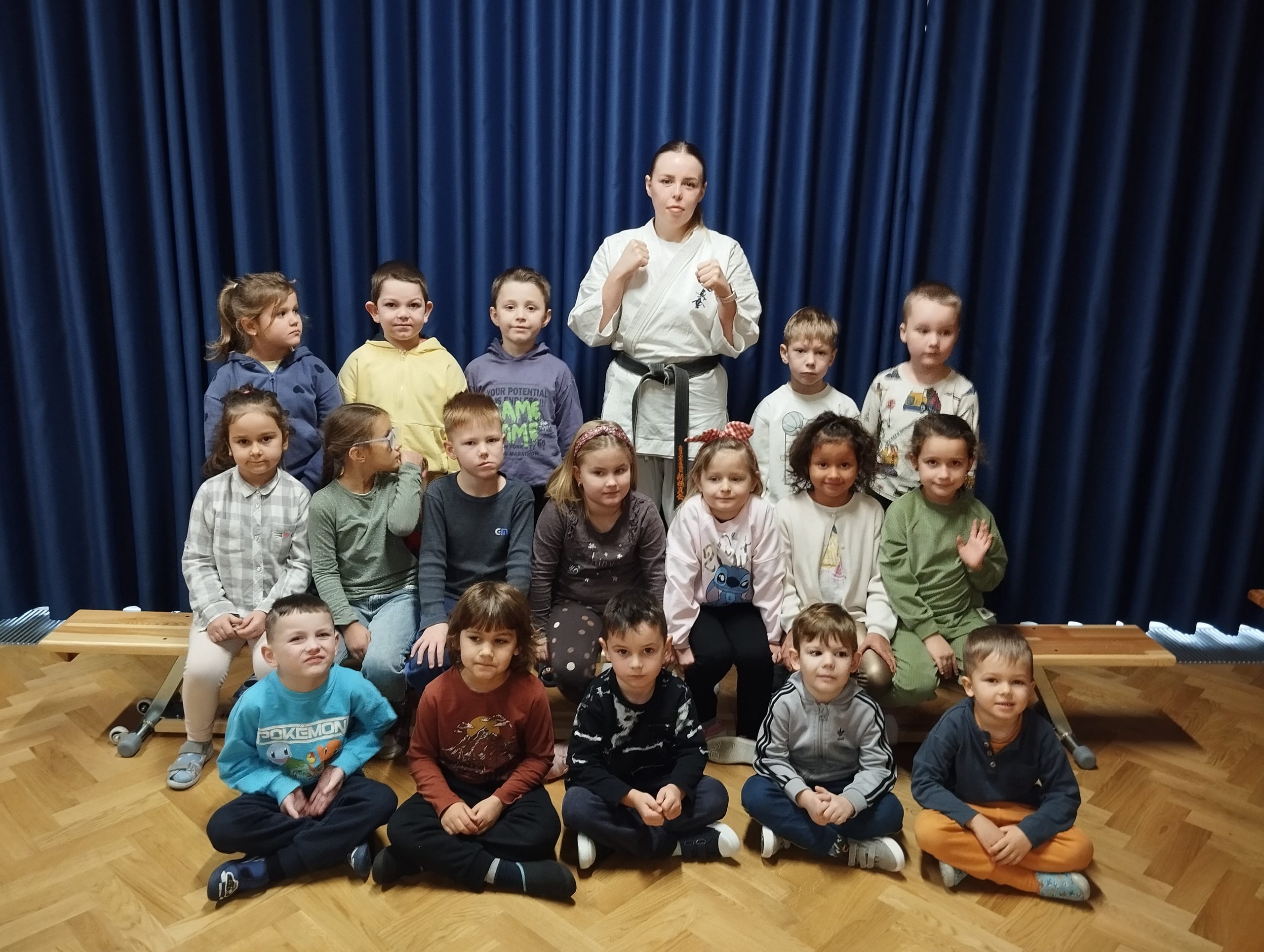 15.11. w naszym przedszkolu odbyło się ciekawe wydarzenie. Odwiedziła nas instruktorka Karate. Celem spotkania było zapoznanie dzieci z tą pochodzącą z Japonii starożytną i piękną sztuką walki. Zaprezentowała szereg komend, ciosów, uderzeń, kopnięć wykorzystywanych do samoobrony. Przedszkolaki miały także możliwość zobaczyć jak wygląda specjalny strój do karate, jakie kolory pasów przyznaje się za opanowanie technik podstawowych oraz mogli podziwiać zdobyte przez panią instruktor medale i puchary.