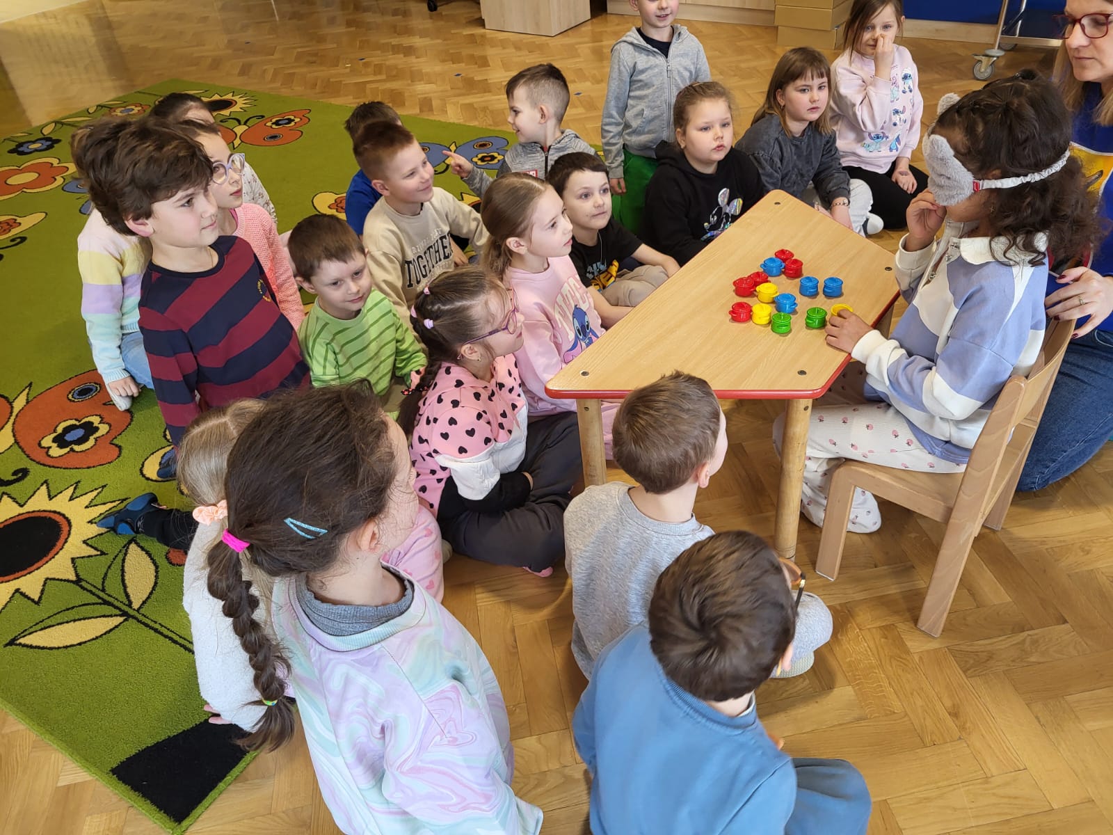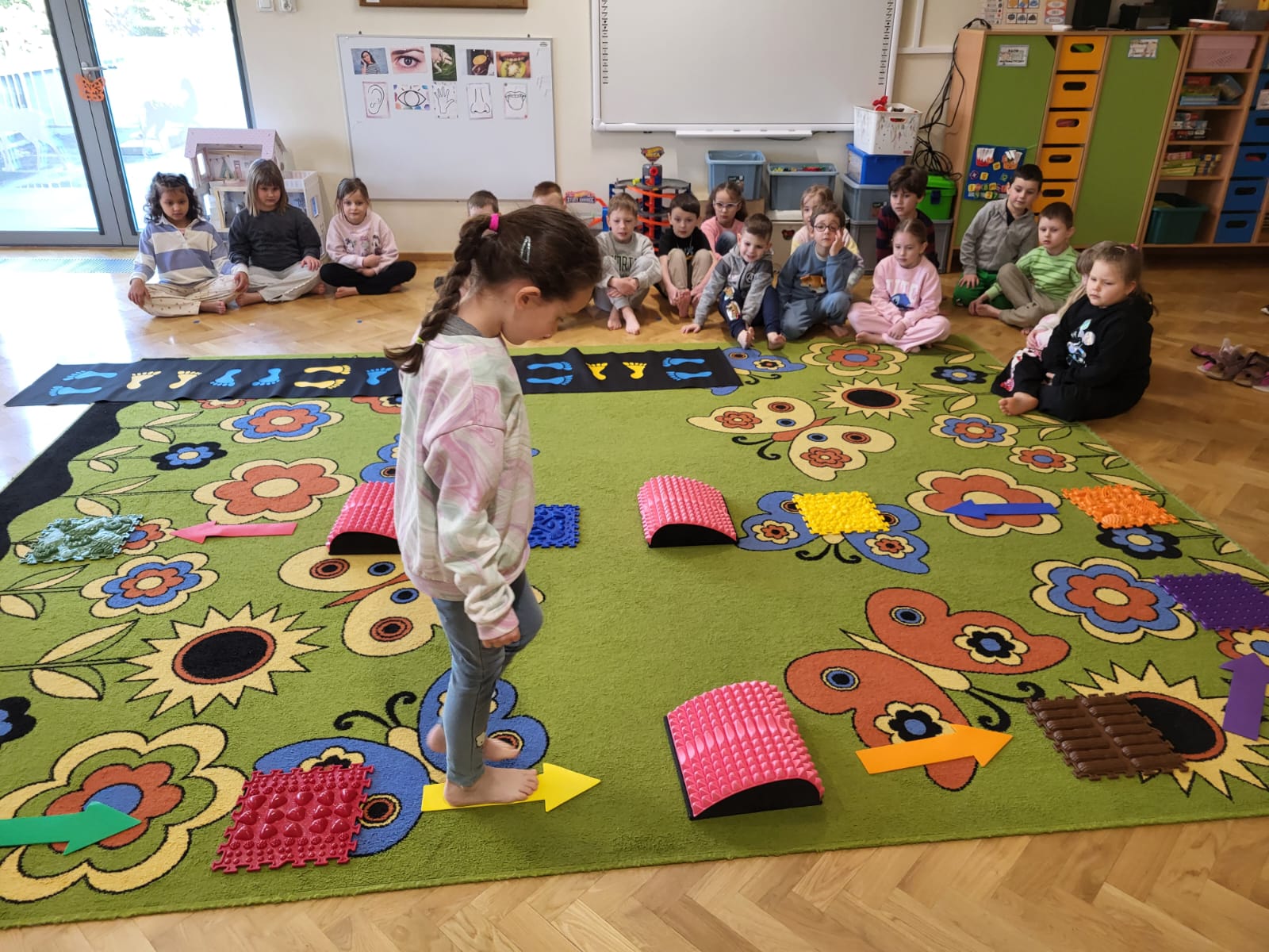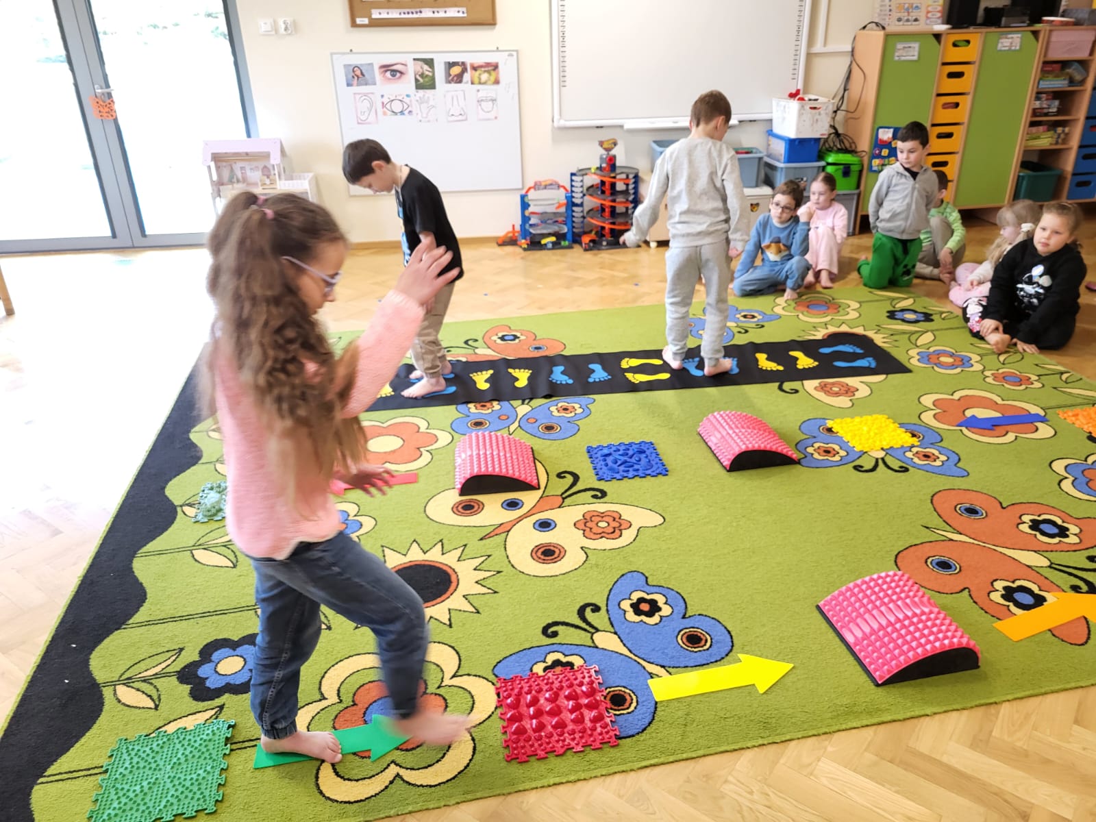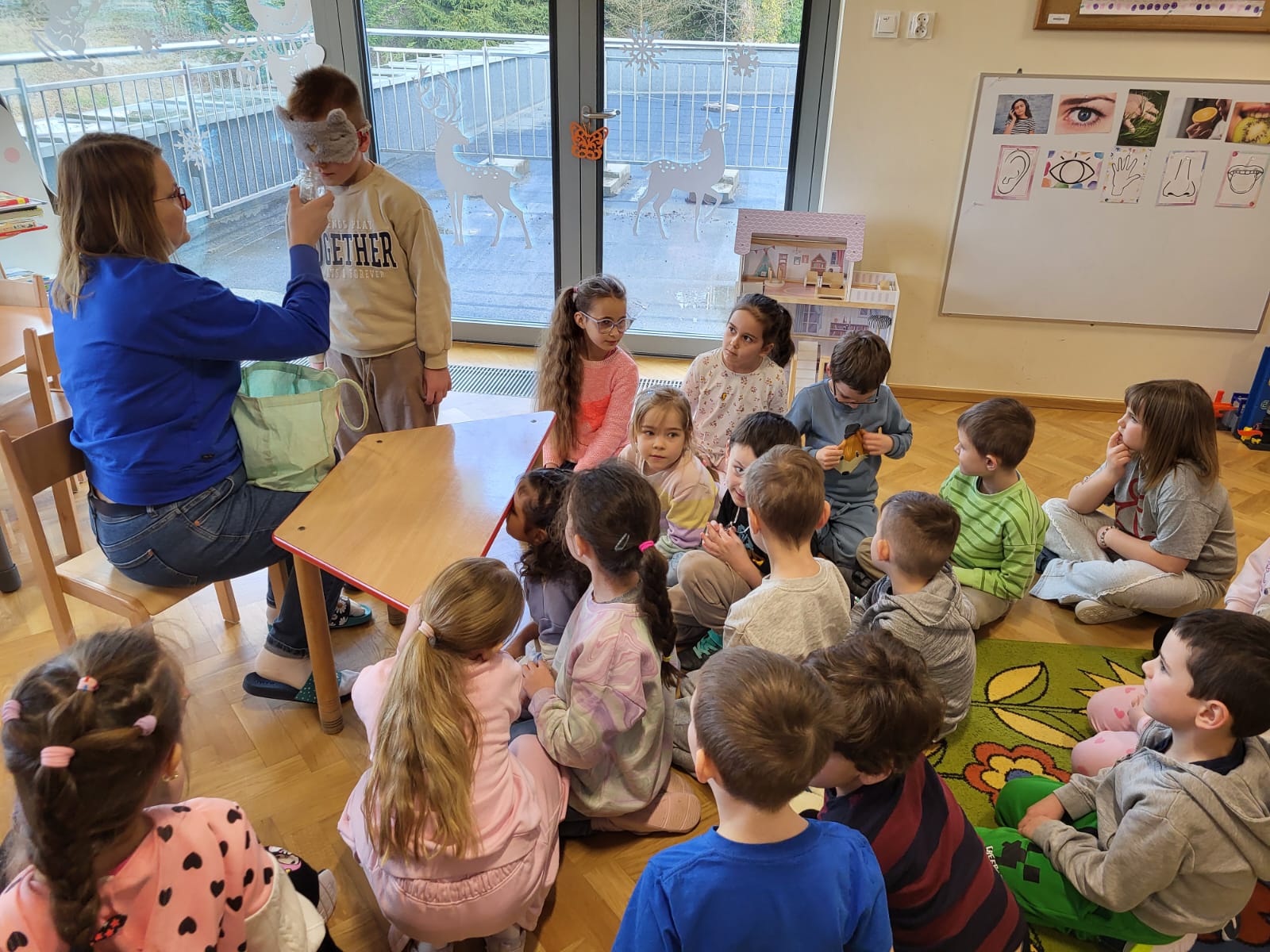 Przedszkolaki brały udział w zabawach sensorycznych: rozpoznawały przedmioty za pomocą dotyku , odgadywały dźwięki, zapachy oraz smaki, a także mogły doznać różnorodnych bodźców spacerując po ścieżce sensorycznej. Dzieci wykazały duże zaangażowanie i ciekawość poznawczą. Zajęcia przebiegły w miłej