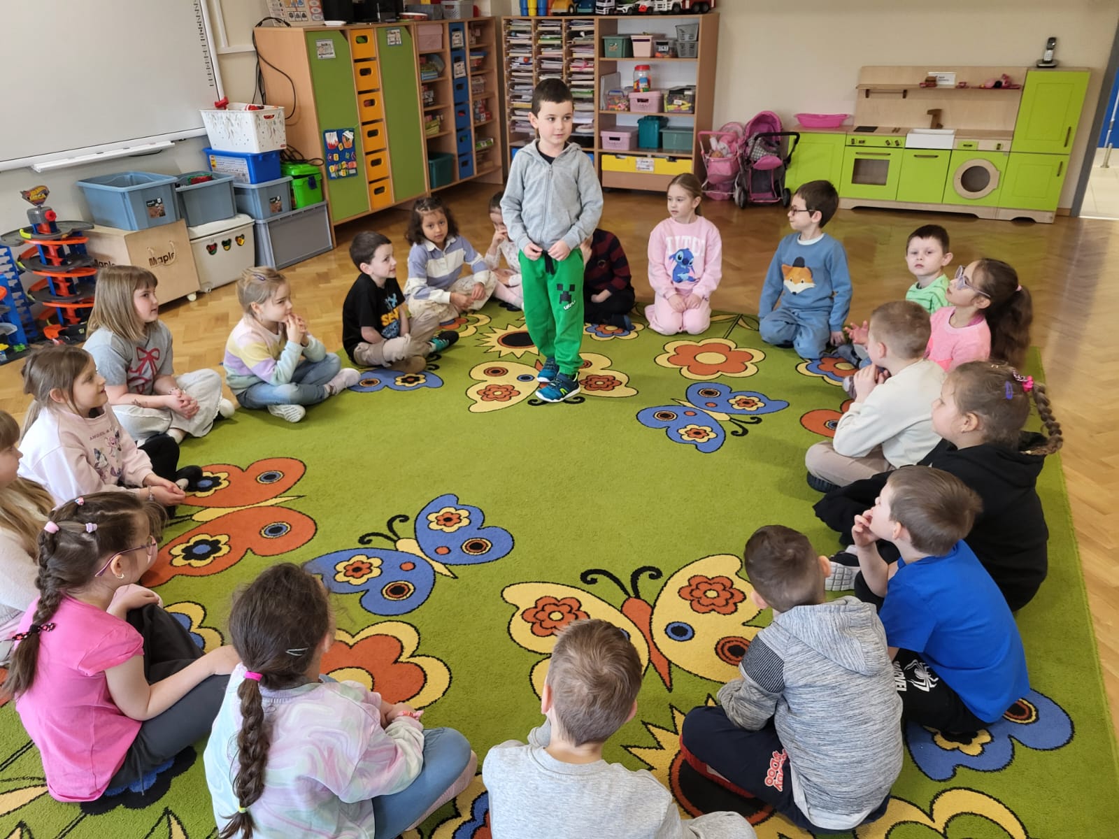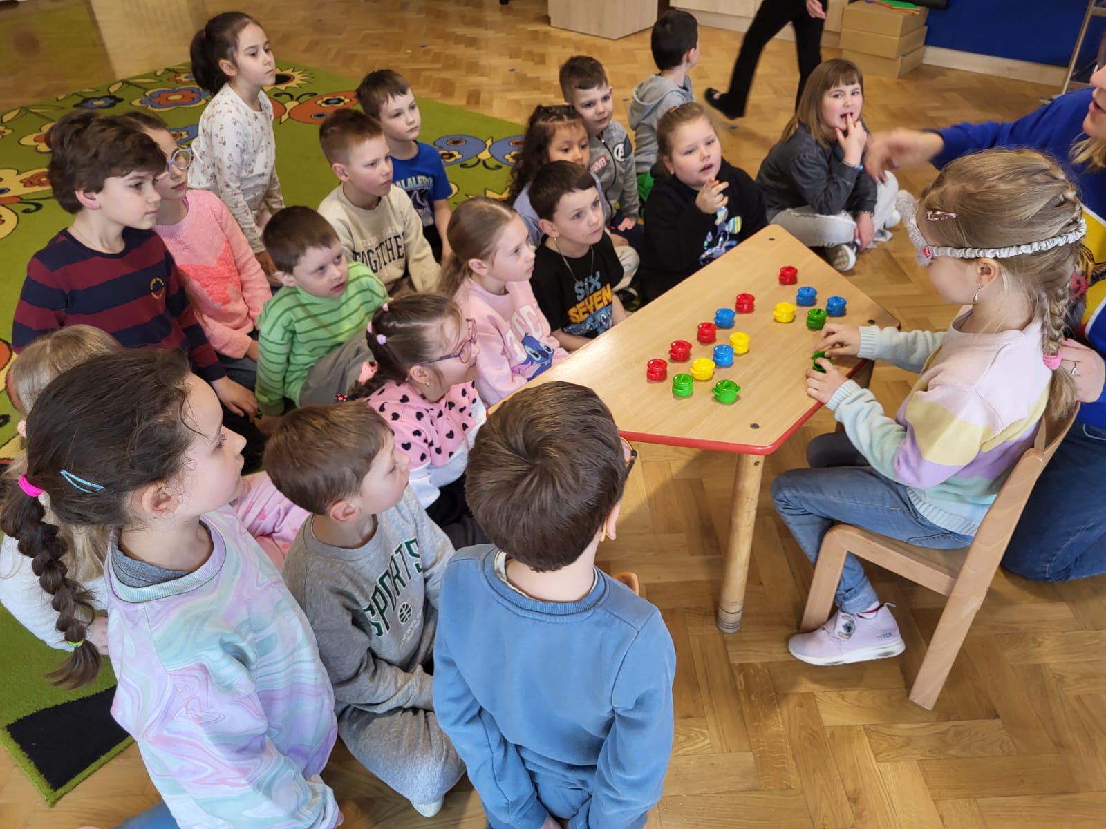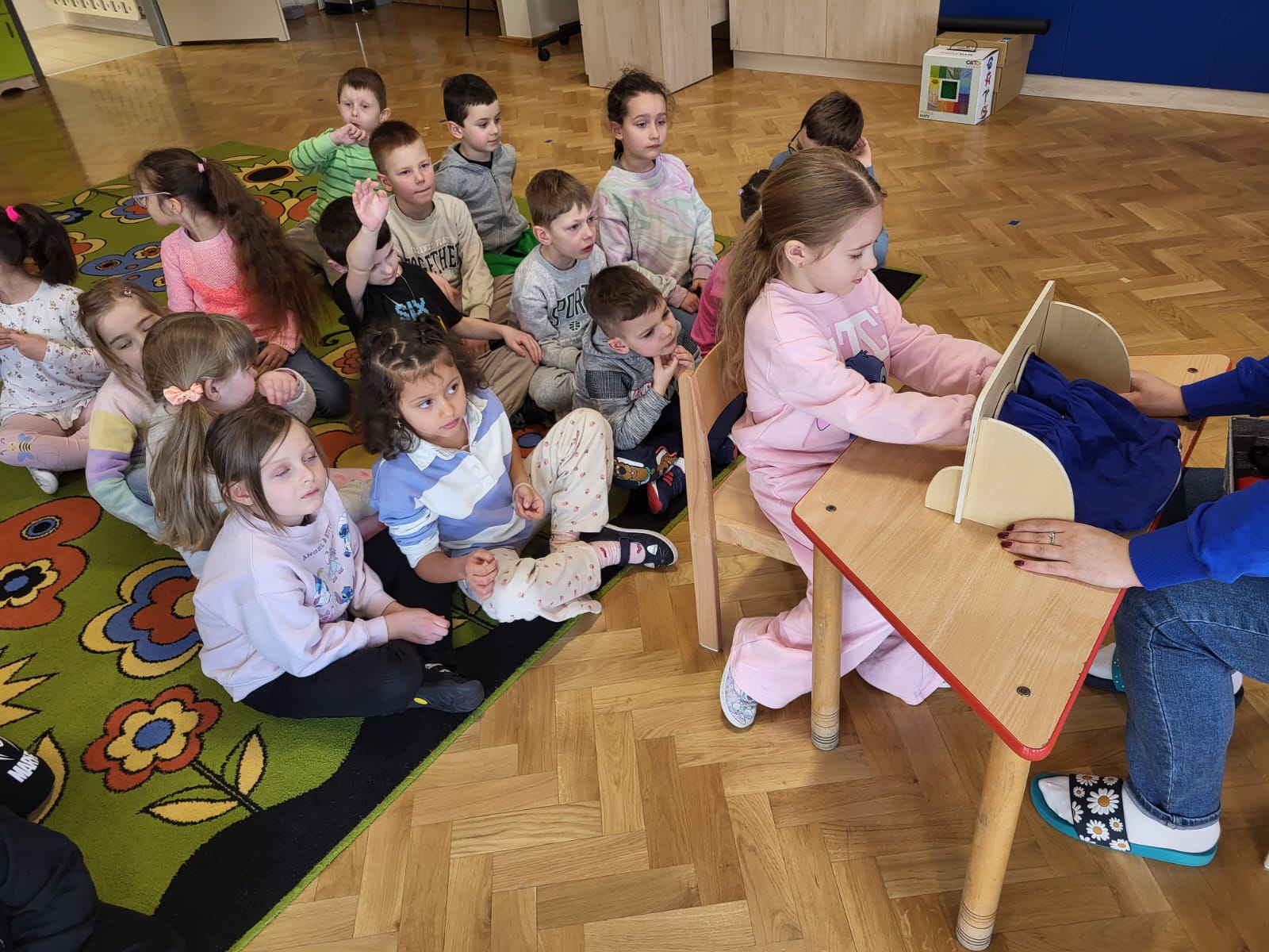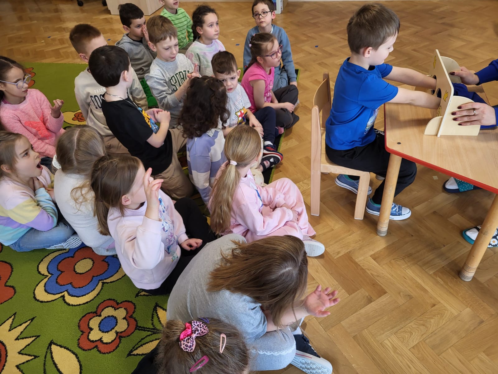 Przedszkolaki brały udział w zabawach sensorycznych: rozpoznawały przedmioty za pomocą dotyku , odgadywały dźwięki, zapachy oraz smaki, a także mogły doznać różnorodnych bodźców spacerując po ścieżce sensorycznej. Dzieci wykazały duże zaangażowanie i ciekawość poznawczą. Zajęcia przebiegły w miłej