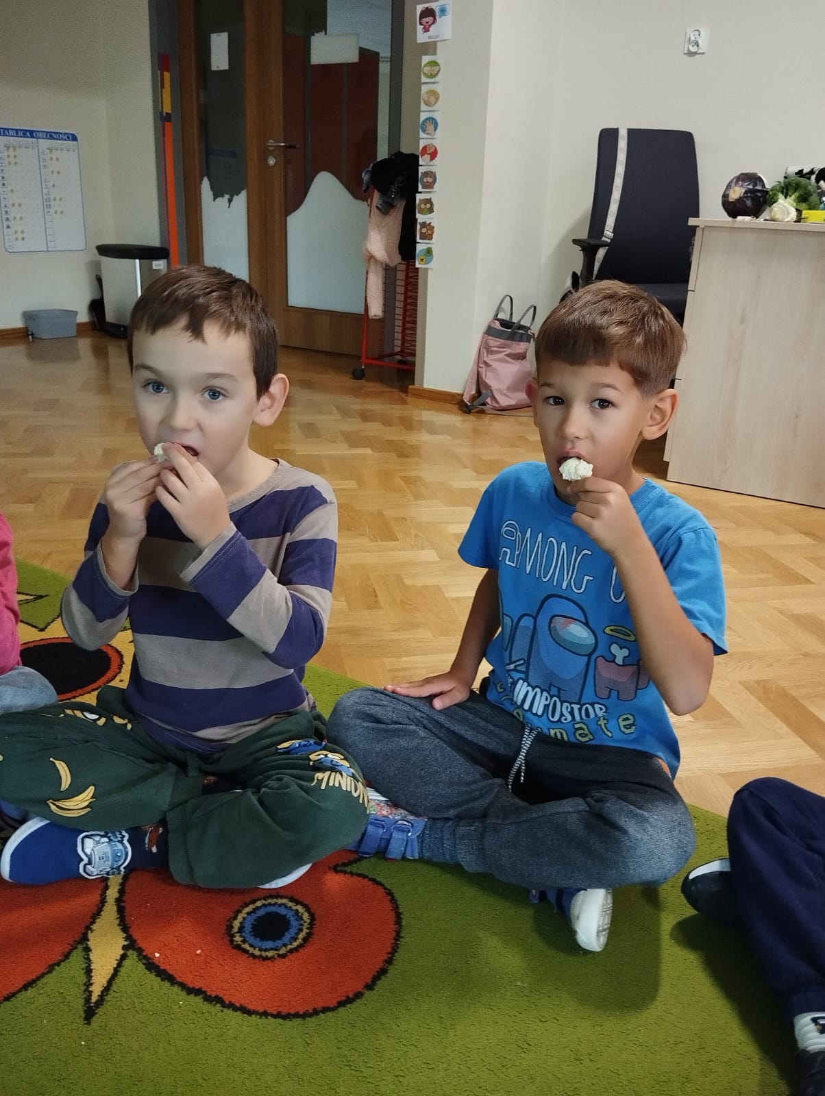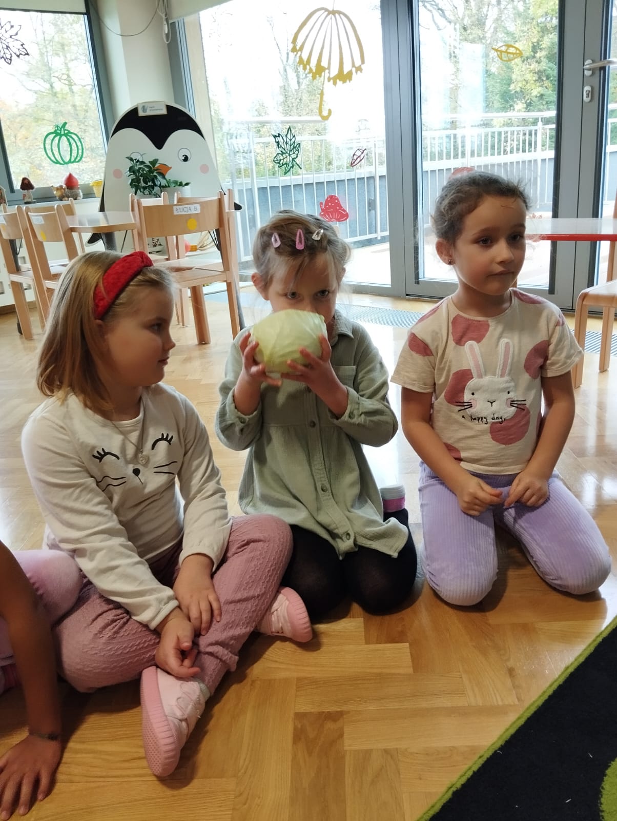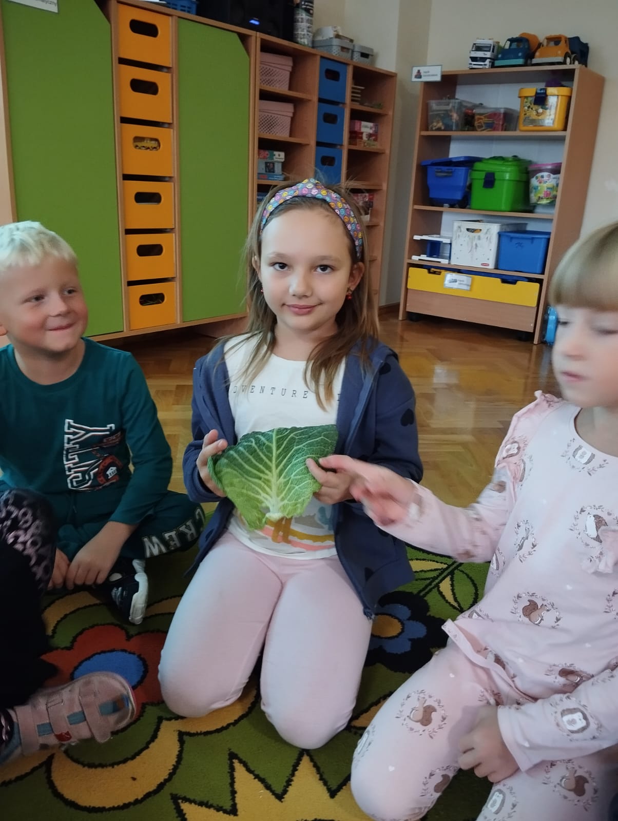 W dniu 29.10 w ramach projektu „Witaminki” podjęliśmy kapuściane wyzwanie razem z grupą VI. Rozpoznawaliśmy kapustę białą, czerwoną i kapustę pekińską różnymi zmysłami. Poznaliśmy zdrowotne właściwości tych warzyw. Przedszkolaki dowiedziały się, że kalafior i brokuł to też odmiany kapusty. Spróbowały jak smakują. Mogły zobaczyć jak się kisi kapustę oglądając film edukacyjny. Z entuzjazmem próbowały liści kapusty, kapustę kiszoną oraz częstowały się gotową surówką podczas obiadu. Wysłuchaliśmy piosenki „Kapusta Kama”, podzieliliśmy się pomysłami na posiłki z wykorzystaniem warzyw kapustnych. Na zakończenie wykonaliśmy pracę plastyczną.