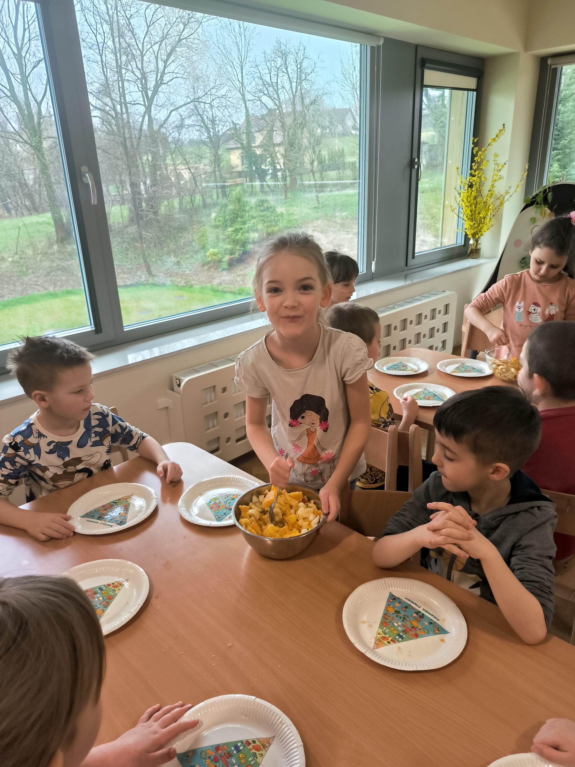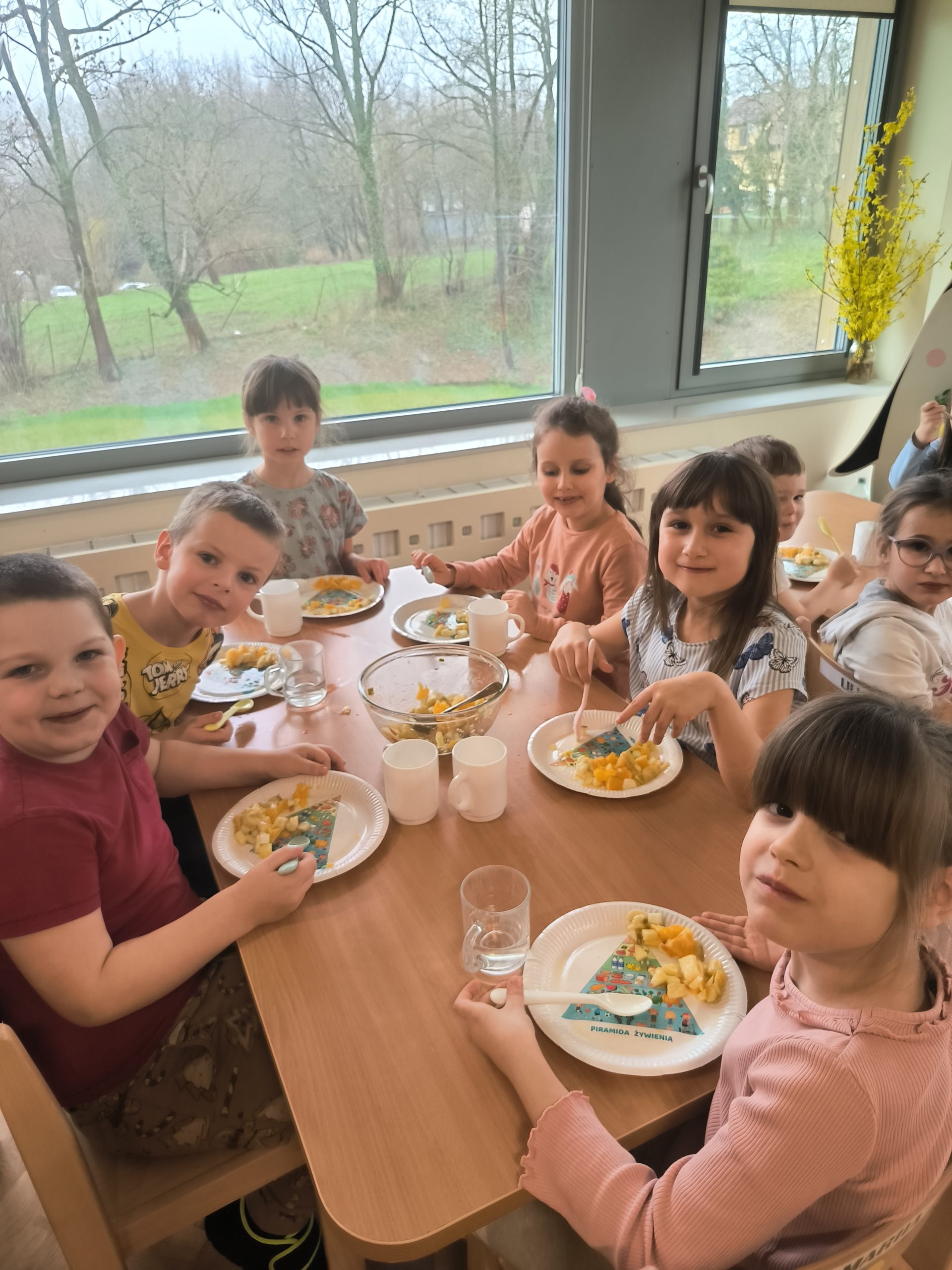 Podczas zajęć dzieci wysłuchały opowiadania o przygodzie Detektywa Witaminki w przedszkolu, jak również przypomnieliśmy sobie piramidę żywienia. Następnie dzieci samodzielnie przygotowały przepyszne sałatki owocowe, które szybko zniknęły z ich talerzy. Zajęcia wywołały mnóstwo radości i uśmiechów na twarzach dzieci.