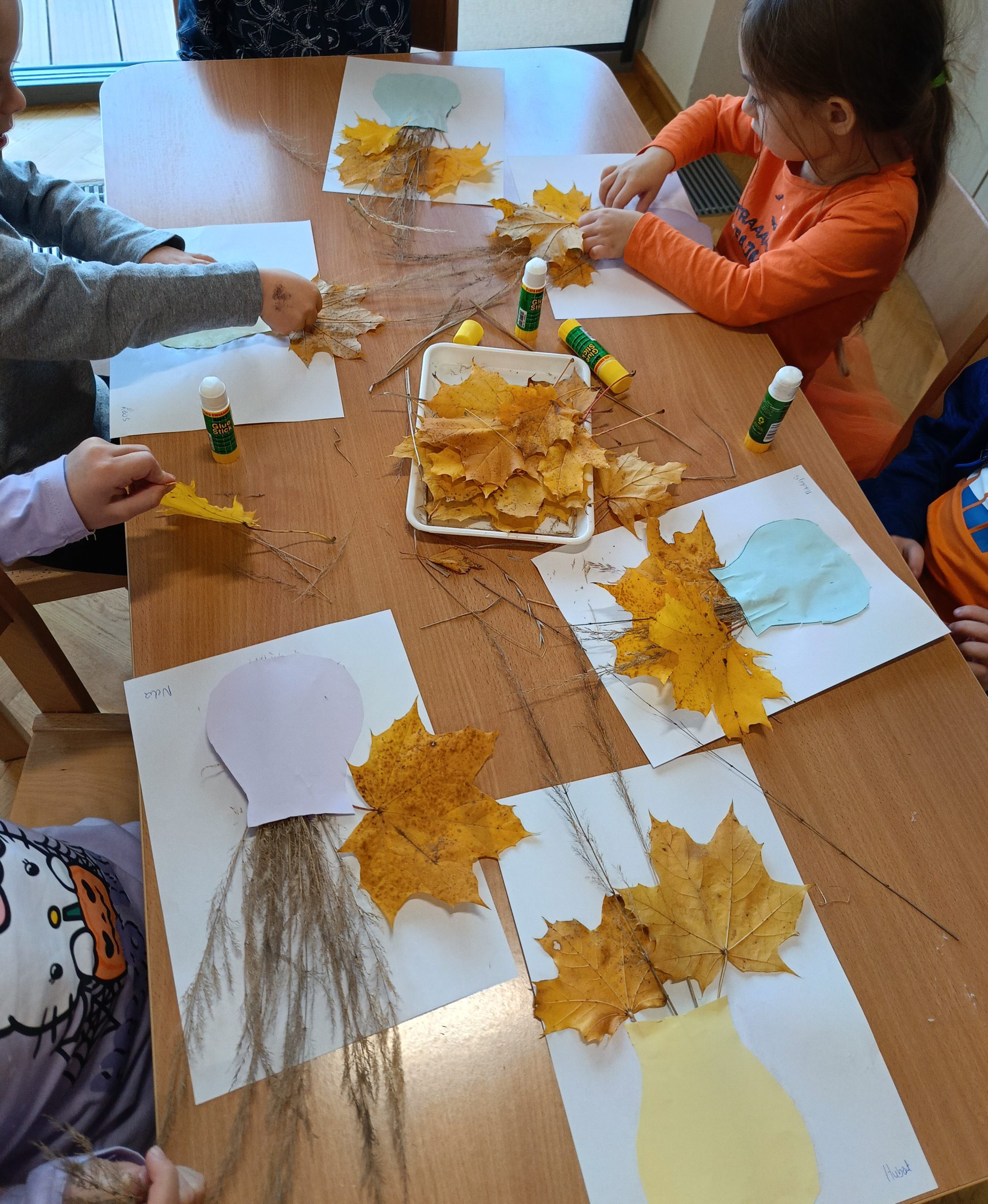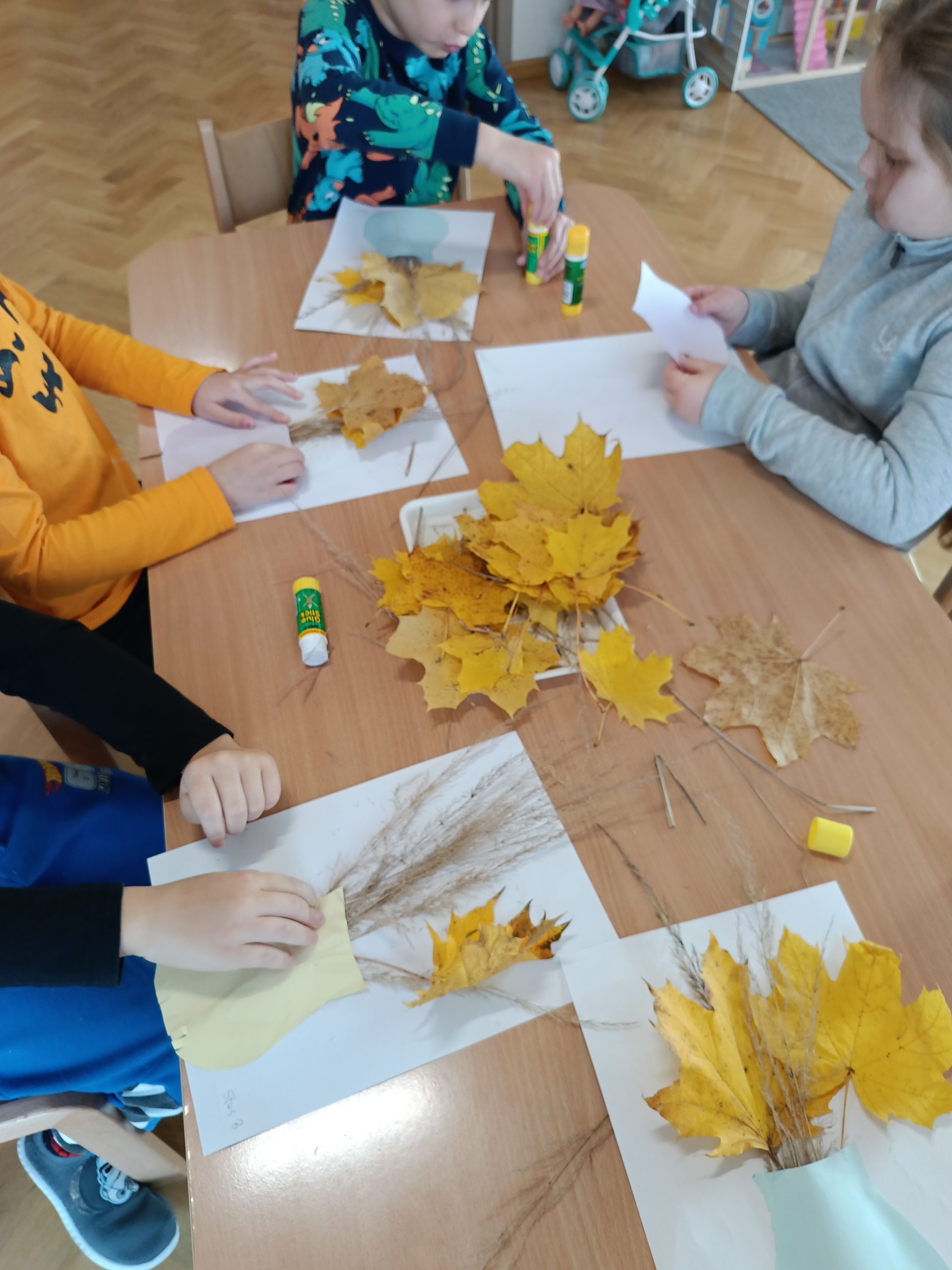 Jesienny bukiet – to drugie zadanie, podczas którego dzieci odkryły, że nawet odpady organiczne, takie jak suszone liście, trawa czy gałązki, można wykorzystać w twórczy sposób. Z tych naturalnych materiałów powstały jesienne bukiety, pełne barw i wyobraźni.