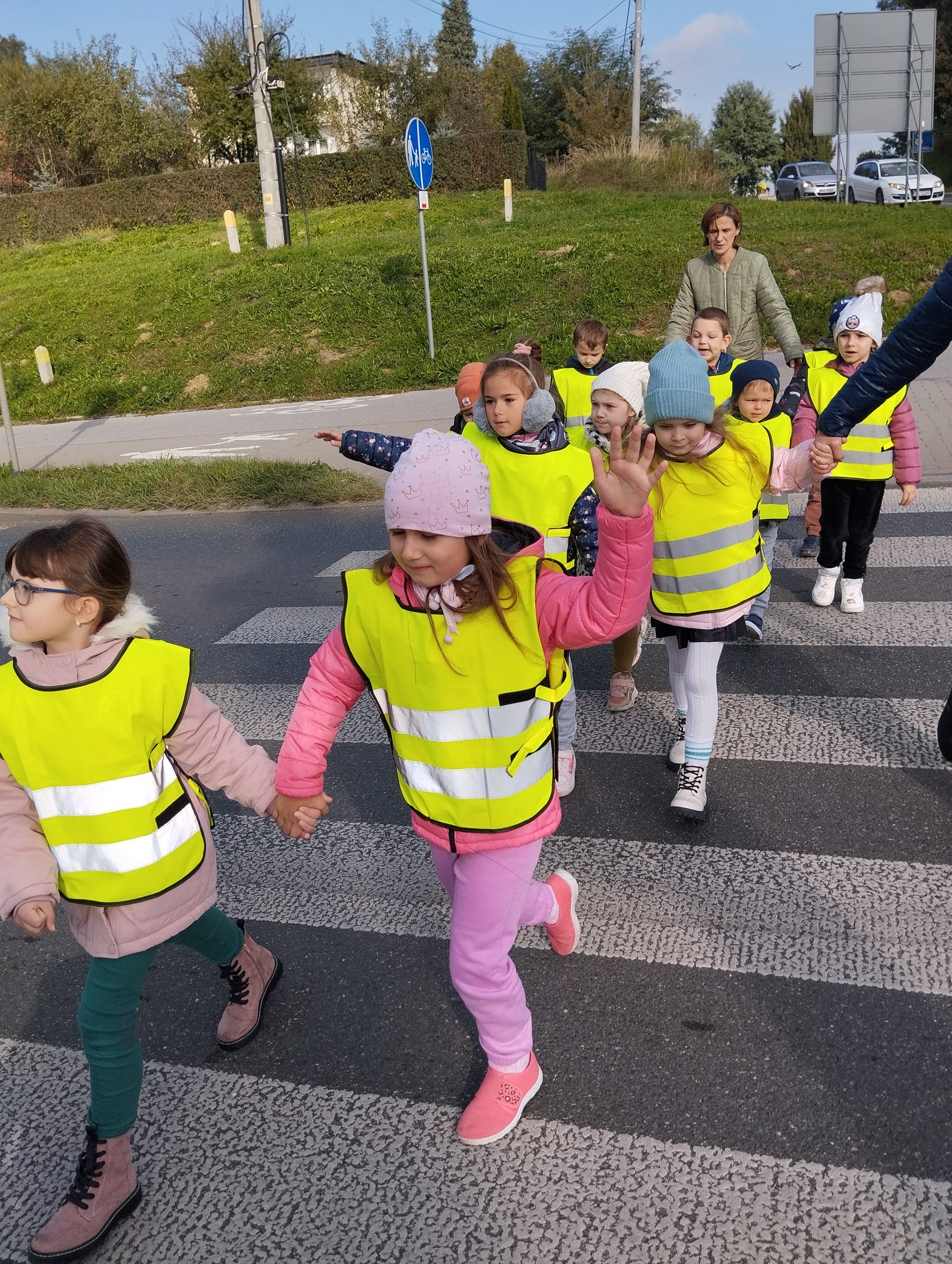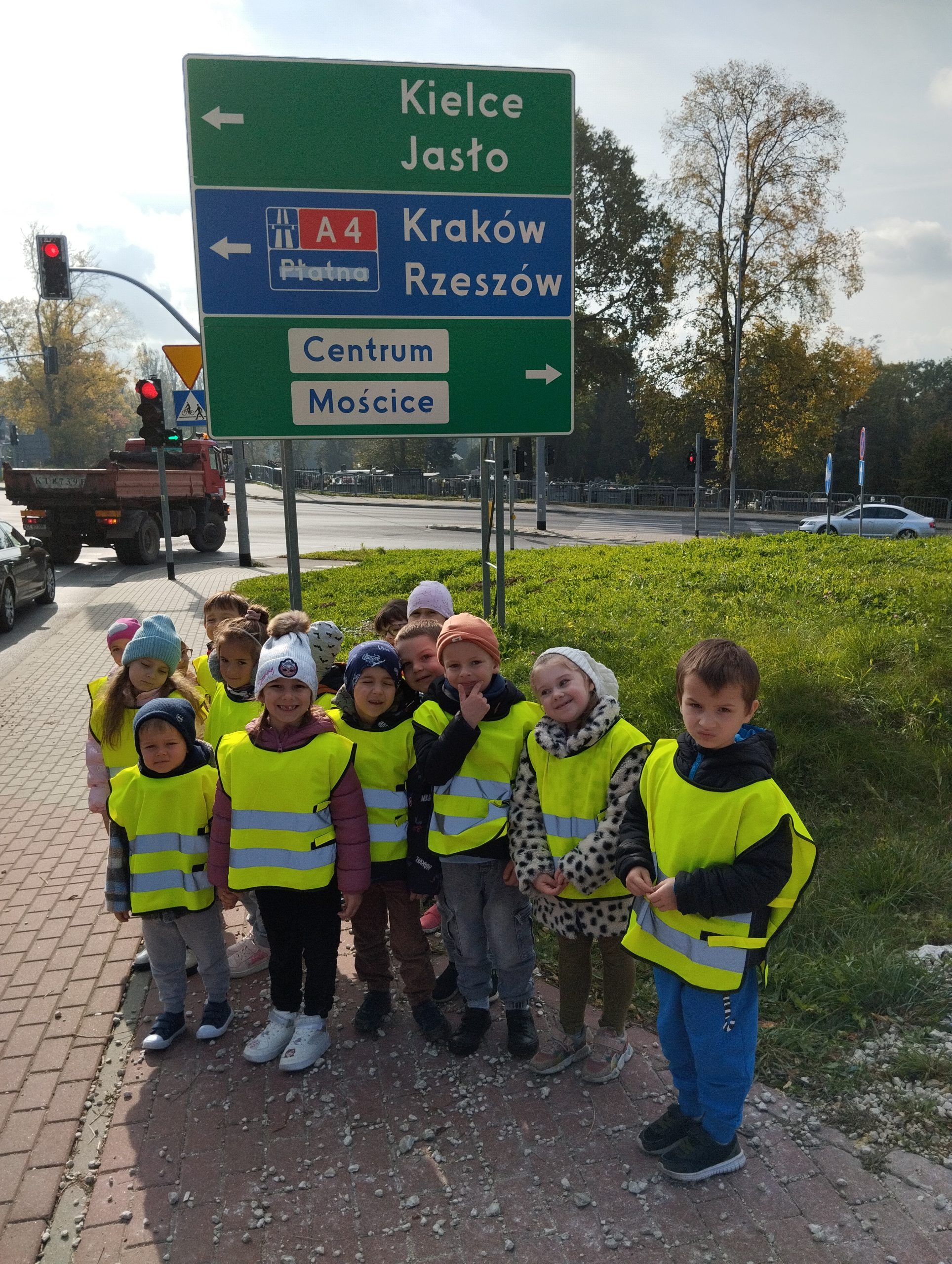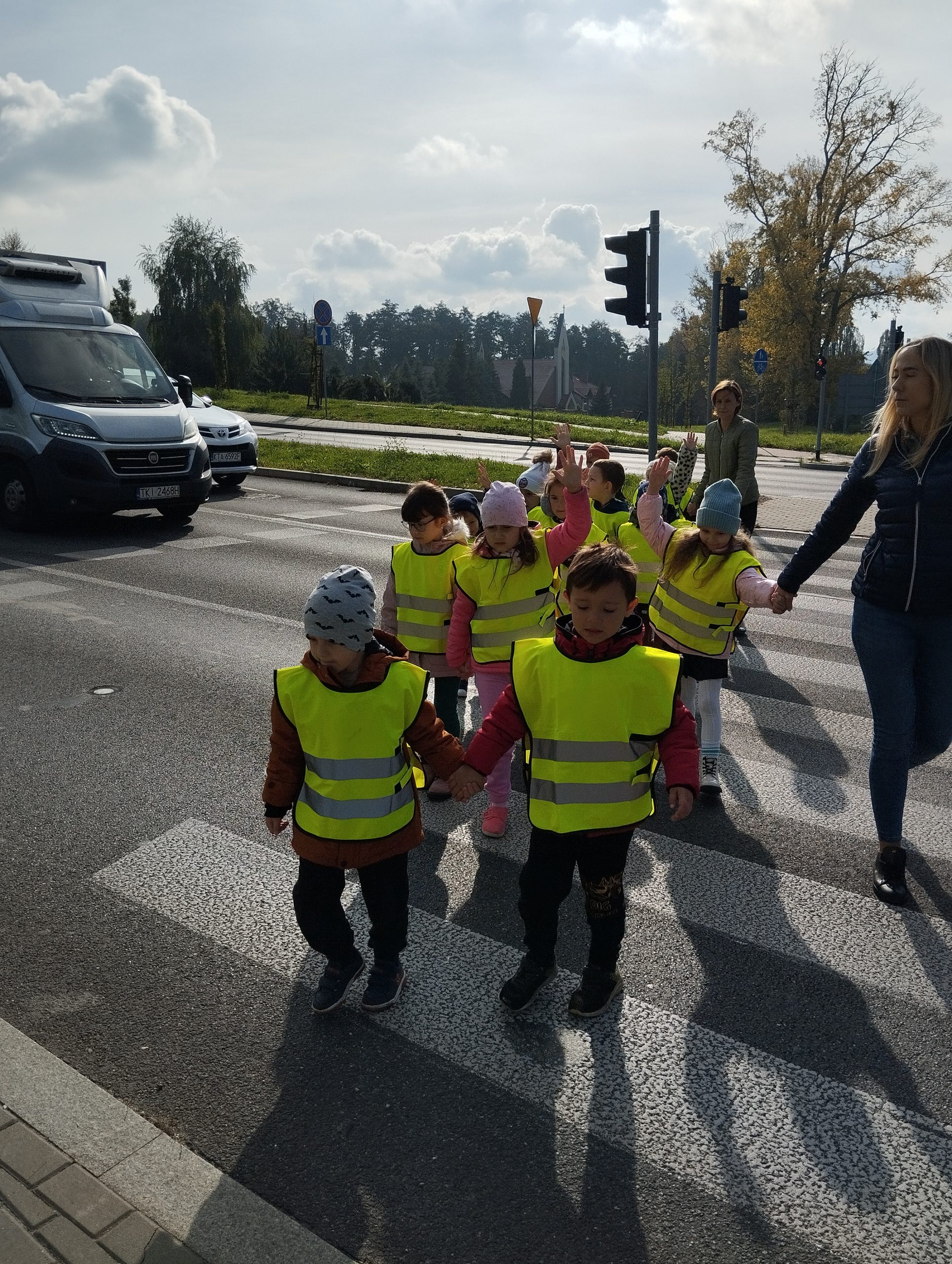 Dnia 17 października nasza grupa wybrała się na pobliskie skrzyżowanie. Celem wyjścia było kształtowanie  nawyku właściwego zachowania się w ruchu drogowym oraz utrwalenie podstawowych zasad poruszania się po drogach. Przedszkolaki obserwowały ruch uliczny, ćwiczyły umiejętności poruszania się w pobliżu jezdni oraz prawidłowego przechodzenia przez pasy.