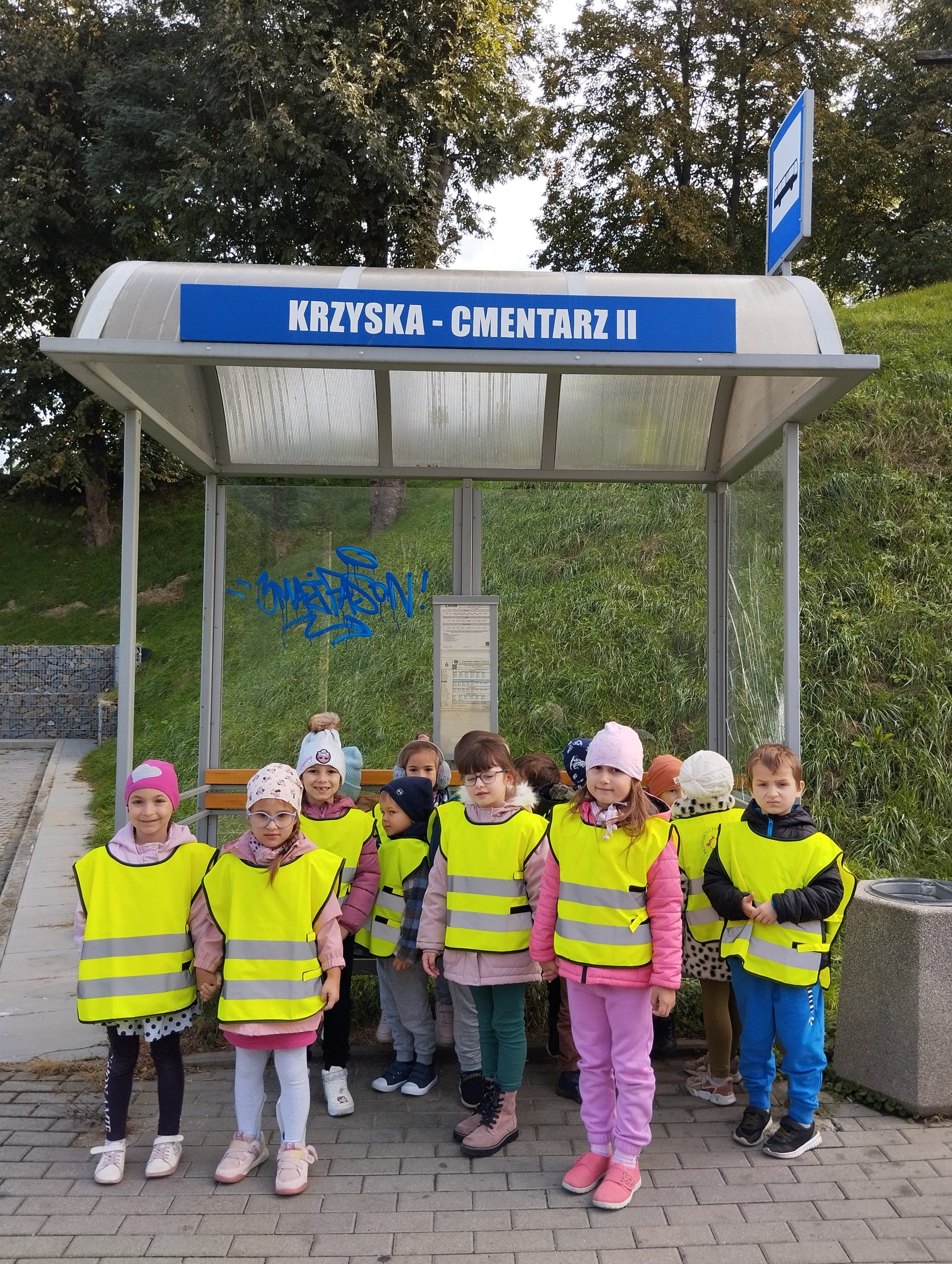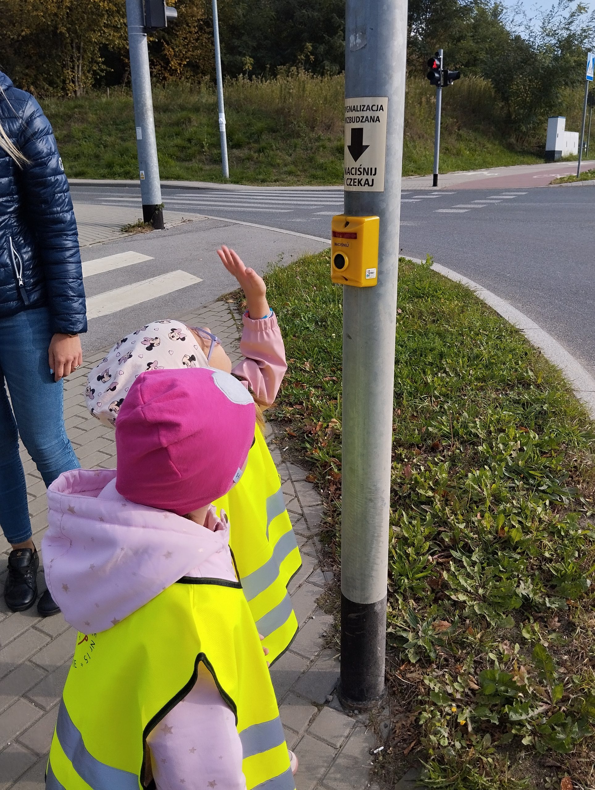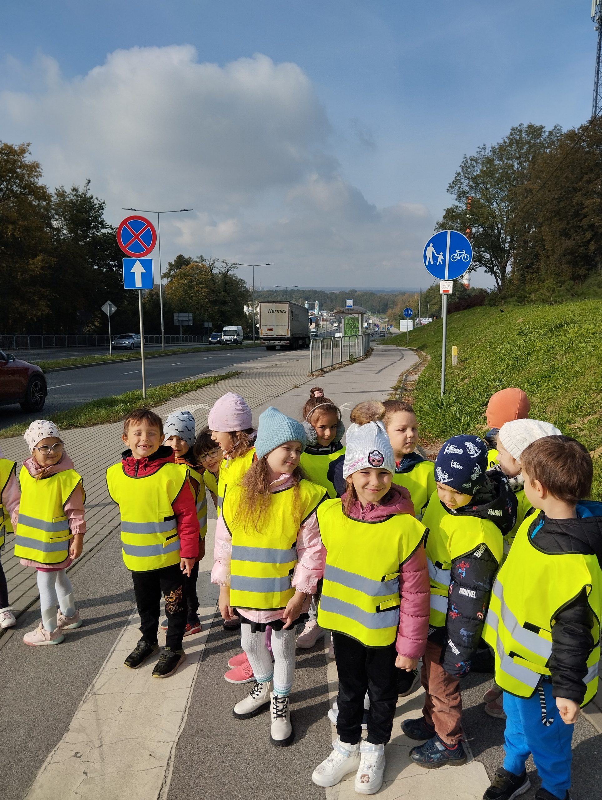 Dnia 17 października nasza grupa wybrała się na pobliskie skrzyżowanie. Celem wyjścia było kształtowanie  nawyku właściwego zachowania się w ruchu drogowym oraz utrwalenie podstawowych zasad poruszania się po drogach. Przedszkolaki obserwowały ruch uliczny, ćwiczyły umiejętności poruszania się w pobliżu jezdni oraz prawidłowego przechodzenia przez pasy.