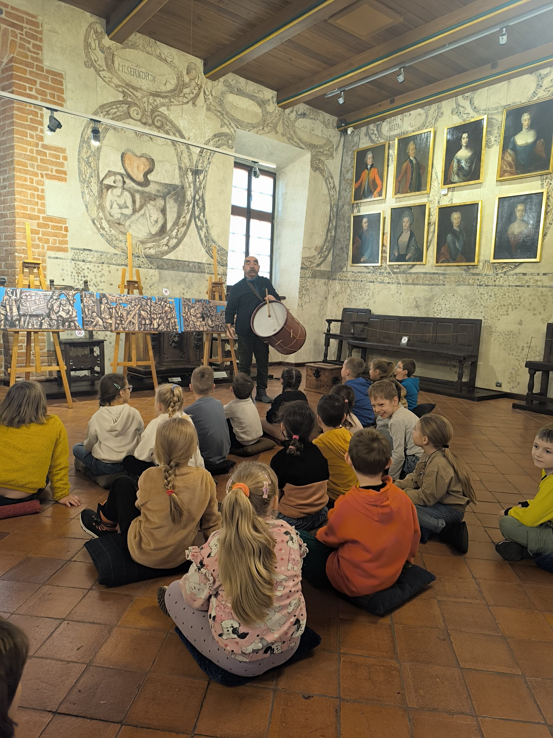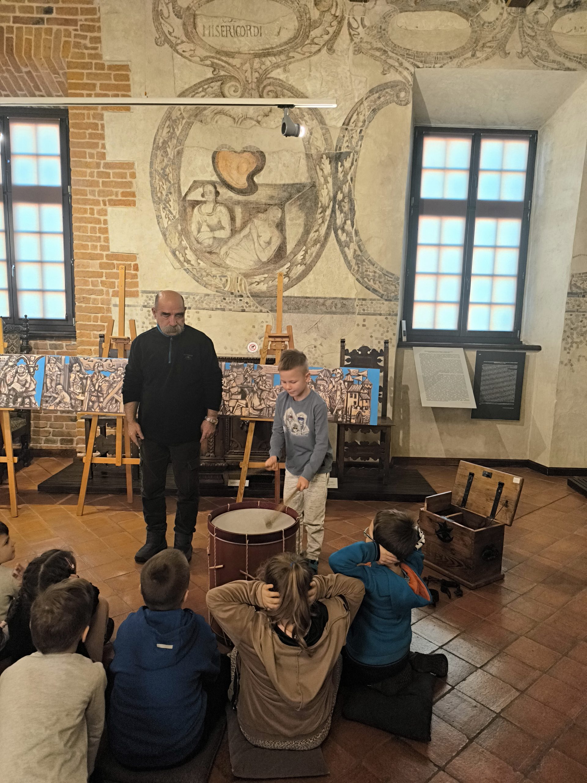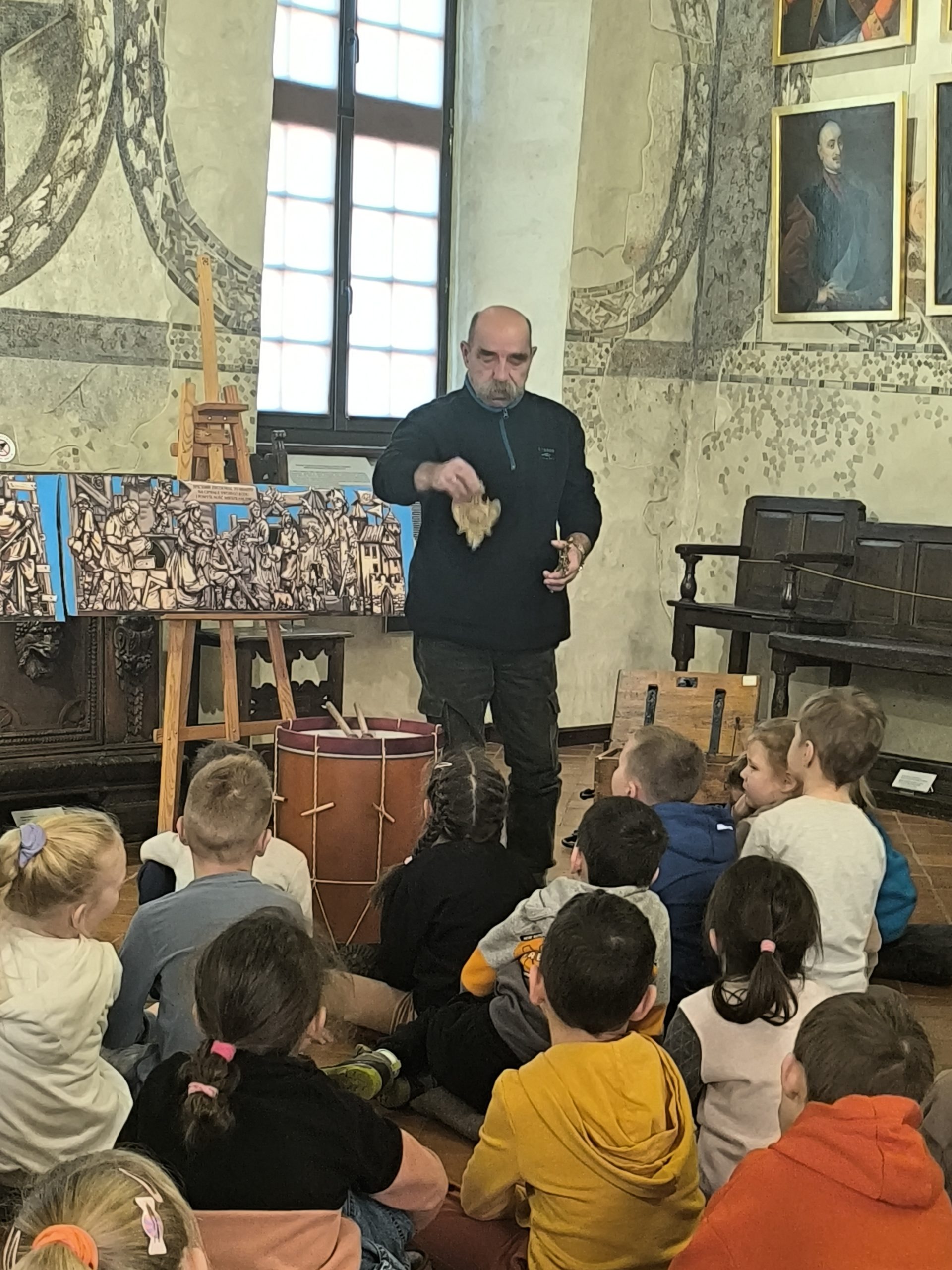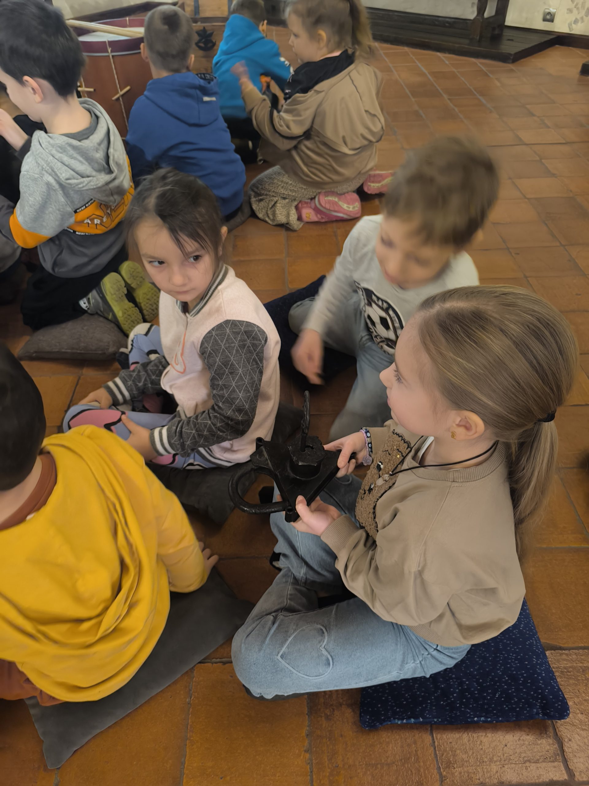 Podczas zajęć przedszkolaki mogły poczuć się jak prawdziwi krzykacze miejscy – samodzielnie ogłaszały obwieszczenia, posługując się tarabanem, co wywołało mnóstwo radości i śmiechu. Dzieci oglądały również stare monety, dowiadując się, jak wyglądały dawniej środki płatnicze. Dużym zainteresowaniem cieszyły się również stare skrzynie na drogocenne przedmioty oraz możliwość sprawdzenia, ile ważyły dawne kłódki.