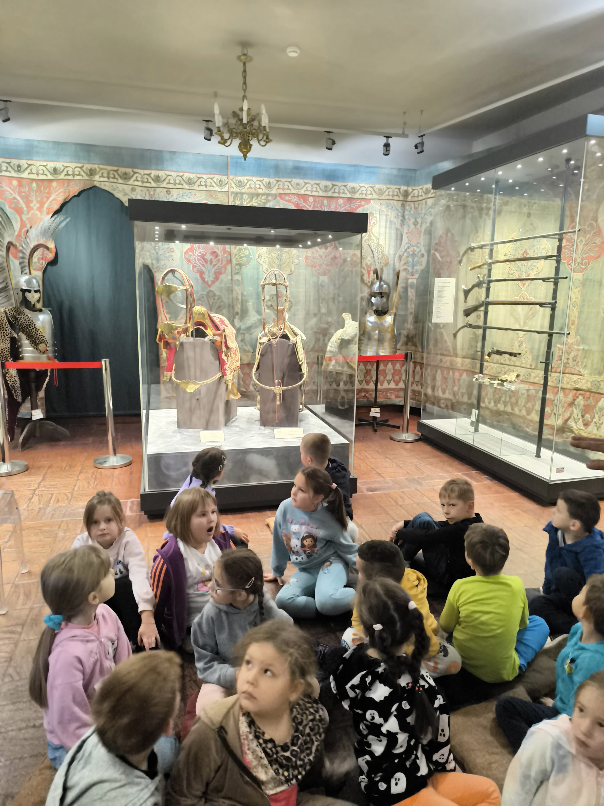 Podczas spotkania przedszkolaki dowiedziały się, jak wyglądał strój i wyposażenie rycerza. Z dużym zainteresowaniem oglądały napierśnik, hełm, miecz oburęczny, miecz trójręczny, szpadę, kopię oraz ubranie konia rycerskiego.