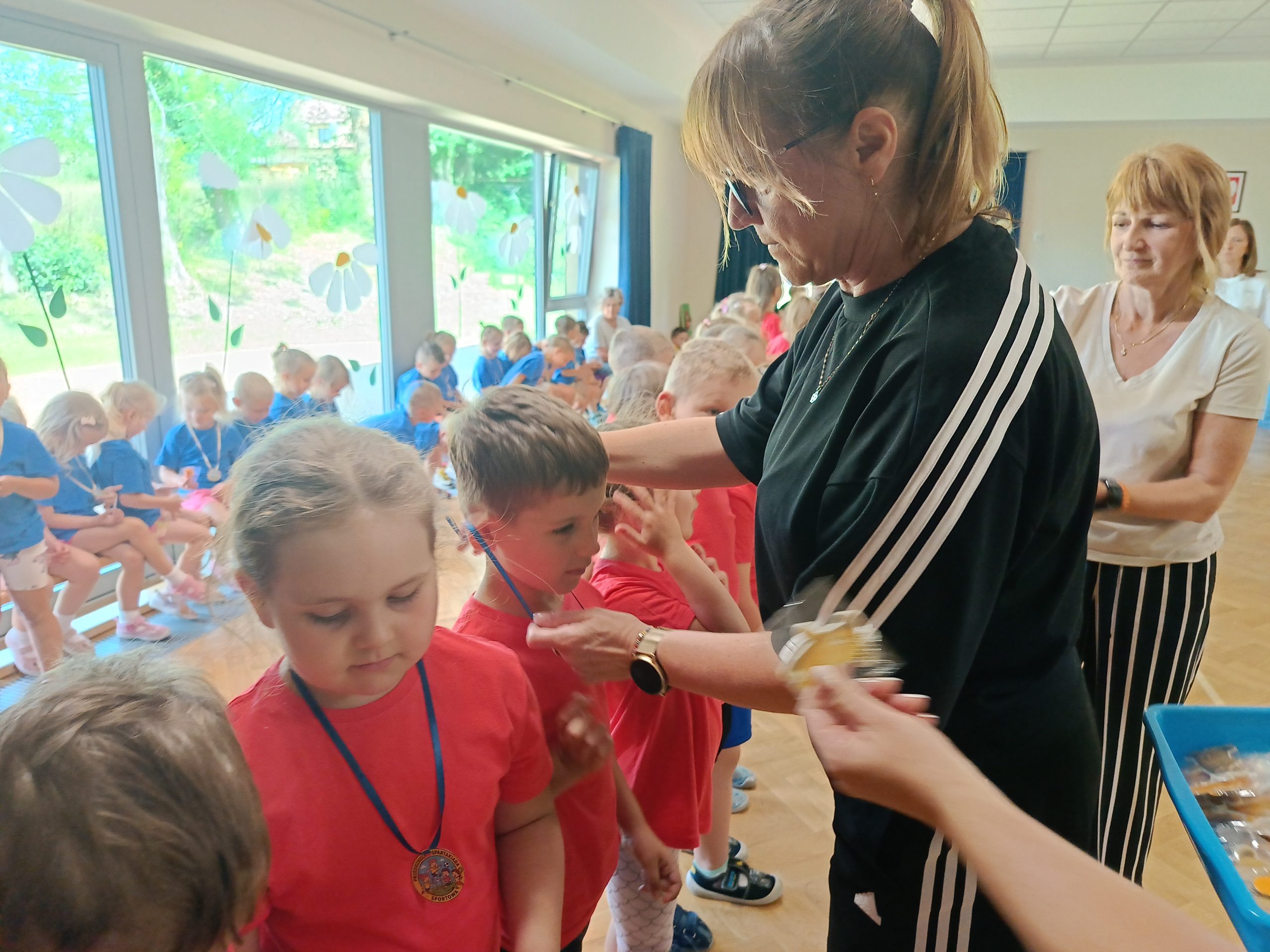 Dzieci dopingowały się nawzajem, a na ich twarzach gościł uśmiech od początku aż do końca wydarzenia. Dla każdego uczestnika przygotowano drobne upominki, ale najważniejszą nagrodą była dla nas dobra zabawa w gronie kolegów i koleżanek z całego przedszkola.