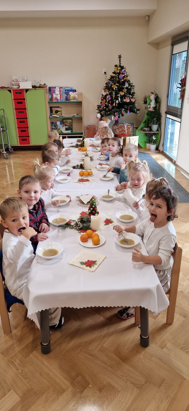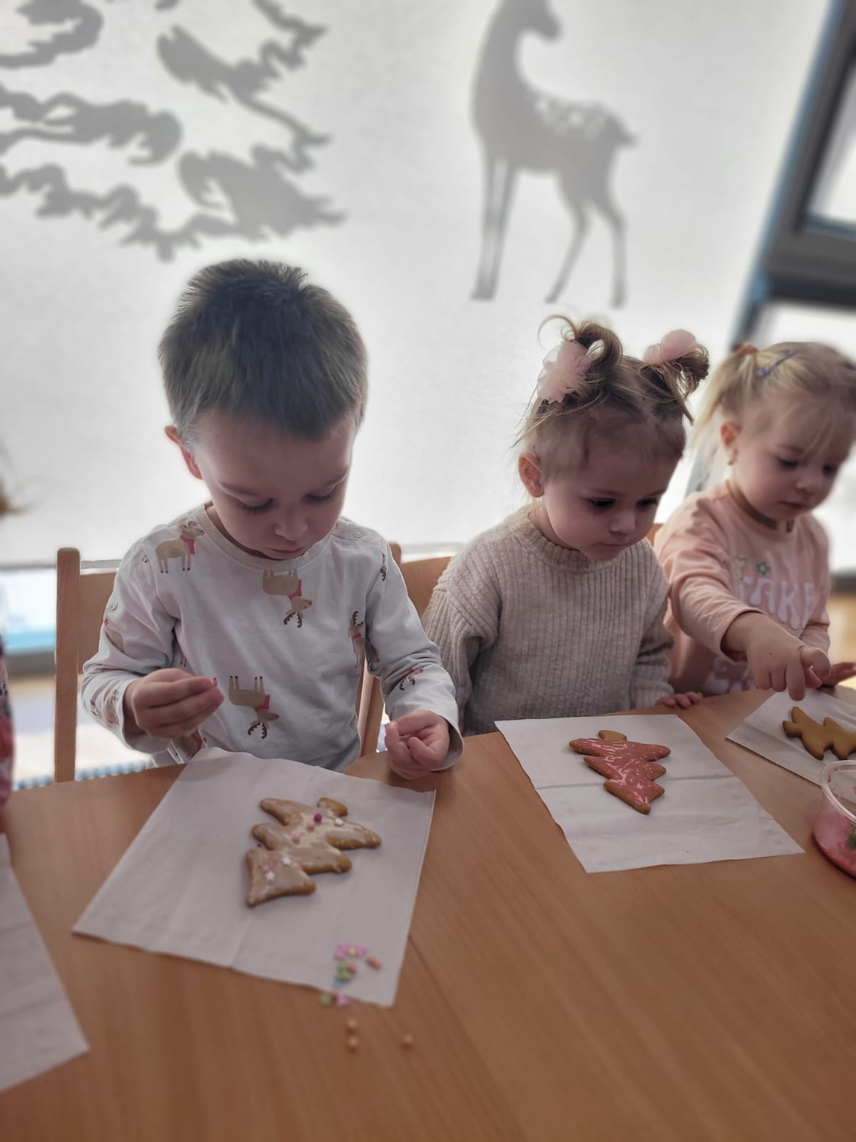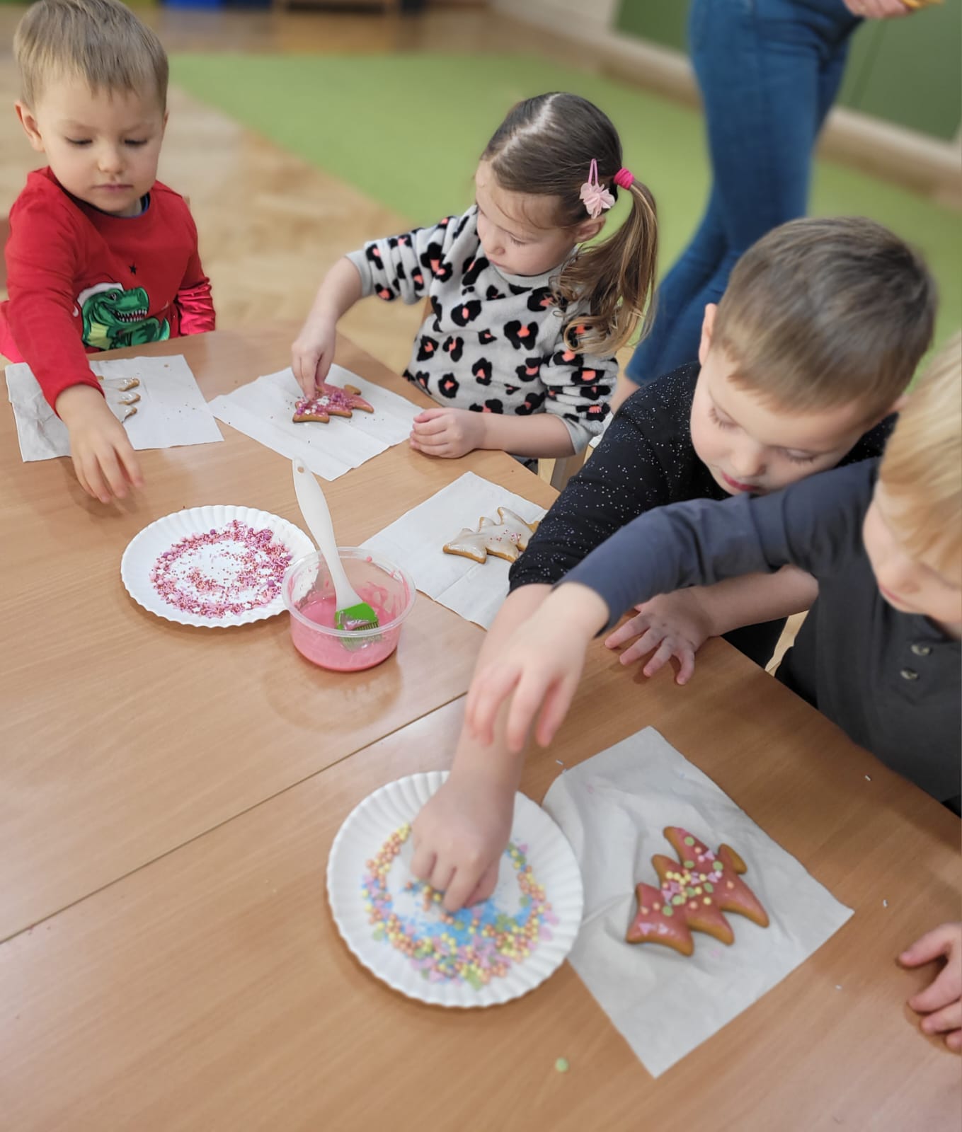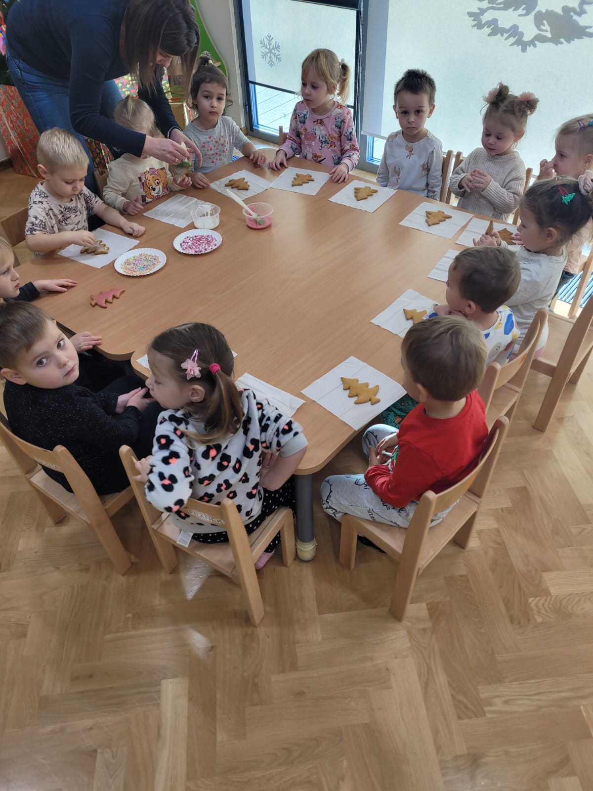 Poprzez realizację tematyki kompleksowej związanej ze Świętami Bożego Narodzenia dzieci pogłębiają swoją wiedzę na temat obyczajów i tradycji bożonarodzeniowych. Głównym motywem zajęć jest mikołaj, choinka, prezenty. Wymienione symbole zbliżających się świąt to także przewodnie motywy prac plastycznych naszych przedszkolaków. Ponadto dzieci z zapałem i dużym zaangażowaniem ozdabiały pierniki.