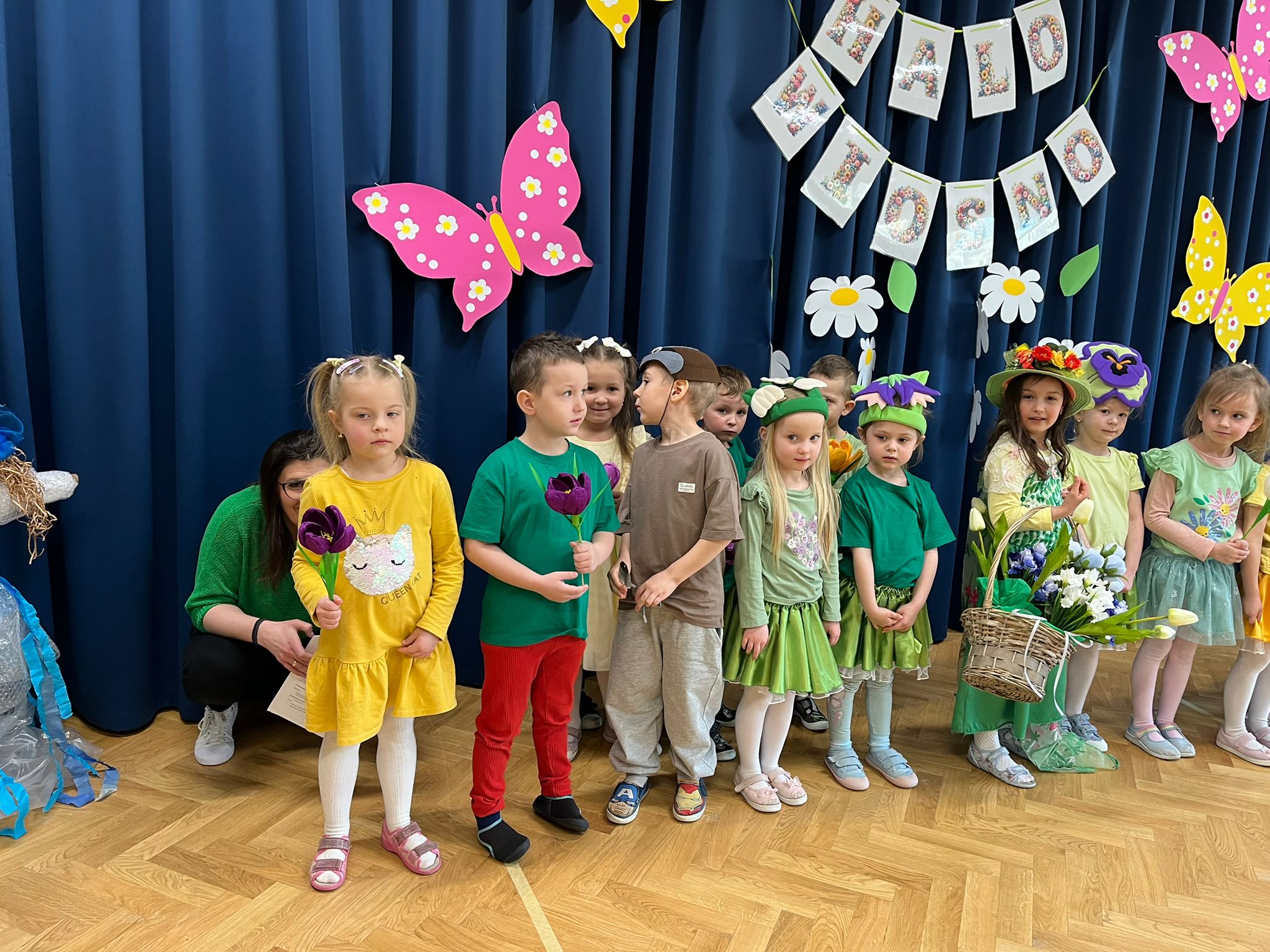 Dzieci przyszły ubrane w radosne kolory żółci i zieleni, wprowadzając wszystkich w prawdziwie wiosenny nastrój.