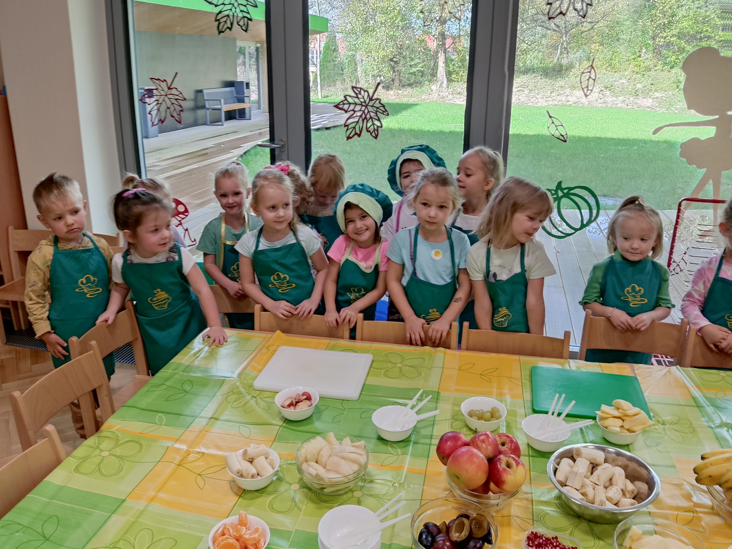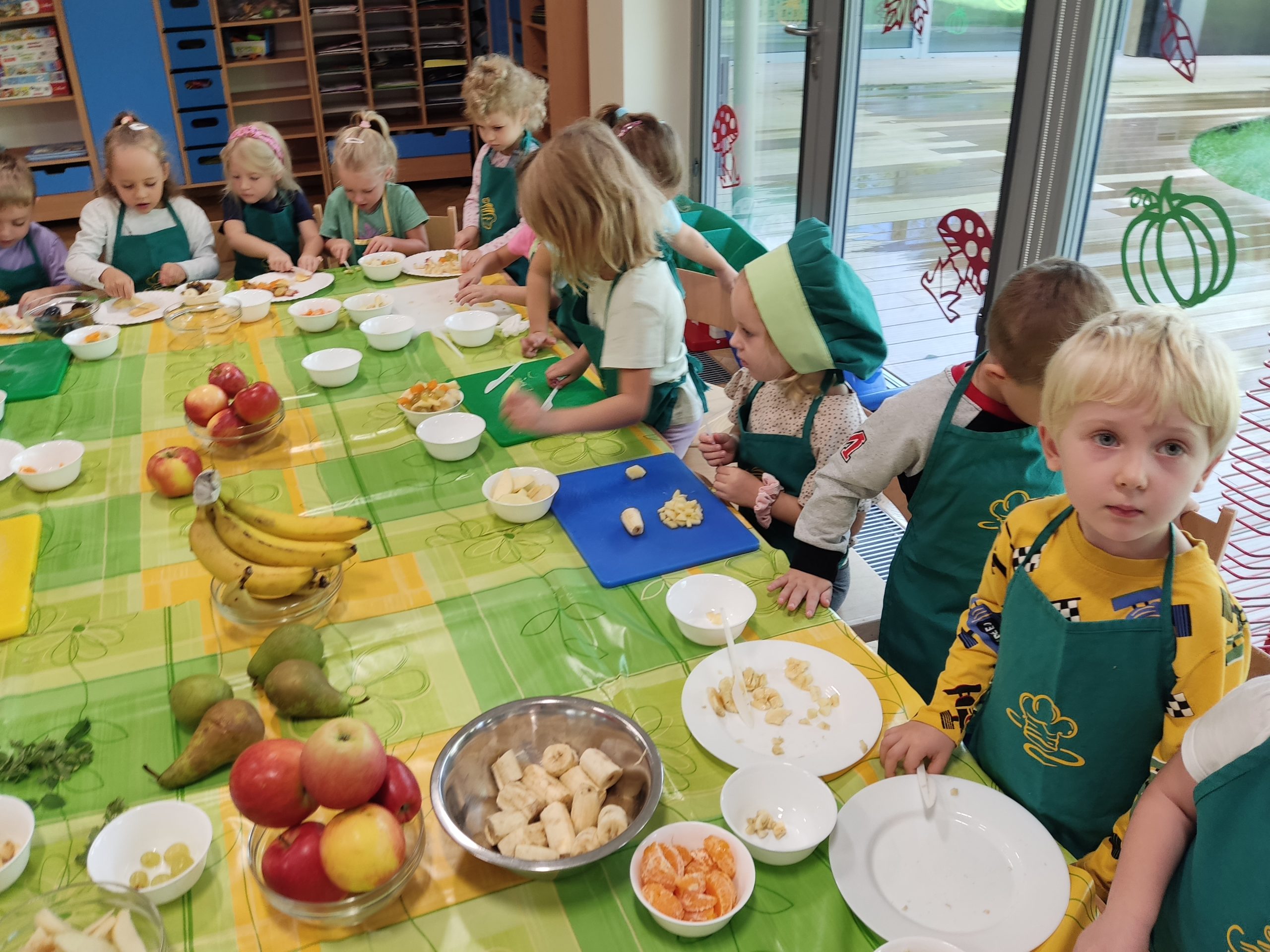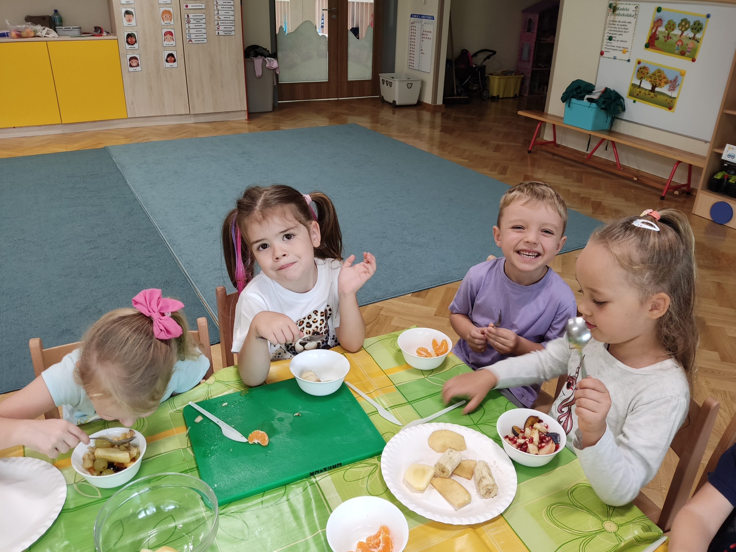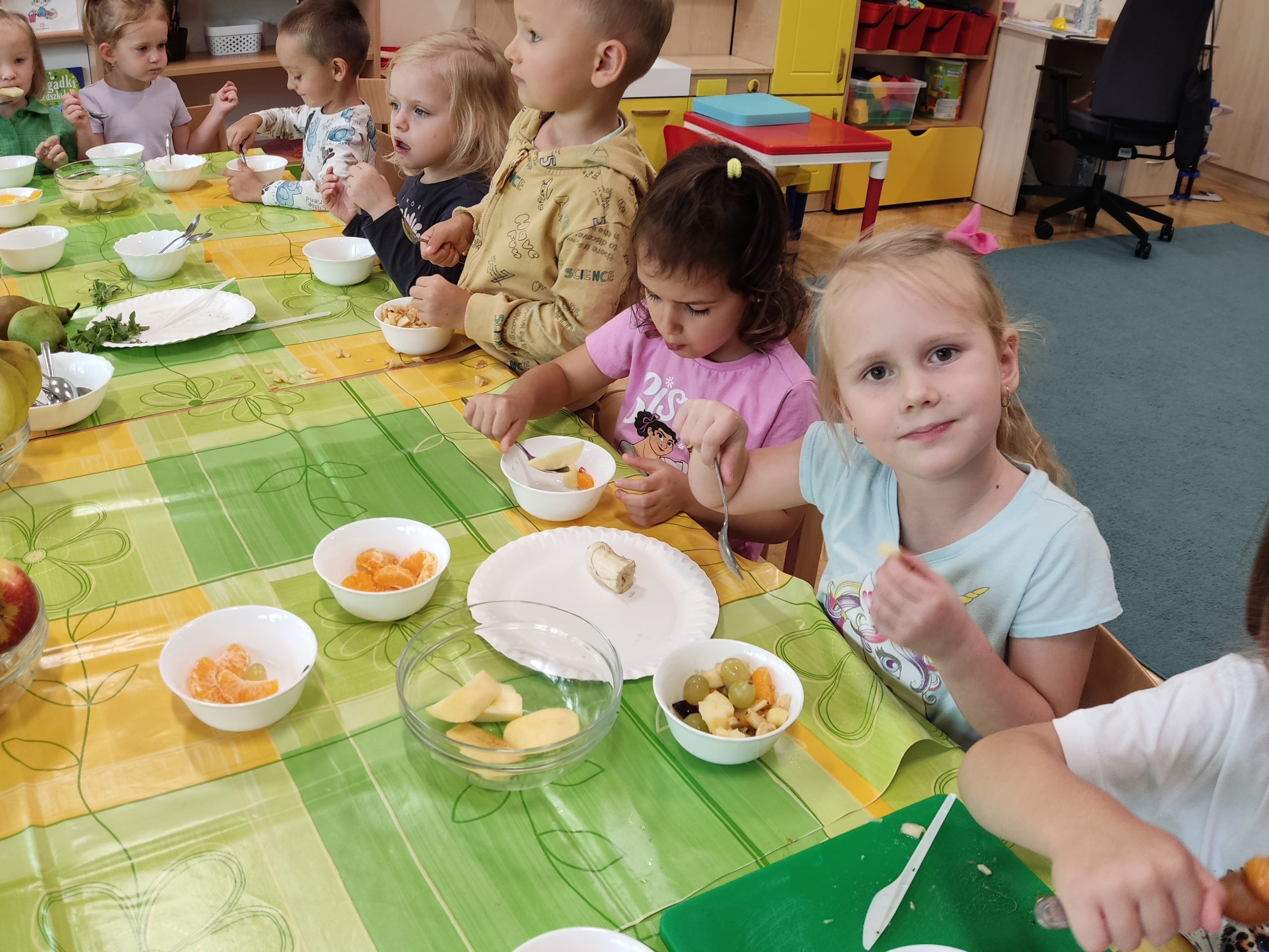 Podczas zajęć dzieci rozpoznawały nazwy owoców za pomocą zmysłów: węchu i smaku. Następnie wybrały, te które im najbardziej smakowały by przygotować pyszną i witaminową sałatkę. Przedszkolaki dokładnie umyły ręce i zabrały się do krojenia owoców. Podczas zajęć dzieci poznały „wybuchowy owoc” – granat. Misie samodzielnie kroiły i przyrządzały sałatkę owocową przestrzegając zasad bezpieczeństwa. Sałatka wyszła wspaniale, była pyszna i zdrowa. Wszyscy zajadali ją ze smakiem.
