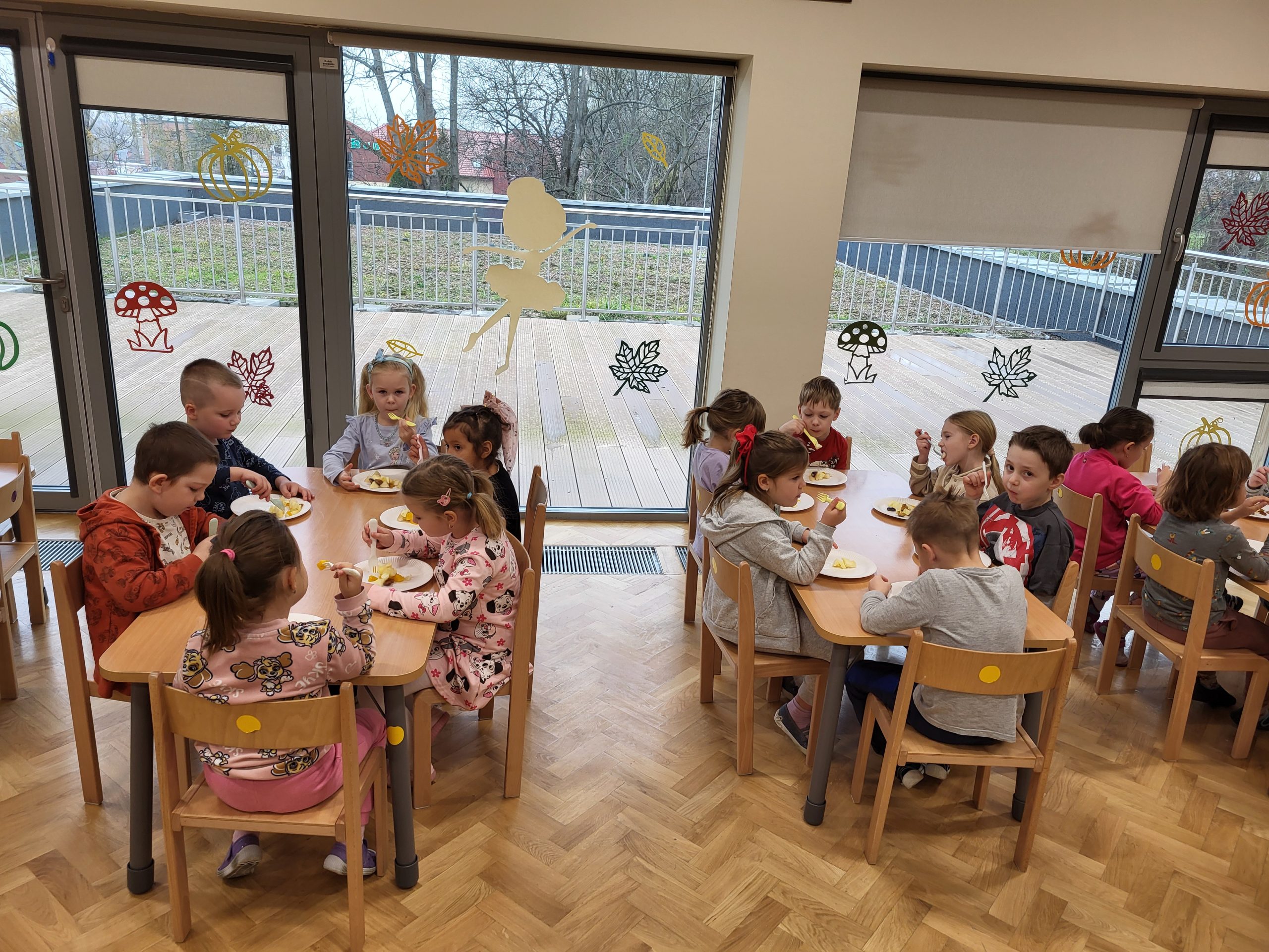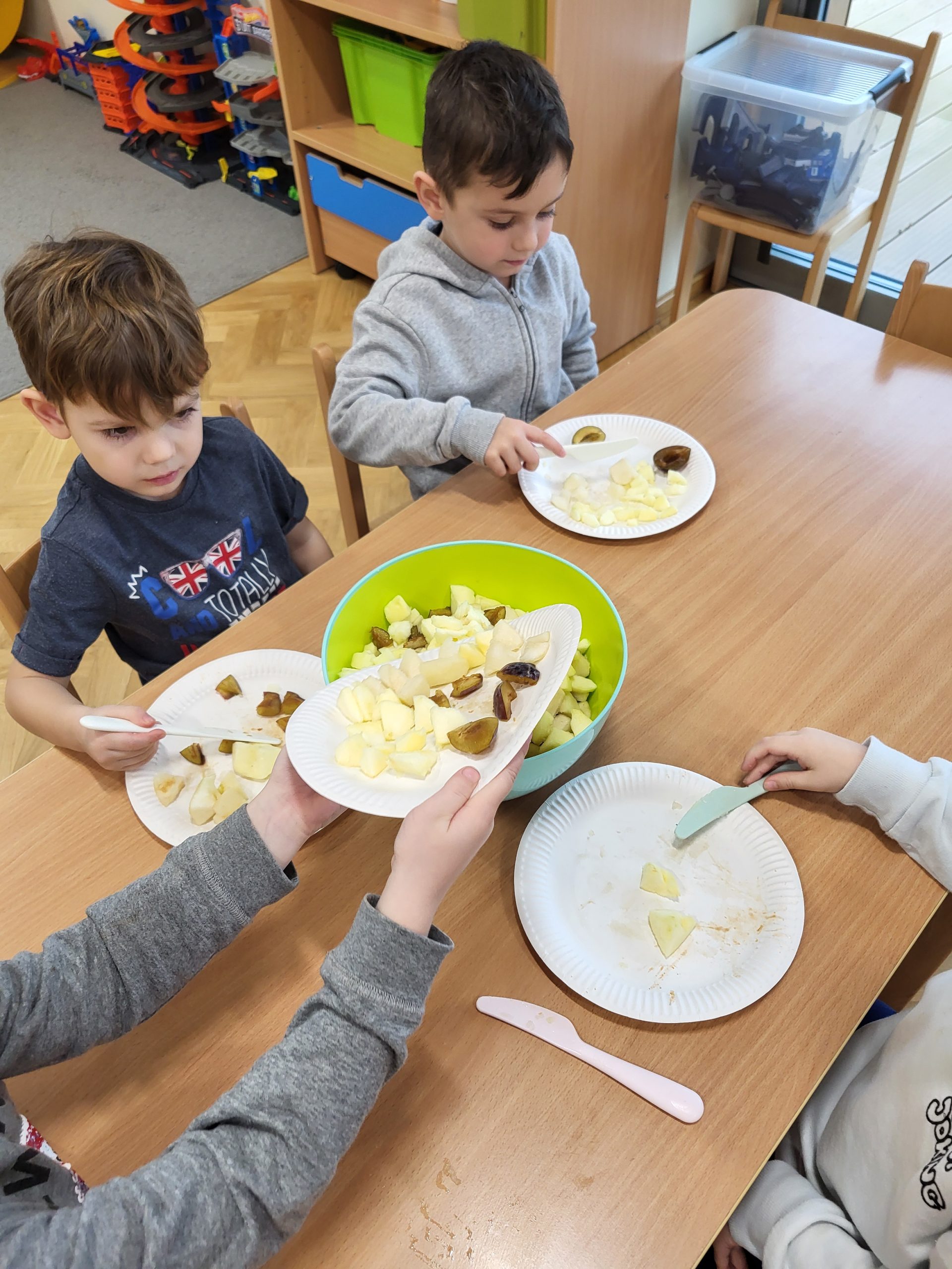 W naszej grupie 23 listopada robiliśmy pyszną sałatkę owocową z polskich owoców w ramach programu „Zdrowie to skarb – dbaj o siebie każdego dnia”. Dzieci bardzo chętnie i z radością uczestniczyły w jej wykonaniu. Taka witaminowa przekąska jest zdrową alternatywą dla słodyczy. Degustacja sałatki była bardzo przyjemna. Dzieciom bardzo smakowały owoce w takiej postaci, tym bardziej, że był to efekt ich pracy. Na zakończenie tych zajęć przedszkolaki stwierdziły, że będą ją robiły też w domu. Było smacznie i zdrowo.