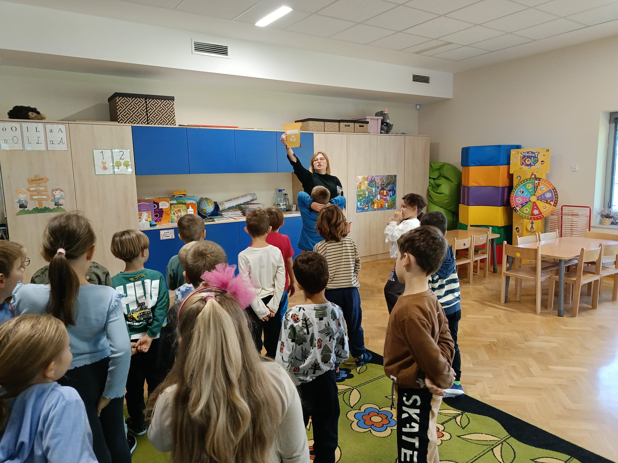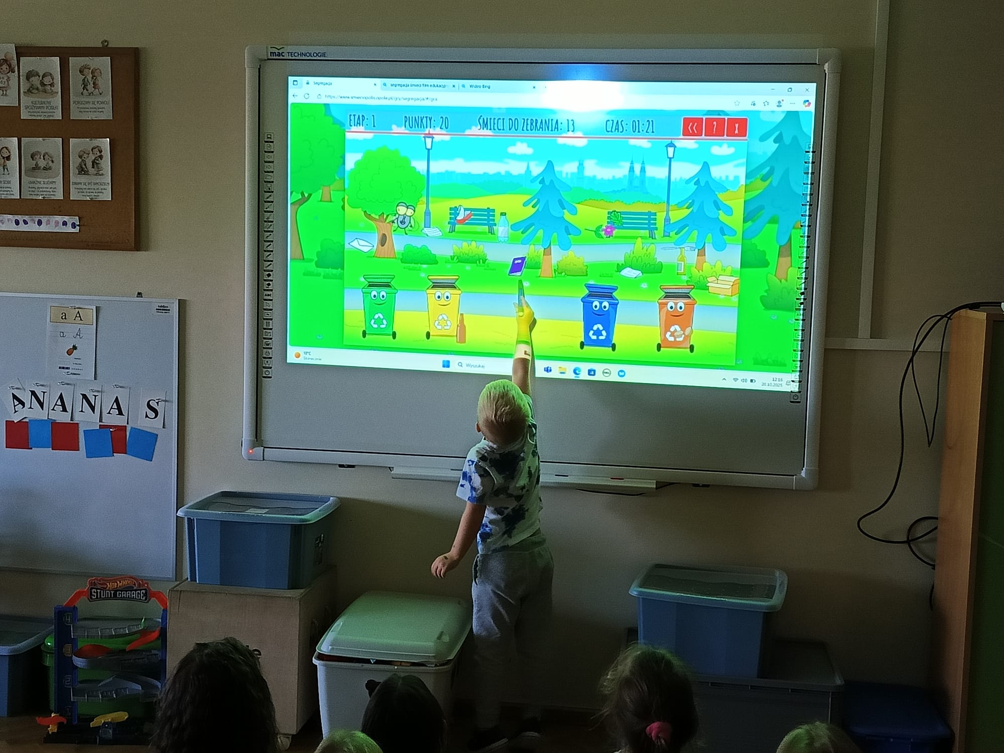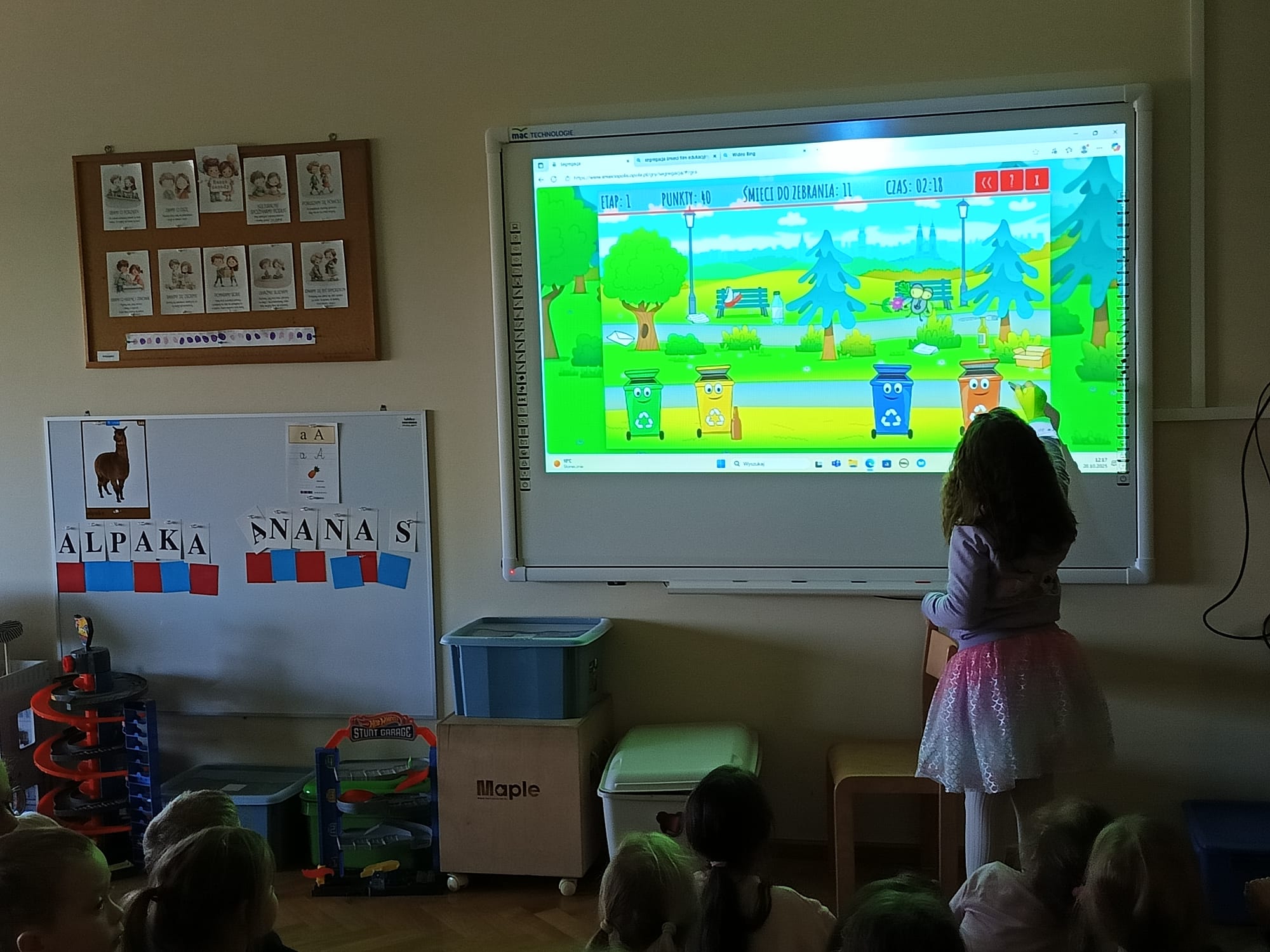 Podczas zajęć przedszkolaki obejrzały film edukacyjny „Segregacja śmieci dla dzieci”, a następnie wspólnie omówiły, jakie są rodzaje koszy i co można do nich wrzucać. Kolejnym etapem była gra multimedialna „Śmieciopolis”, dzięki której dzieci utrwaliły zdobytą wiedzę w atrakcyjny i nowoczesny sposób.