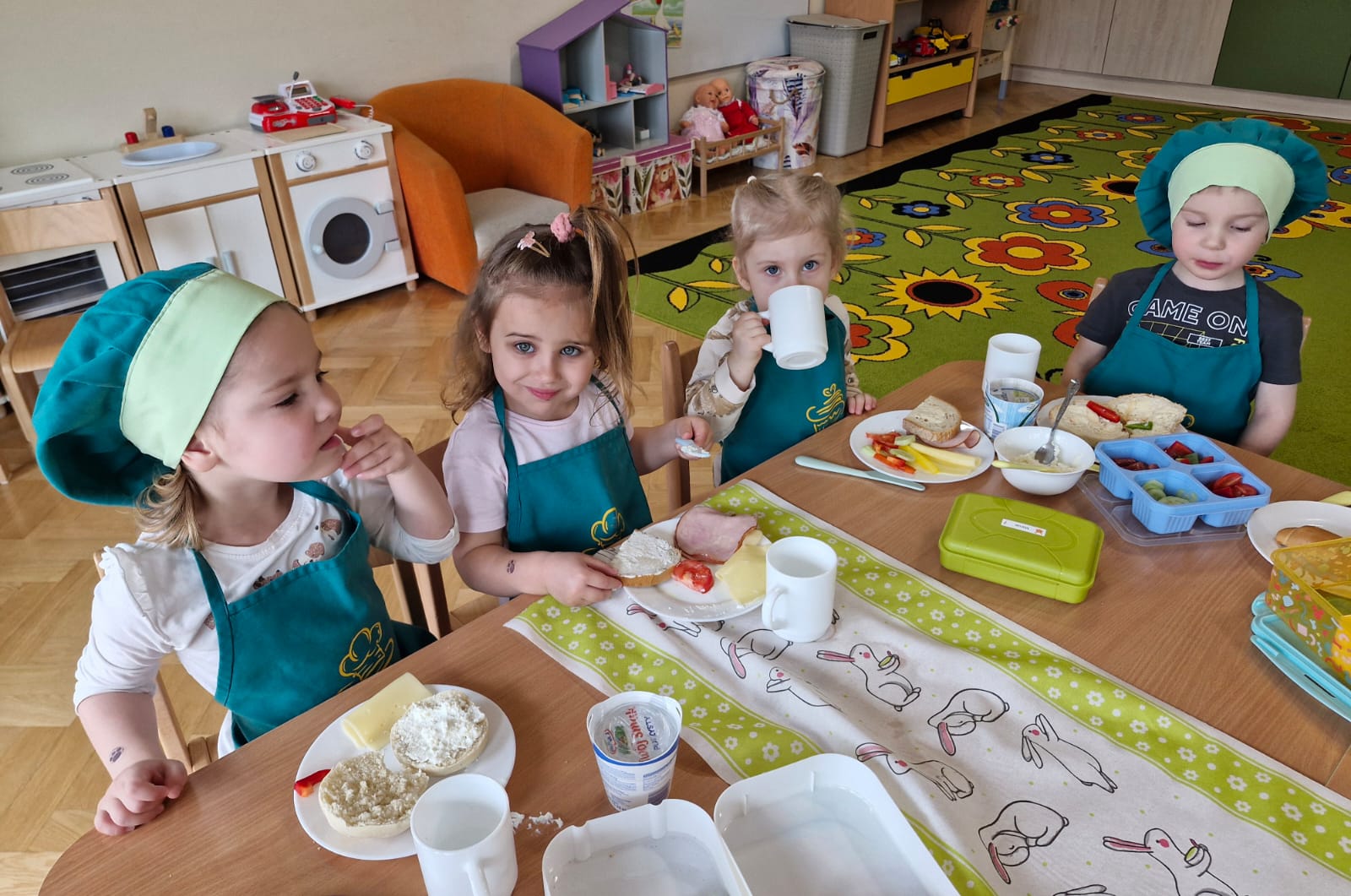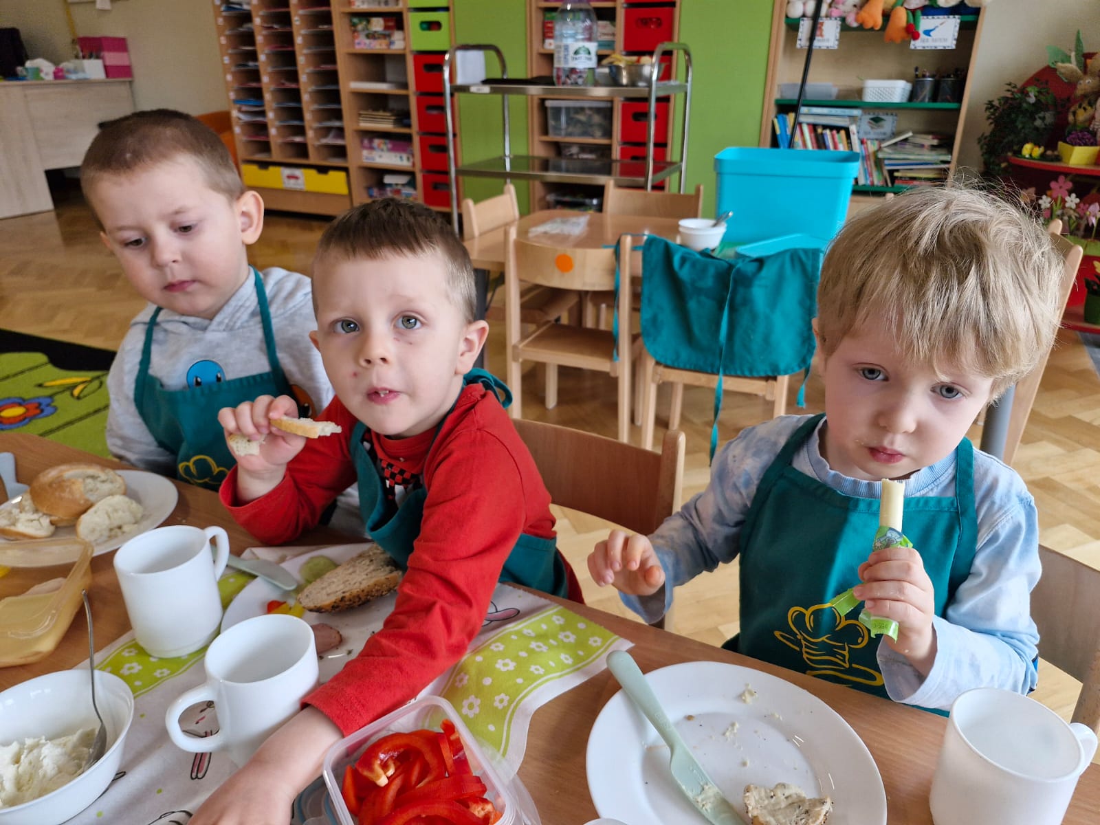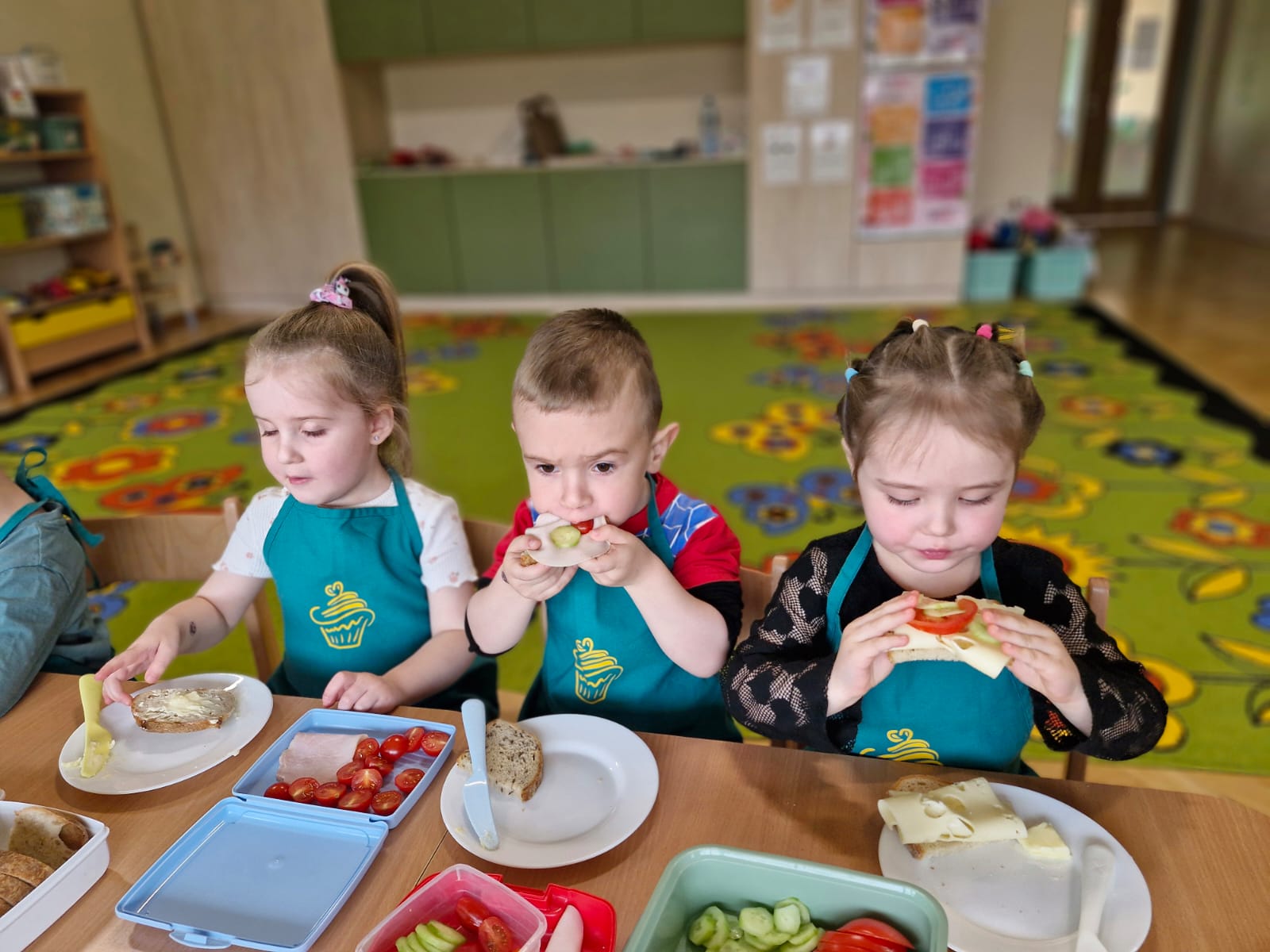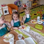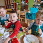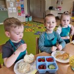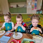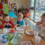 Dziś w naszym przedszkolu było naprawdę smacznie! W ramach innowacji pedagogicznej „Kraina Zmysłów – sensoryczna podróż przez świat natury” odbyło się niezwykłe śniadanie. Dzieci samodzielnie przygotowywały swoje kanapki, wybierając ulubione składniki i komponując je według własnych pomysłów. Jeżyki z apetytem próbowały, kroiły i degustowały, ćwicząc przy tym samodzielność oraz prawidłowe posługiwanie się sztućcami. Przedszkolaki z ogromnym zaangażowaniem tworzyły swoje kanapki, a satysfakcja z własnoręcznie przygotowanego posiłku była bezcenna. Nie zabrakło też uśmiechów i radości przy wspólnym stole. Takie chwile to nie tylko jedzenie, ale również ważna nauka – zdrowych nawyków, kultury spożywania posiłków oraz wspólnego spędzania czasu. Smacznie, zdrowo i z uśmiechem – tak właśnie jemy w naszym przedszkolu!