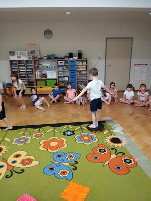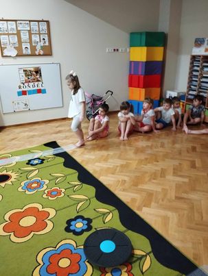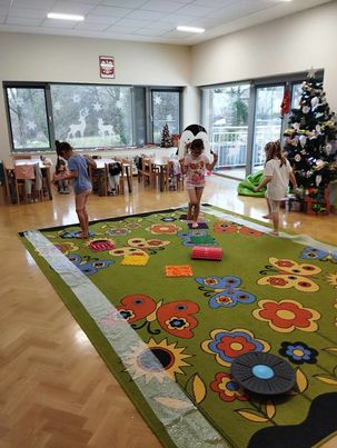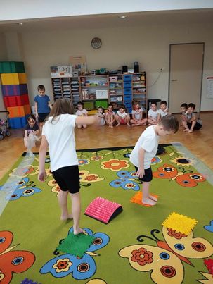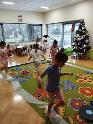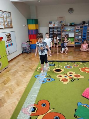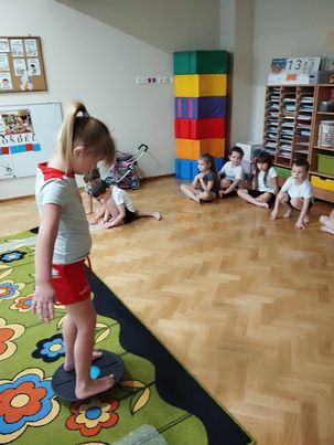 Podczas ćwiczeń gimnastycznych dzieci z naszej grupy miały za zadanie pokonać specjalnie dla nich przygotowany tor przeszkód. Między innym znajdowały się tam: ścieżka sensoryczna, dyski sensoryczne, folia bąbelkowa. Wszystkie ćwiczenia dzieci wykonywały z dużym zaangażowaniem i uśmiechem. Bardzo podobała im się taka forma ćwiczeń.