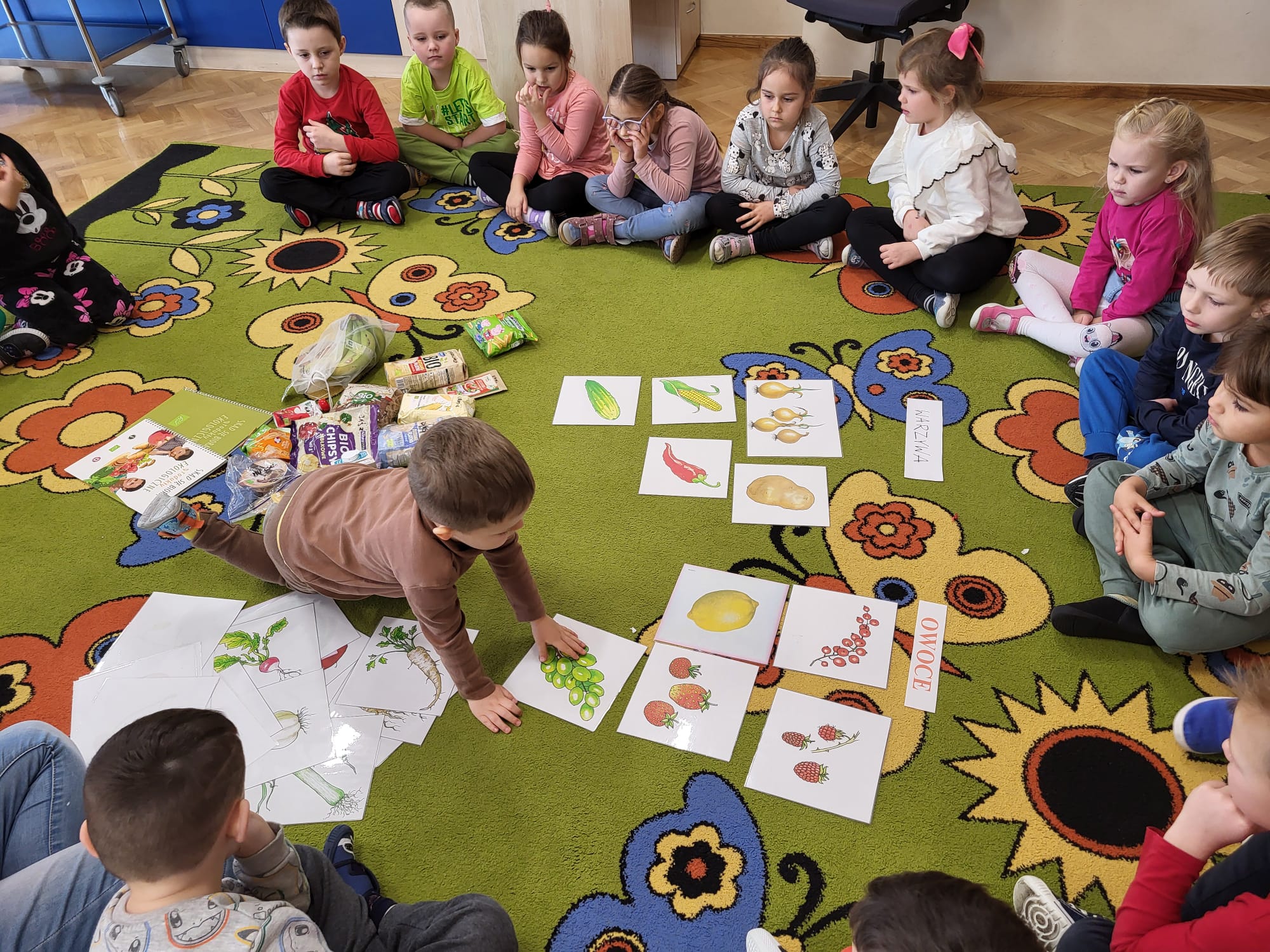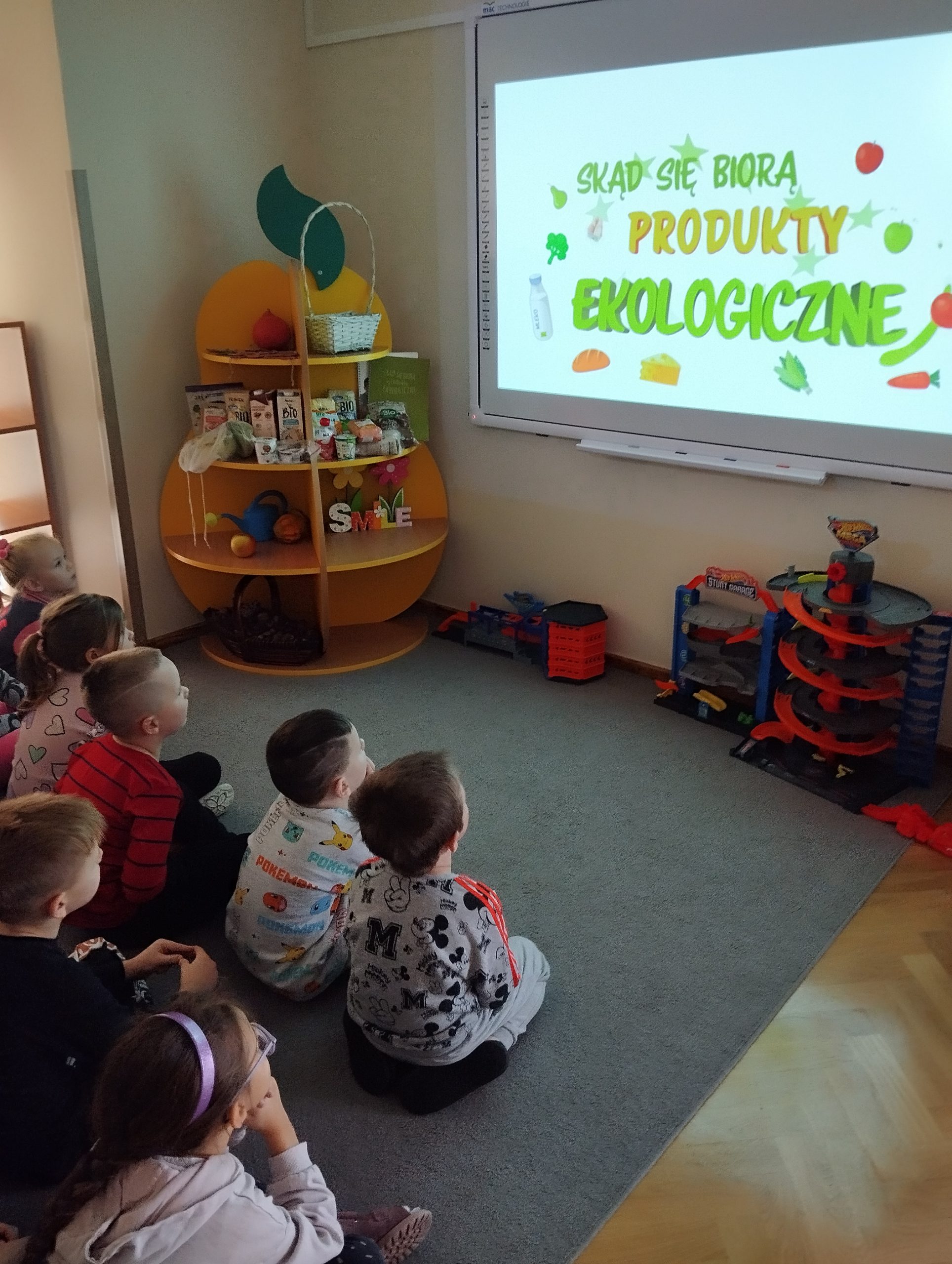 Nasza grupa przystąpiła do udziału w projekcie „Skąd się biorą produkty ekologiczne?”. Każde dziecko przyniosło do sali produkt ze znaczkiem EKO. Wspólnie wykonaliśmy wystawkę z tych produktów. Następnie powstał plakat dotyczący żywności Jaka może ona być? Kolejnym krokiem było obejrzenie filmu, a zadaniem dzieci było zaobserwowanie skąd pochodzą takie produkty, na które przyklejane są znaczki. Usłyszały, że EKO oznacza naturalne, czyli takie, które nie ma żadnych sztucznych, niezdrowych dodatków. Zapoznały się z Piramidą Żywienia, przypomniały sobie co należy robić, aby prowadzić zdrowy styl życia, a następnie wykonały taką piramidę. Kolejnym krokiem było wykonanie z produktów ekologicznych sałatki owocowej.