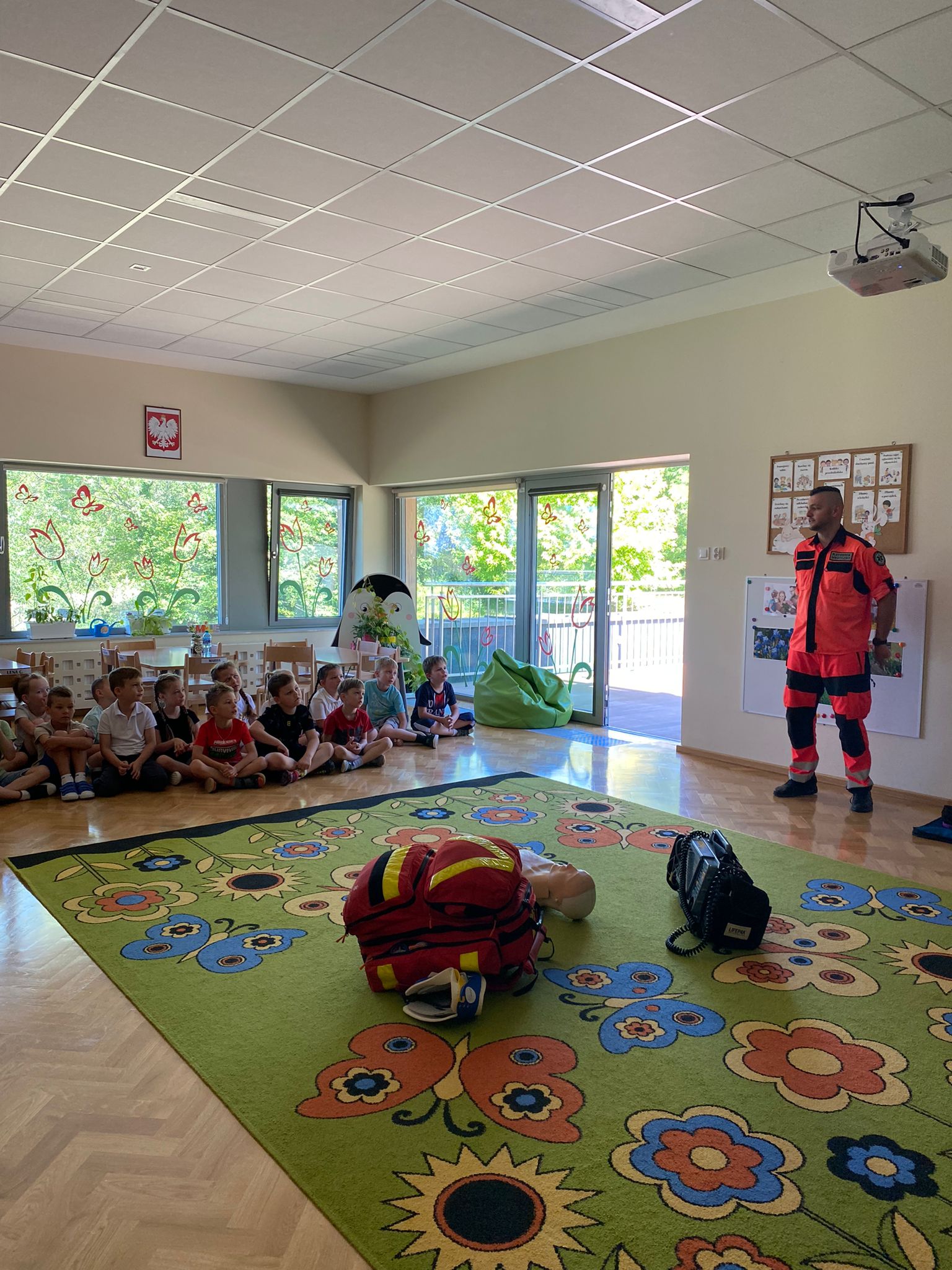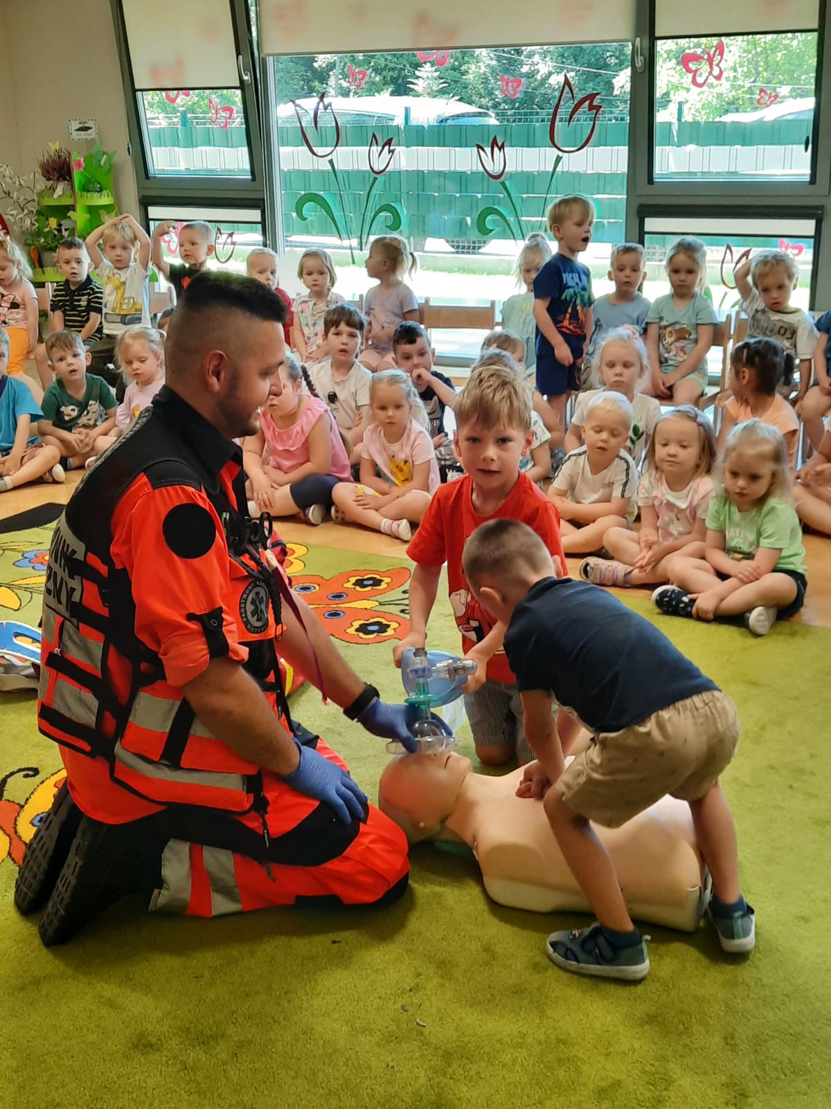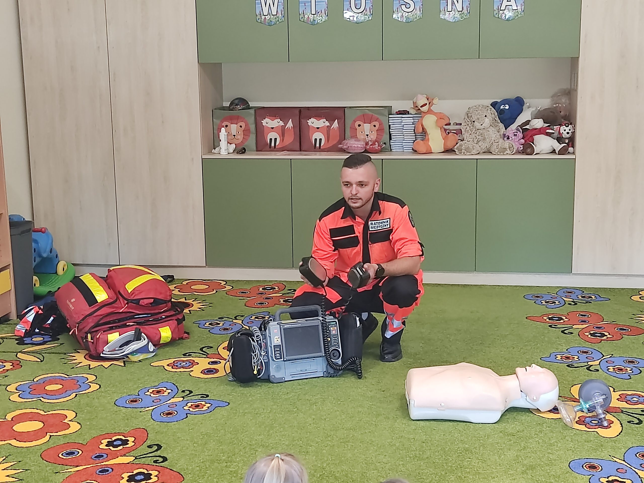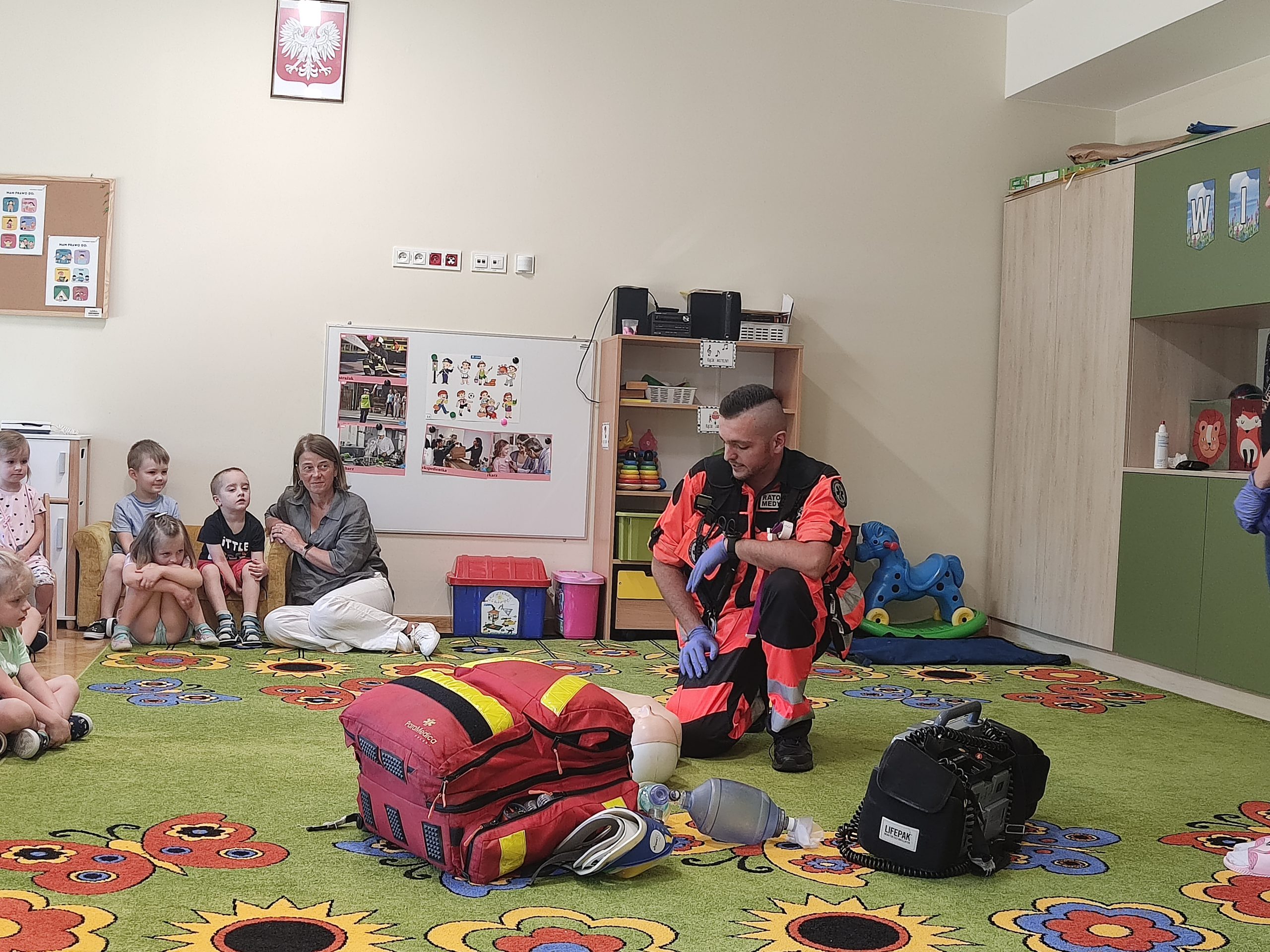 Przedszkolaki obejrzały strój ratownika i wysłuchały informacji na temat udzielania pierwszej pomocy. Dowiedziały się, w jaki sposób zgłaszać wypadek, jakie informacje podawać dyspozytorowi. Uświadomiły sobie jak ważna jest znajomość swojego adresu zamieszkania. Utrwaliły znajomość numerów alarmowych do pogotowia ratunkowego, straży pożarnej i policji oraz numeru ogólnoeuropejskiego 112. Dowiedziały się jak należy sprawdzić przytomność osoby poszkodowanej oraz jak pomóc zanim przyjedzie pogotowie ratunkowe. Podczas zorganizowanego spotkania, dzieci mogły poczuć się jak mali ratownicy. Poznały podstawowe zabiegi resuscytacyjne na miarę swoich możliwości, ćwicząc na fantomie.