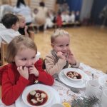 Dnia 20 grudnia „Zajączki” udały się na w odświętnych strojach na przedszkolne spotkanie wigilijne. Oglądnęliśmy piękny występ jasełkowy w wykonaniu starszaków, po czym składaliśmy sobie życzenia świąteczne. Wszystkie przedszkolaki zjadły wspólny obiad wigilijny, po którym kolędowaniu nie było końca!