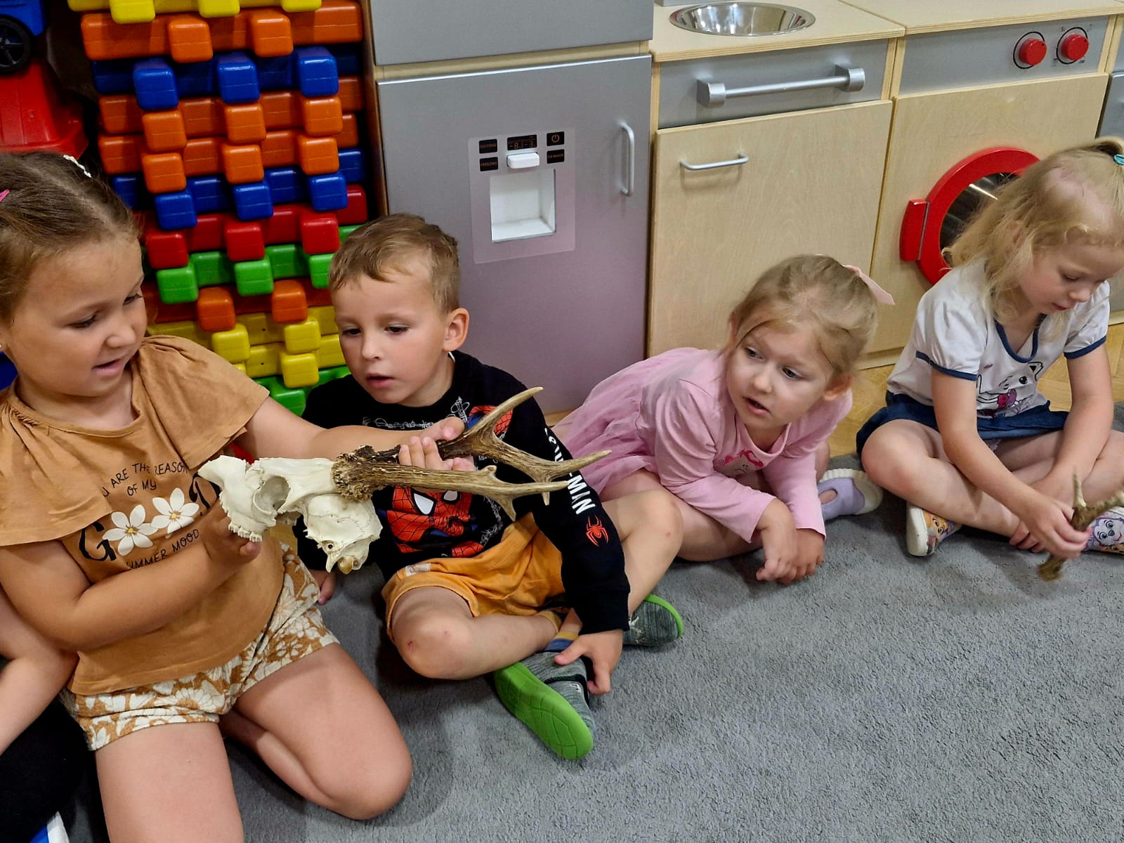 Przedszkolaki z zaciekawieniem oglądały zdjęcia, poroża oraz tropy zwierząt, a także zadawały mnóstwo pytań naszemu gościowi. Na zakończenie każdy mógł dotknąć leśnych eksponatów i sprawdzić, jak ciężkie jest poroże jelenia.