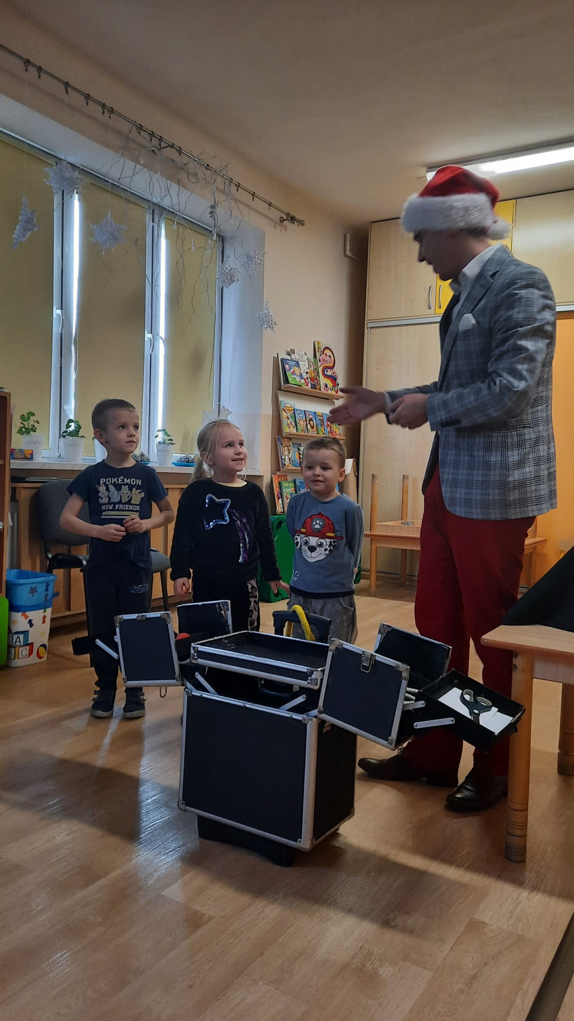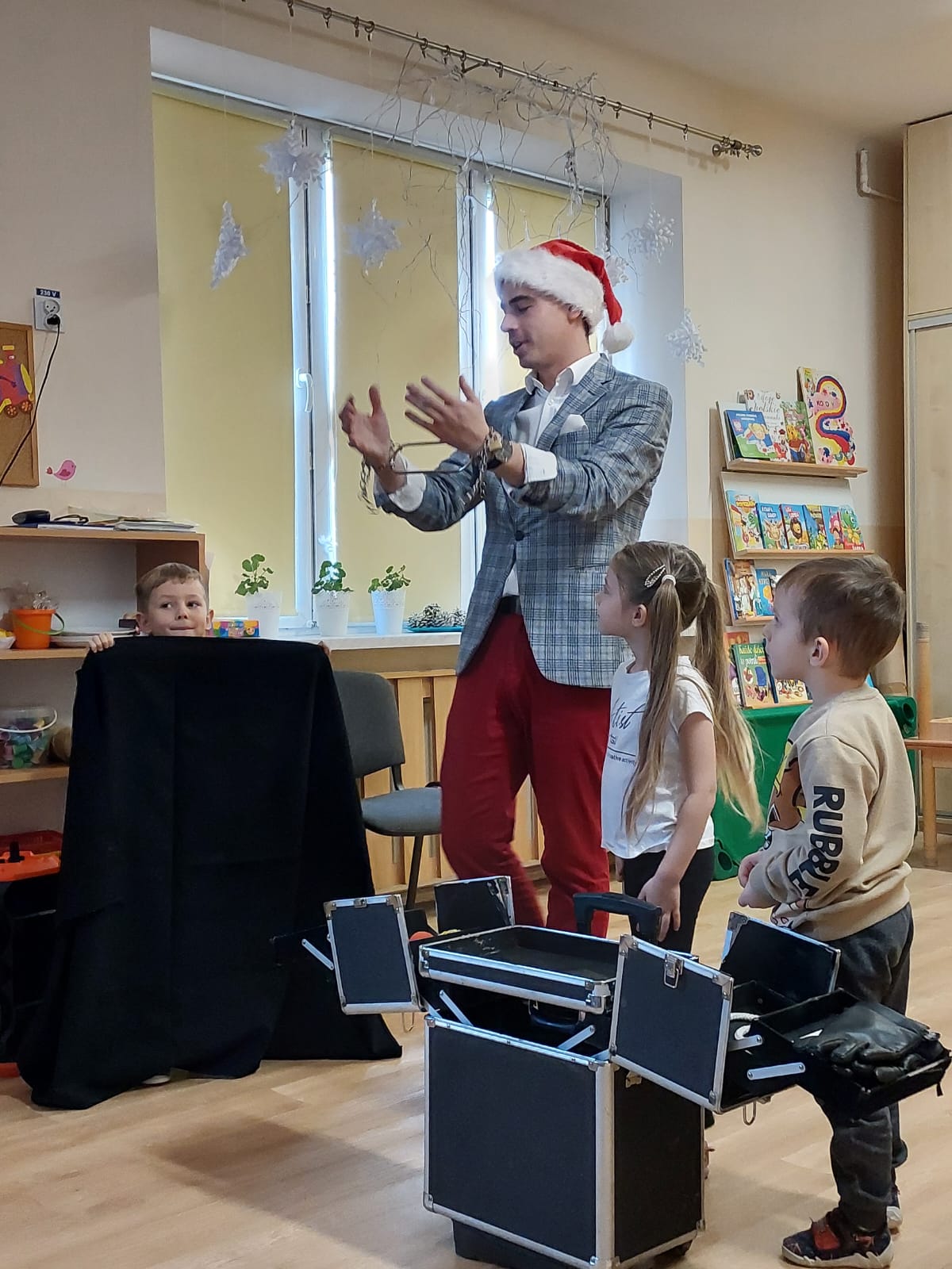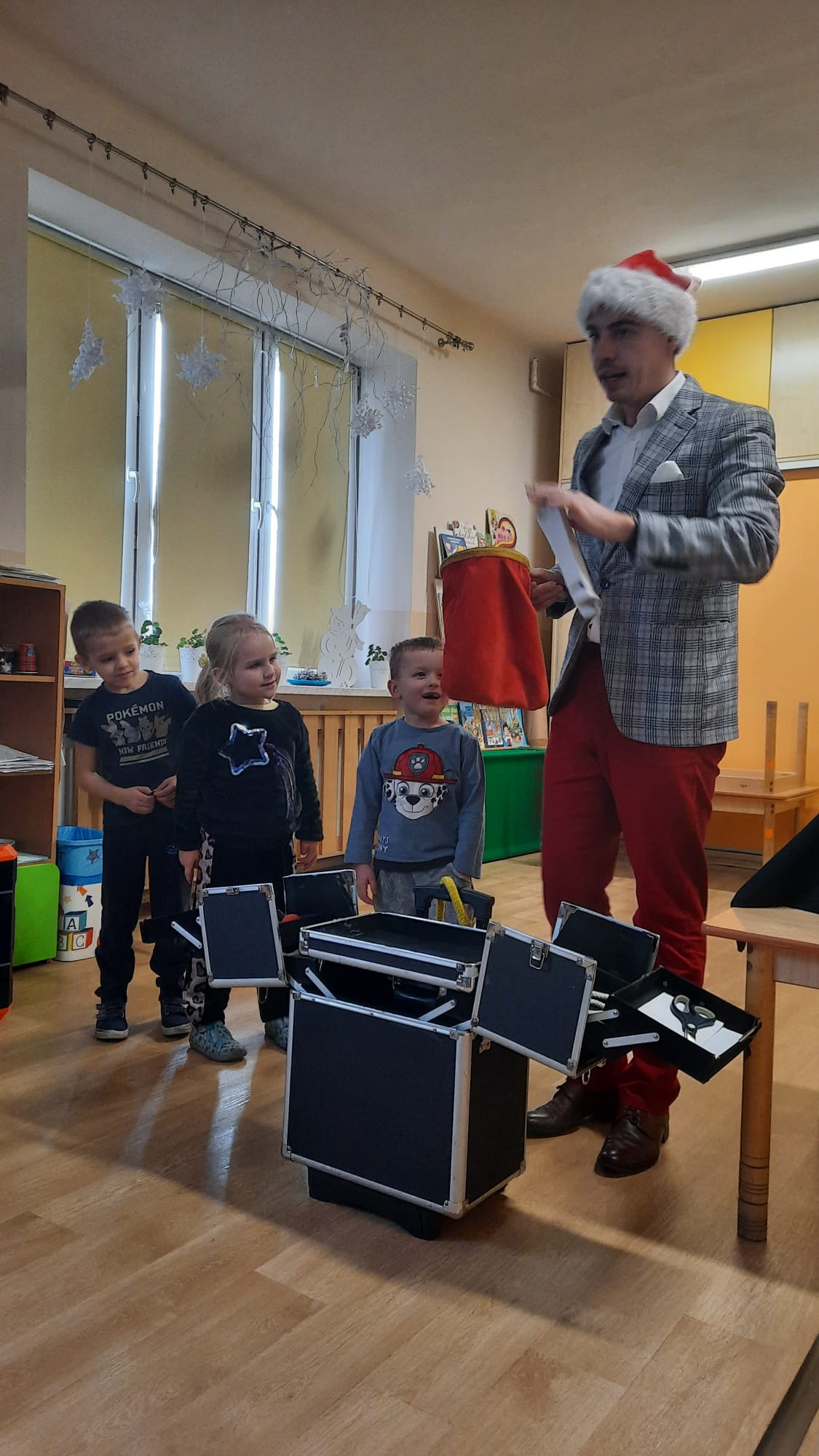 W dniu 14 grudnia odwiedził nasze przedszkole prawdziwy magik, co było bez wątpienia wielką atrakcją dla przedszkolaków. Pokaz magii i iluzji przygotowany był z myślą o przedszkolakach. Podczas występu dzieci zapraszane były na scenę, aby pomóc magikowi. Magik wprowadził wszystkich we wspaniały humor. Dzieci z dużym zaangażowaniem obserwowały każdy ruch iluzjonisty, aby nauczyć się choć jednej sztuczki lub poznać sposób jej wykonania. Wspaniały występ iluzjonisty niewątpliwie zapadnie dzieciom głęboko w pamięci.