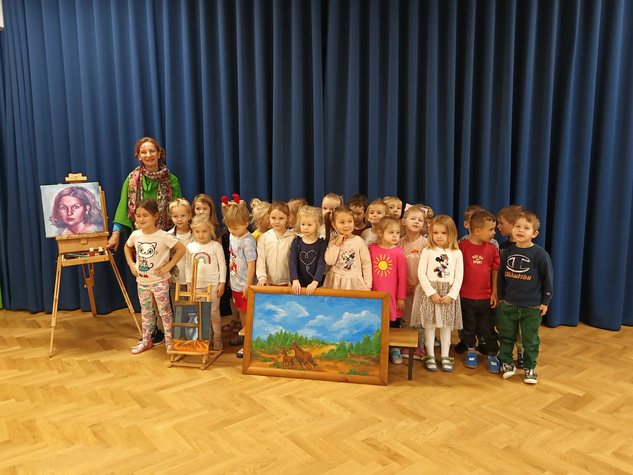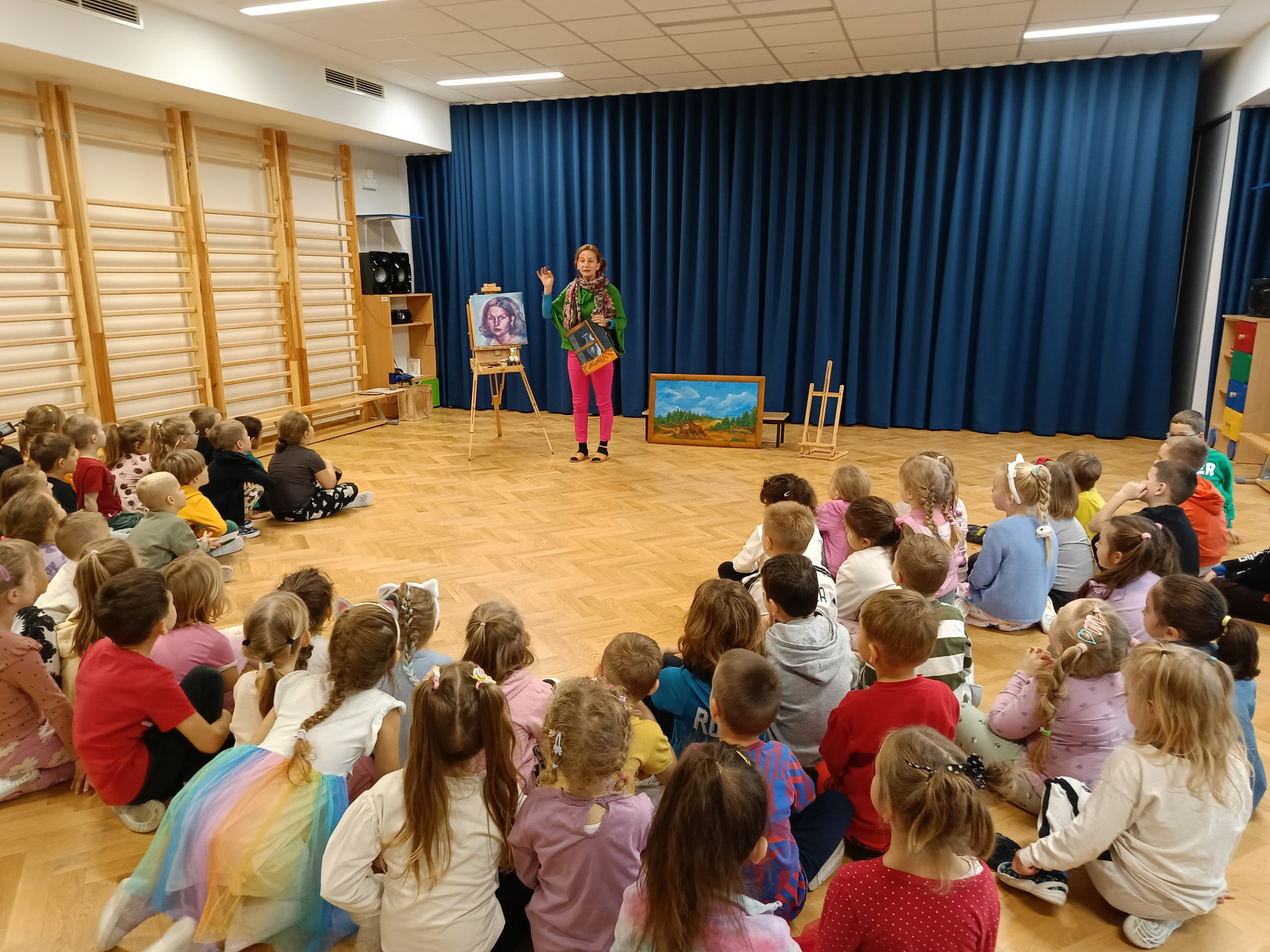 Pani Agnieszka zaprezentowała swoje obrazy, a także zdradziła kilka tajemnic swojego warsztatu. Przedszkolaki mogły zobaczyć, jakie techniki i narzędzia wykorzystuje artysta, na jakich powierzchniach powstają obrazy, jakie są rodzaje pędzli i farb, oraz jak w magiczny sposób mieszać kolory, by tworzyć nowe barwy.