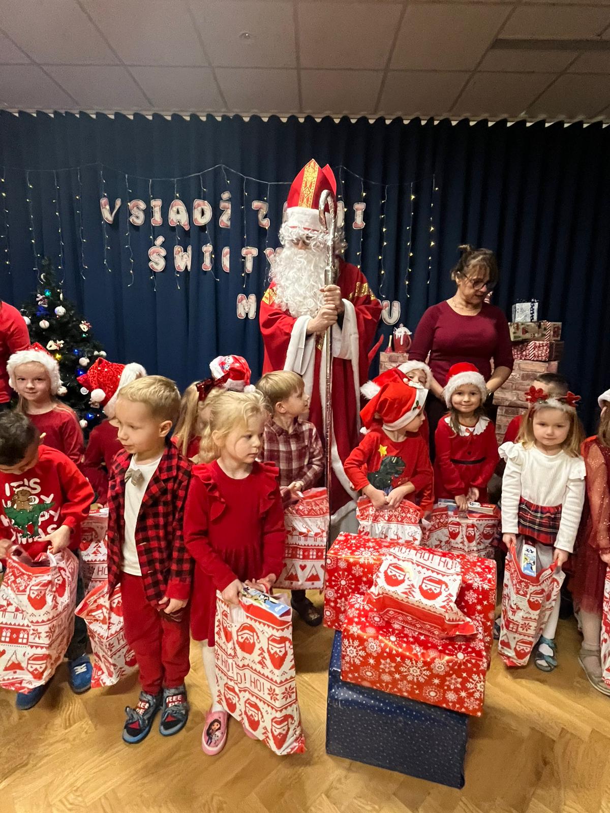 Po części artystycznej nadszedł najważniejszy moment – rozdanie prezentów. Każde dziecko odebrało upominek a na twarzach „Misiów” pojawiły się szerokie uśmiechy. Mikołaj chętnie pozował również do wspólnych zdjęć, dzięki czemu spotkanie pozostawiło wiele miłych wspomnień.