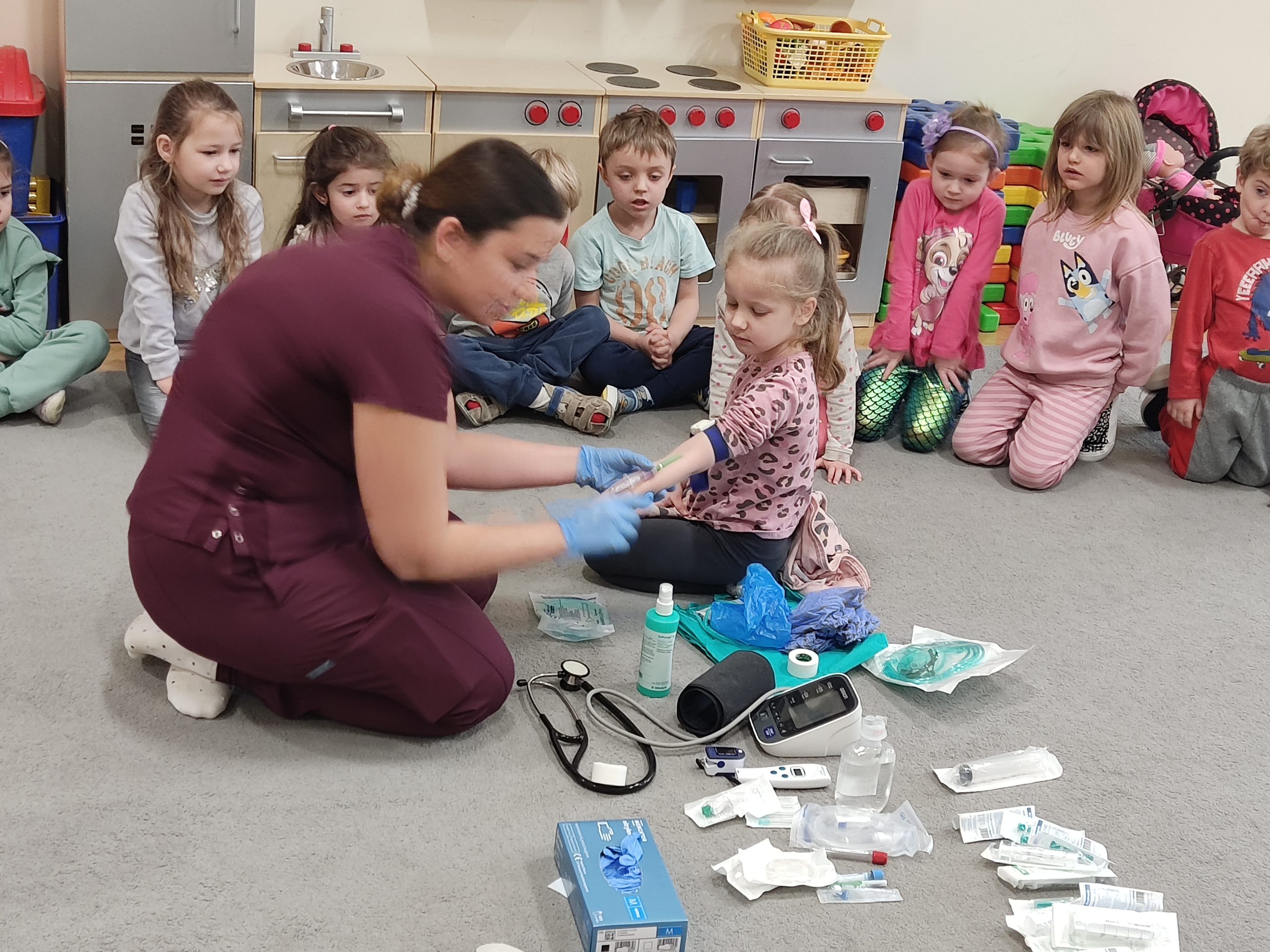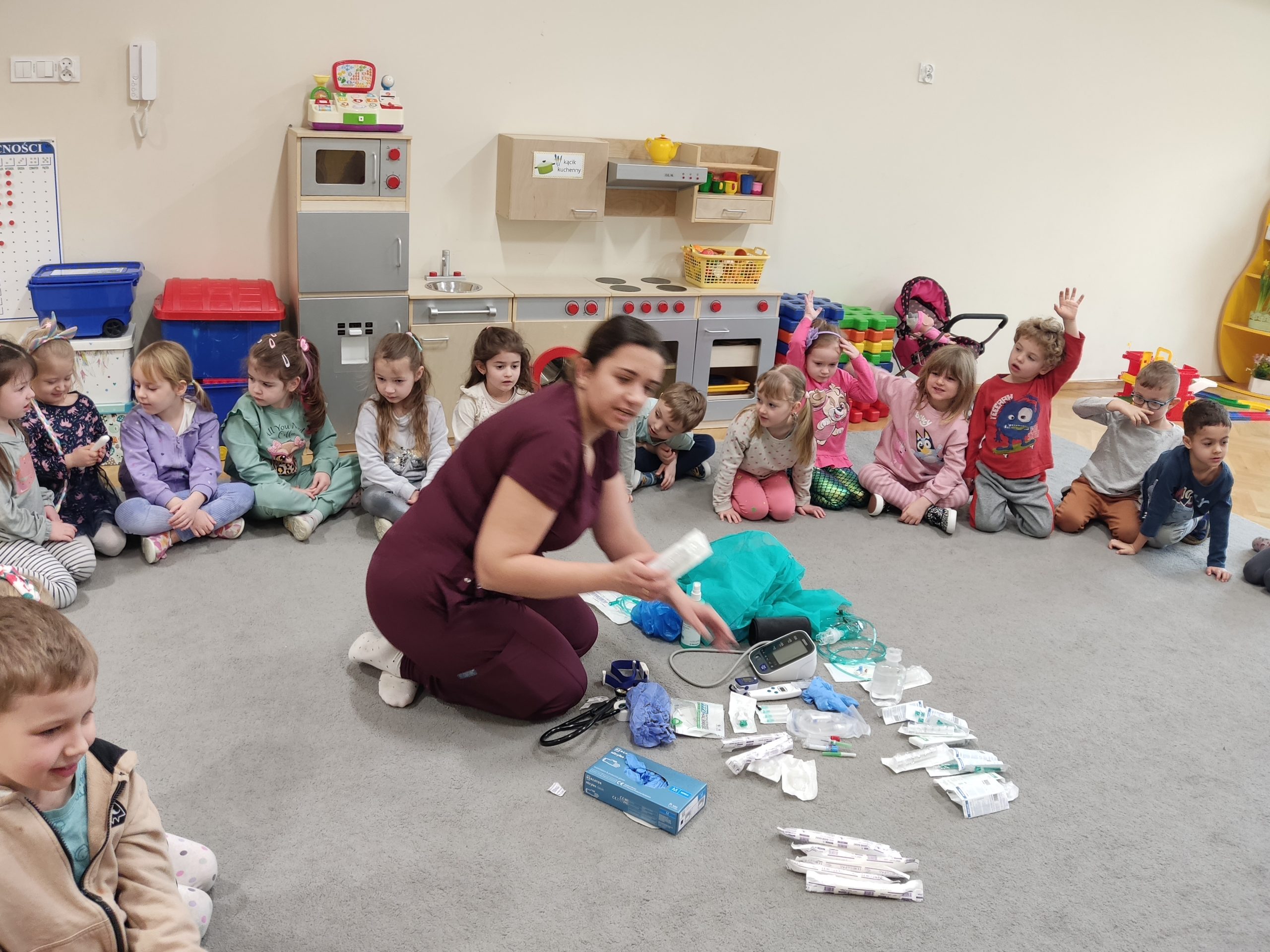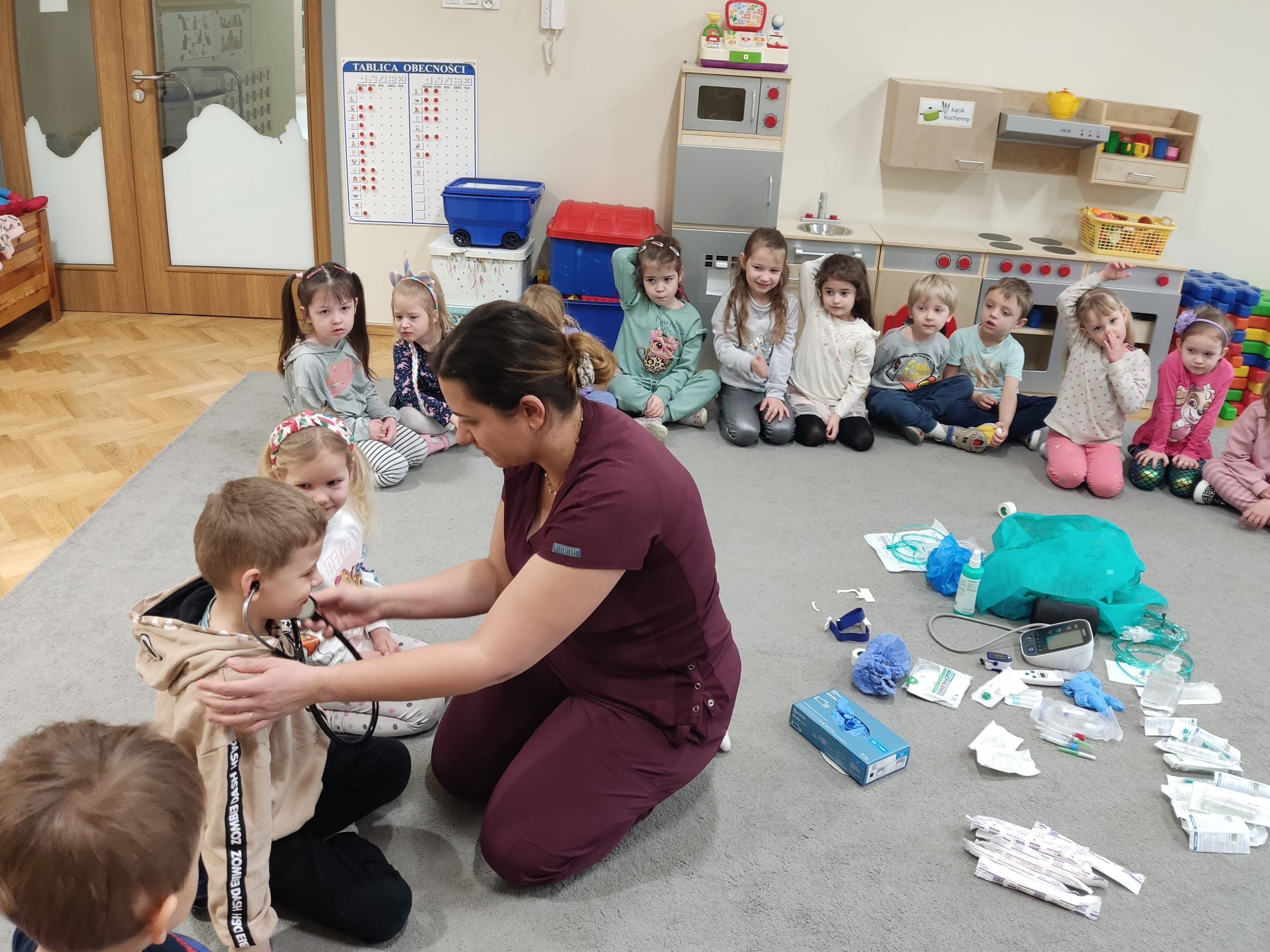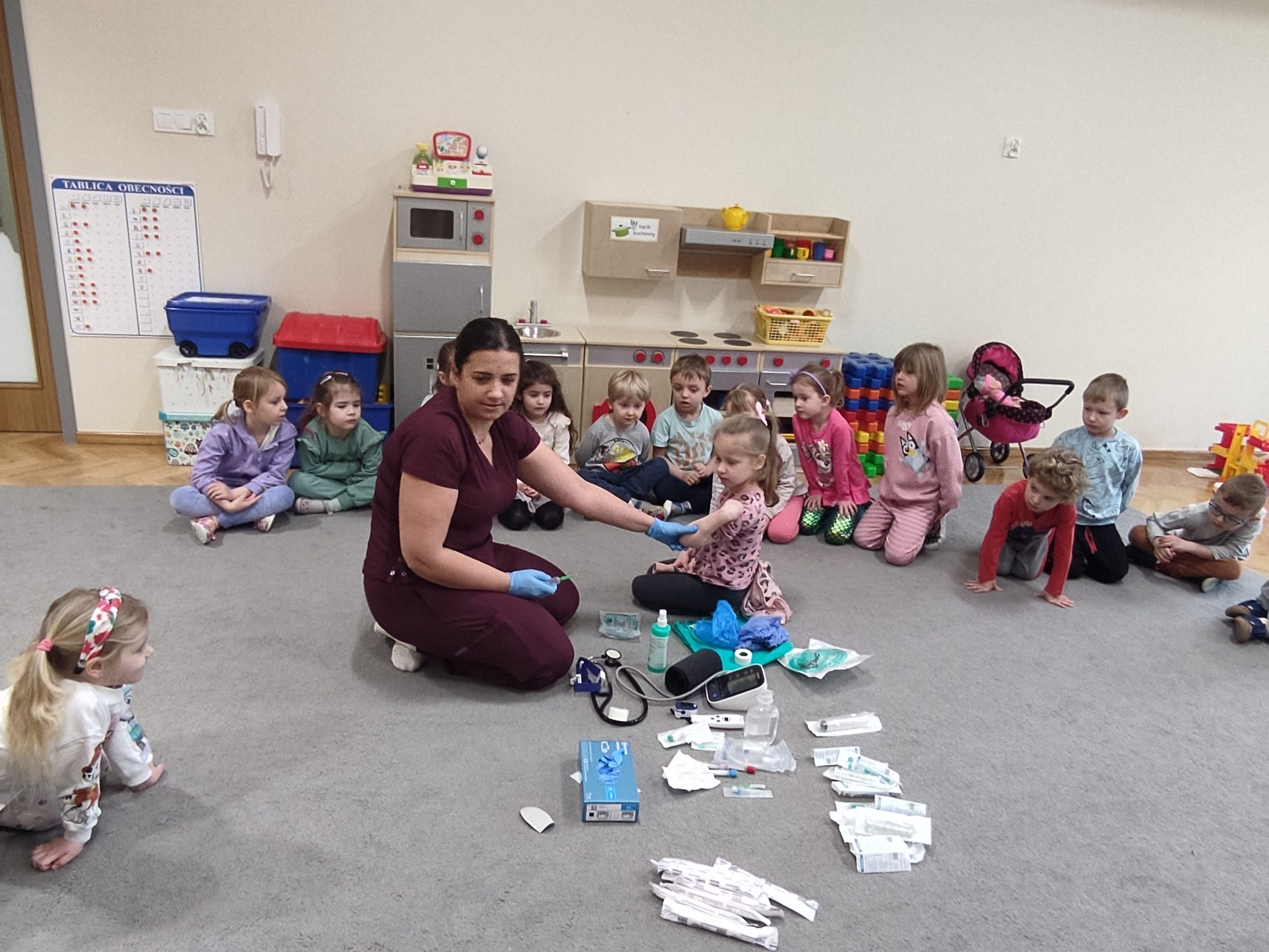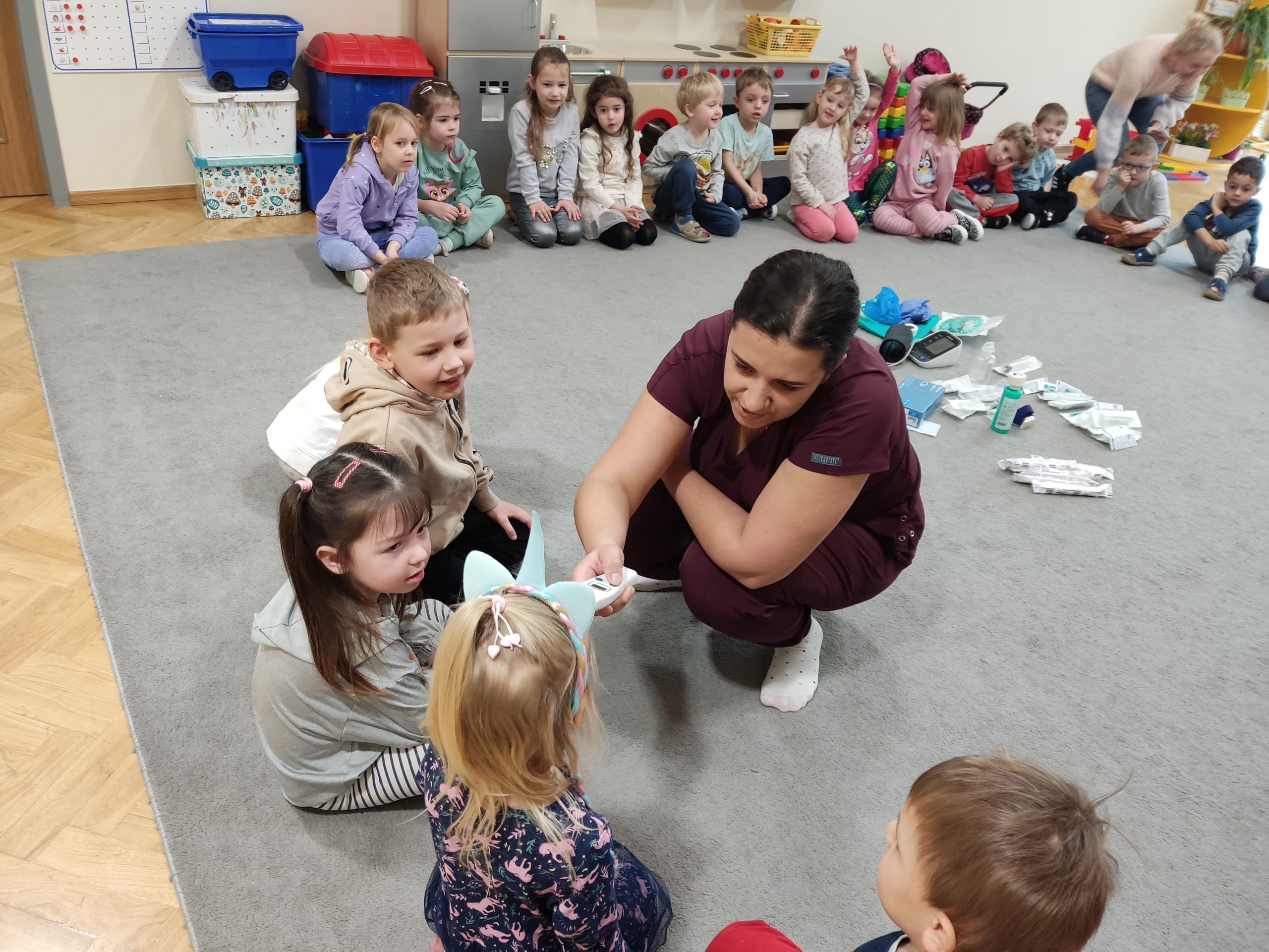 Pani pielęgniarka zaprezentowała dzieciom przedmioty niezbędne do wykonywania tego zawodu i wyjaśniła do czego służą. Przedszkolaki miały okazję obejrzeć m.in. strzykawki, bandaże, termometr, glukometr, ciśnieniomierz i stetoskop. Dzieci pokonały lęk przed zabiegami medycznymi, a przede wszystkim wzbogaciły i utrwaliły wiadomości na temat sposobów dbania o swoje zdrowie. Wizyta Pani pielęgniarki zakończyła się pamiątkowym zdjęciem, wręczeniem upominku z podziękowaniem za wspaniałe zajęcia praktyczne. Dziękujemy na miłe spotkanie!