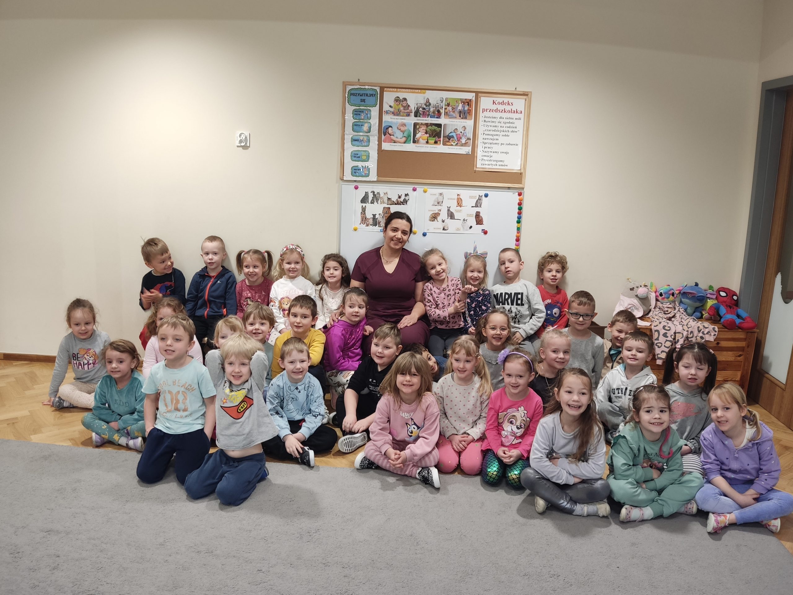 W grupie „Misiów” i „Wiewiórek” powitaliśmy we wtorkowy poranek gościa – Panią Kasię – pielęgniarkę, która pracuje w szpitalu (a przy okazji Mamę Mai). Spotkanie zainspirowane było tematem tygodniowym „Zdrowy Przedszkolak”. W przyjaznej atmosferze Pani Kasia opowiedziała dzieciom jak dbać o zdrowie. Usłyszeliśmy dużo cennych rad, co robić żeby nie chorować. Przedszkolaki dowiedziały się, jak ważne jest przestrzeganie zasad mycia rąk oraz zasłaniania ust i nosa podczas kichania. To umiejętności bardzo potrzebne w codziennym życiu. Pani Kasia poruszyła ważny problem, jakim jest zdrowe odżywianie dzieci. Uświadomiła naszym przedszkolakom, że prawidłowe, racjonalne żywienie obok regularnej aktywności fizycznej, jest ważnym elementem zdrowego stylu życia, warunkującym pełnię zdrowia oraz prawidłowy wzrost i rozwój młodego organizmu.