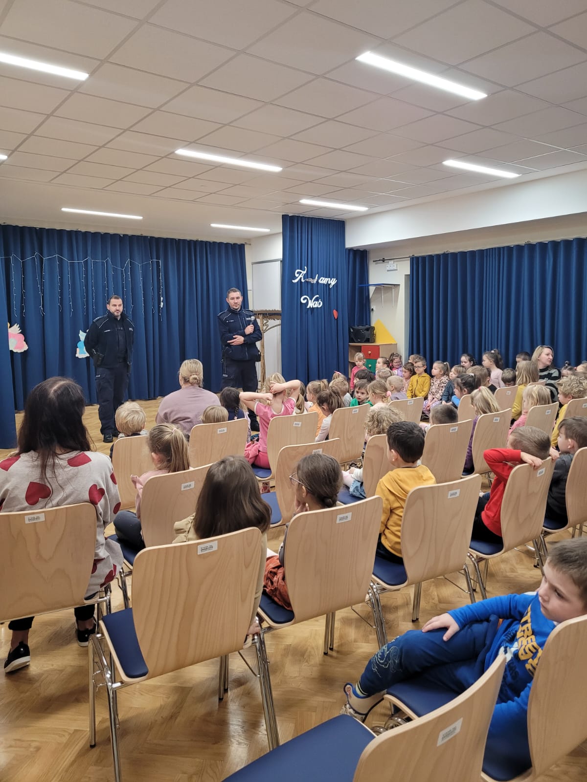 Dbając o bezpieczeństwo naszych przedszkolaków w czasie zimowych zabaw i zbliżających się ferii, 10 stycznia odbyło się spotkanie profilaktyczno-edukacyjne z funkcjonariuszami policji. Podczas prelekcji policjanci przypomnieli o zagrożeniach mogących pojawić się w trakcie ferii. Szczególnie skupili się na omówieniu zasad bezpieczeństwa podczas uprawiania sportów zimowych oraz gier i zabaw na świeżym powietrzu. Przestrzegali przed ślizganiem się na skutych lodem jeziorach, stawach i rzekach, przed zjeżdżaniem z górek znajdujących się w pobliżu ulic. Funkcjonariusze udzielili wskazówek jak bezpiecznie bawić się na śniegu i jak zachować się na kuligu. Przypomnieli zasady postępowania wobec nieznajomej osoby, ale również uświadomili dzieciom do kogo mogą zwrócić się
