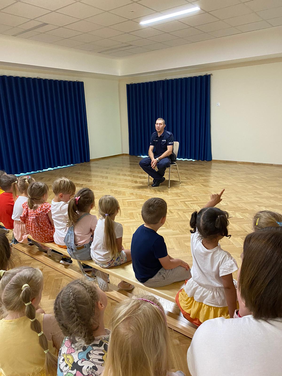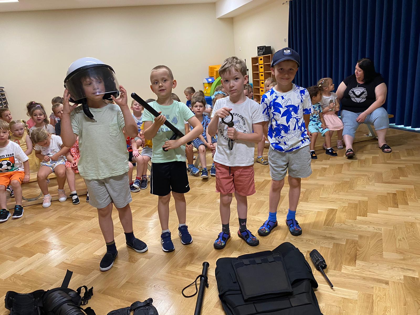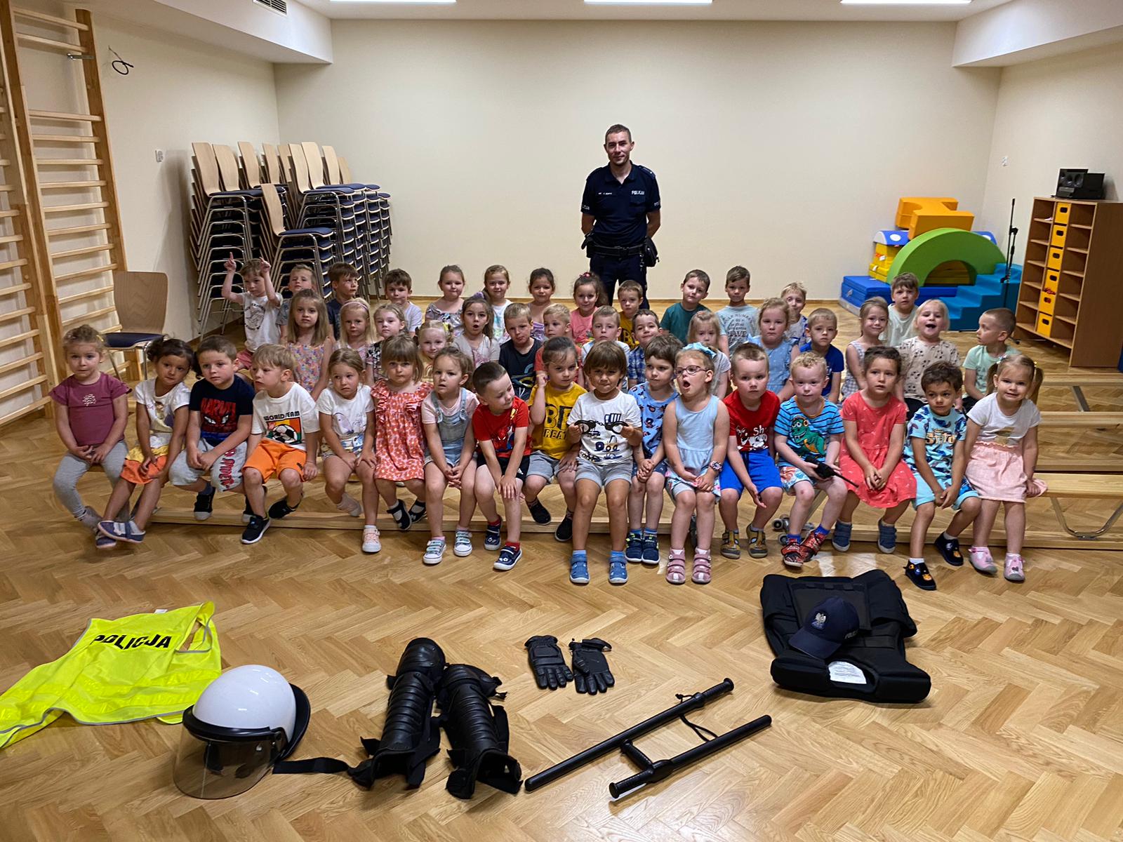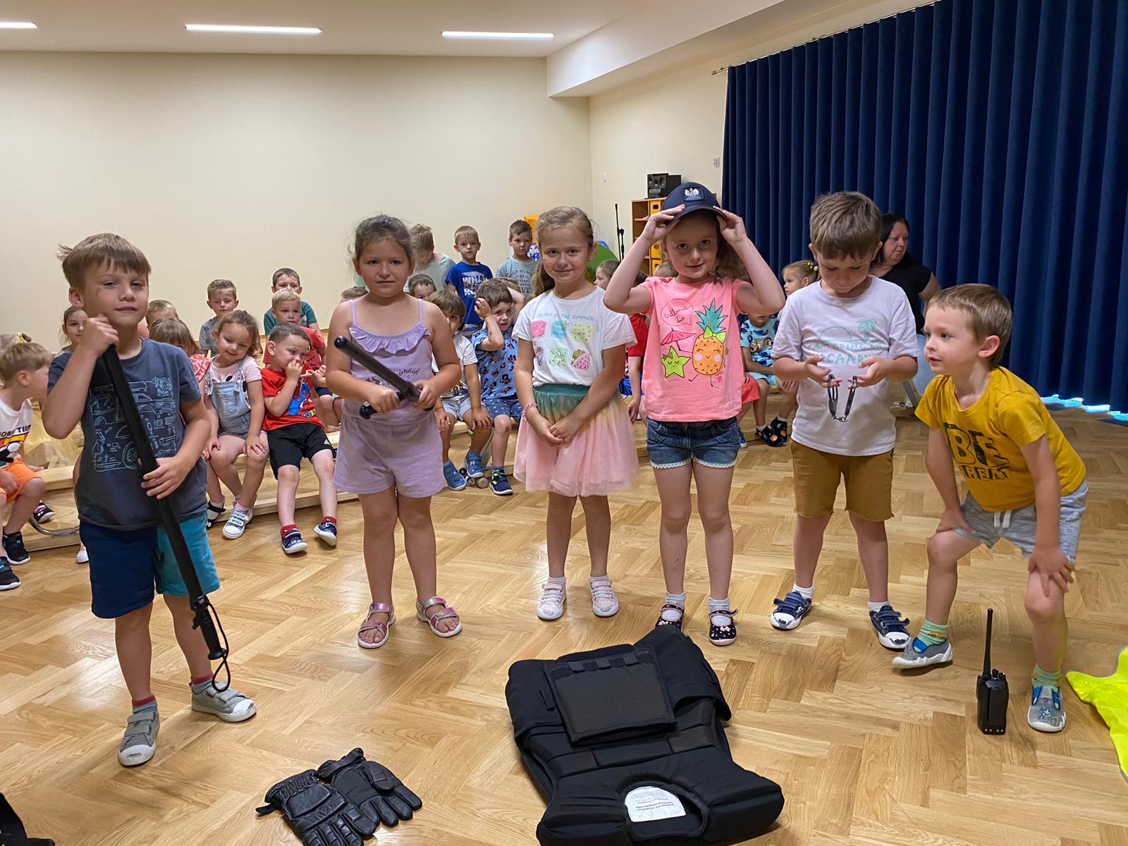 26 czerwca nasze przedszkole odwiedził Pan Policjant, który rozmawiał z dziećmi na temat bezpieczeństwa podczas wakacji, przypomniał dzieciom kiedy można wzywać pomoc w razie zagrożenia życia. Wszyscy chcieli przymierzyć wyposażenie służbowe policjanta. Może wśród dzieci też kiedyś będą policjanci!