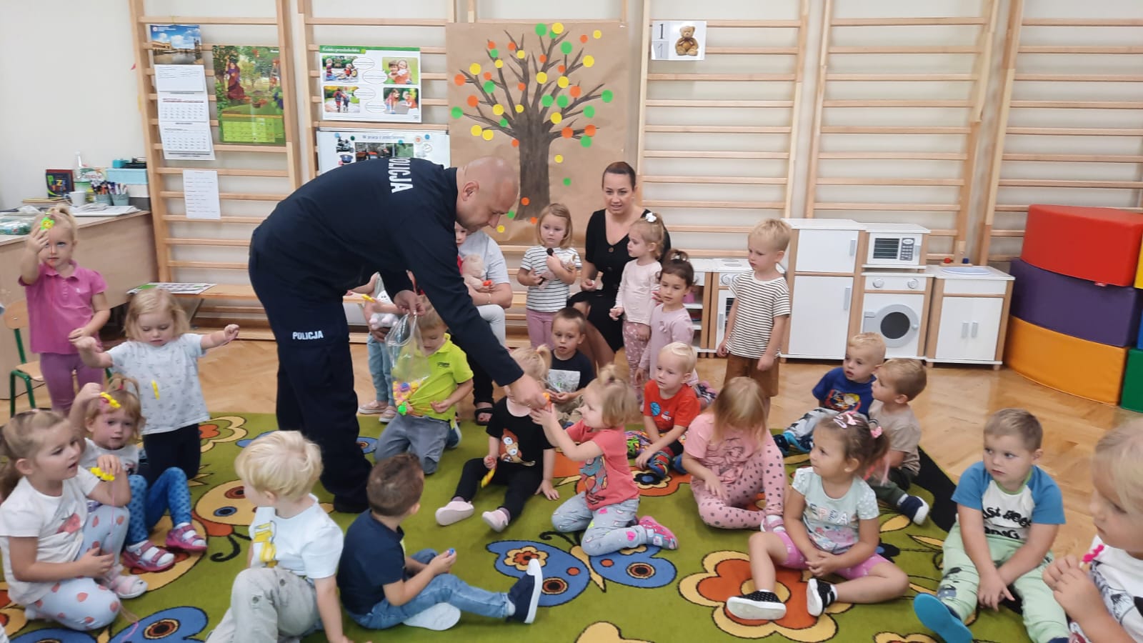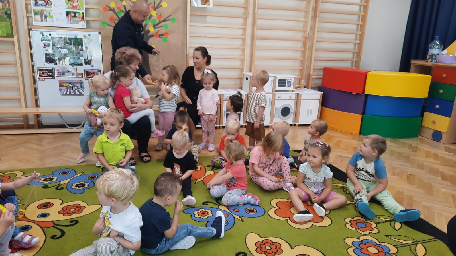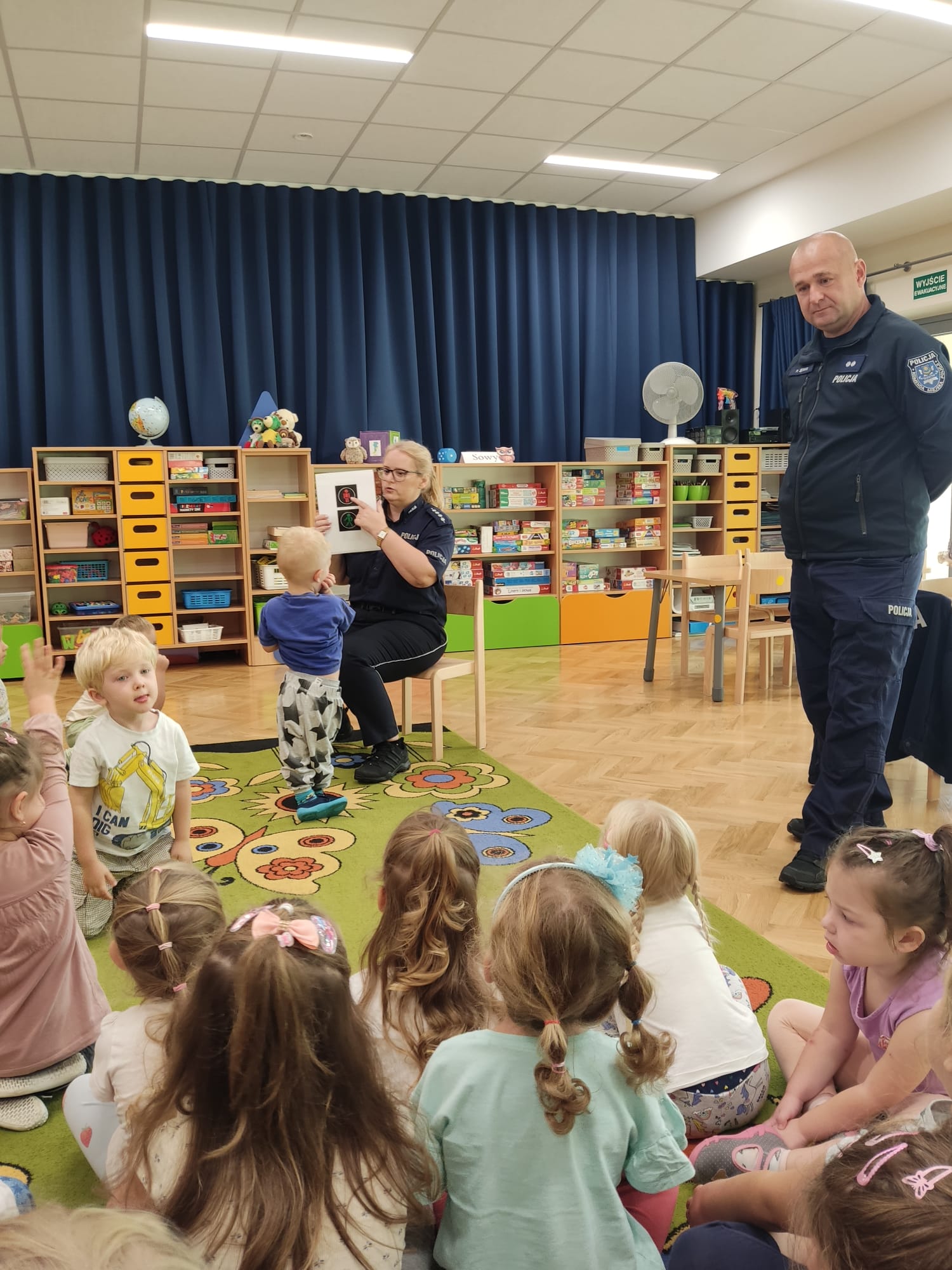 26 września braliśmy udział w spotkaniu z policjantem. „Jeżyki” dowiedziały się jak działa sygnalizacja świetlna i jak prawidłowo przechodzić przez jezdnię. Dowiedzieliśmy się również wielu rzeczy na temat bezpieczeństwa oraz tego, żeby nie nawiązywać kontaktu z obcymi ludźmi. Przedszkolaki chętnie odpowiadały na pytania policjantów, przypomniały numer alarmowy i z dużym zainteresowaniem wysłuchały rad i wskazówek funkcjonariuszy dotyczących zasad bezpiecznego poruszania się po drodze.
