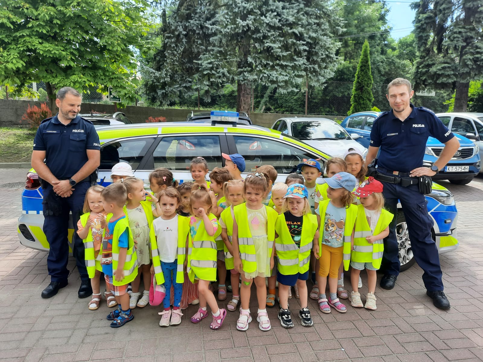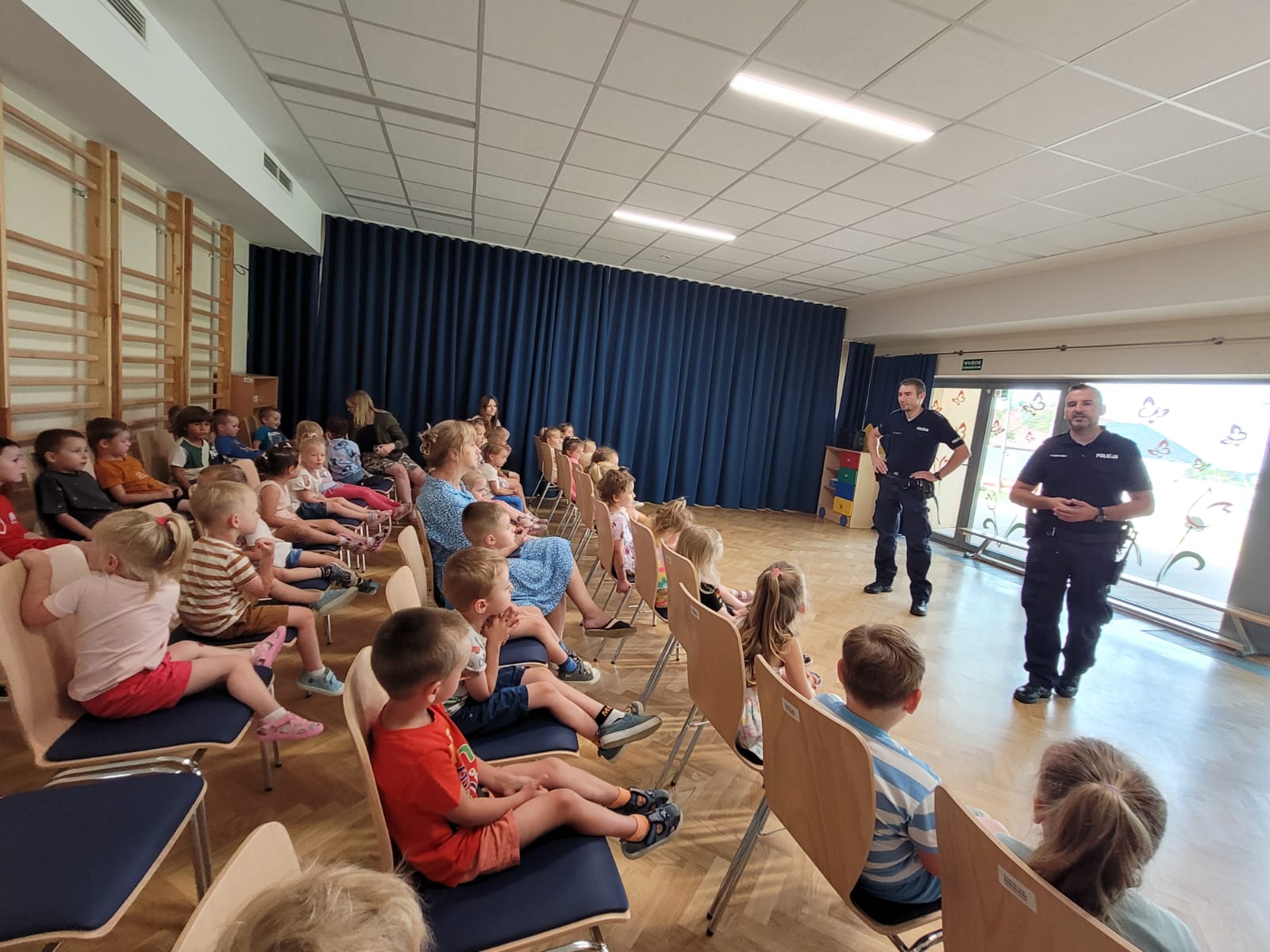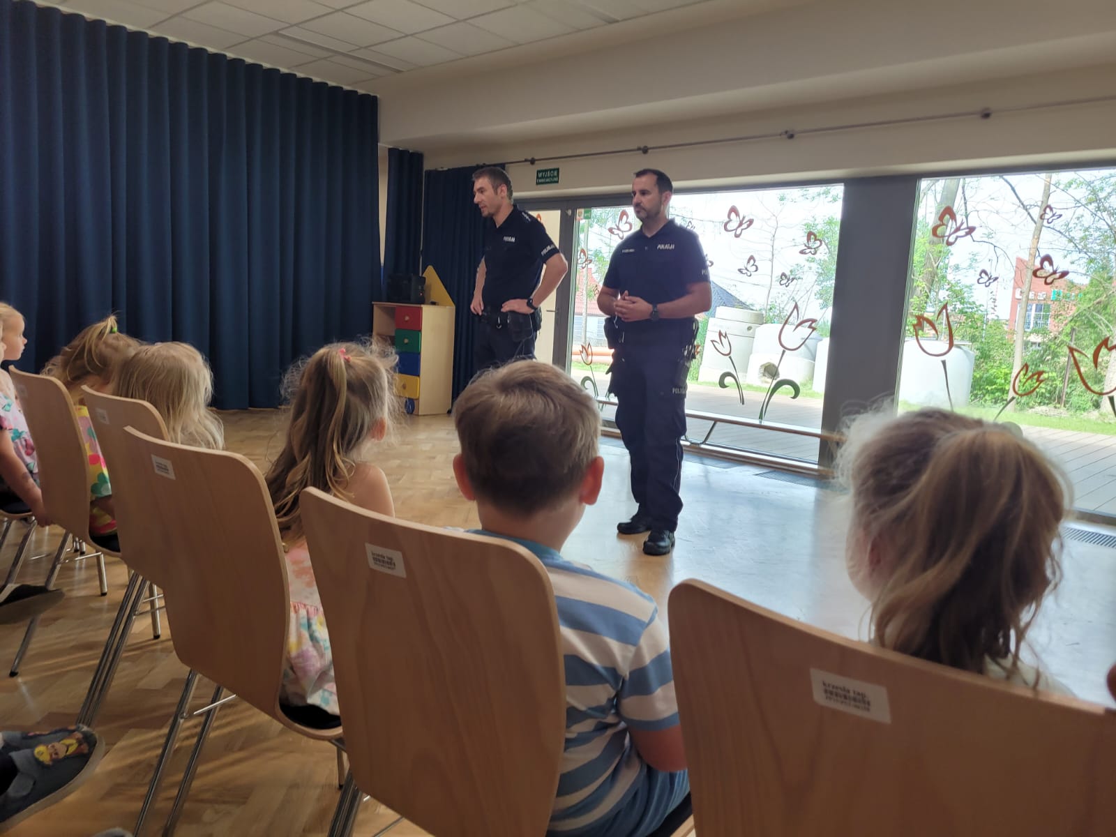 18 czerwca 2024 r. w naszym przedszkolu odbyło się spotkanie z policjantami, dzielnicowym asp. Pawłem Jędrysiem oraz asp. Pawłem Kosiarskim. Tematem spotkania były „Bezpieczne wakacje”, policjanci utrwalali z dziećmi zasady ruchu drogowego oraz przypominali zagadnienia dotyczące bezpieczeństwa dzieci w domu, nad wodą i podczas wakacyjnych wyjazdów. Panowie policjanci, w formie praktycznej, przypomnieli podstawowe zasady zachowania się podczas przechodzenia przez jezdnię. Następnie wytłumaczyli jak należy zachować się w kontaktach z obcymi ludźmi, jak dbać o bezpieczeństwo własne i innych oraz do kogo zwracać się o pomoc w sytuacji zagrożenia. Policjanci poinformowali i zademonstrowali dzieciom również, w jaki sposób należy się zachowywać podczas ataku psa. Dzieci z dużym zainteresowaniem słuchały rad i wskazówek naszych gości.