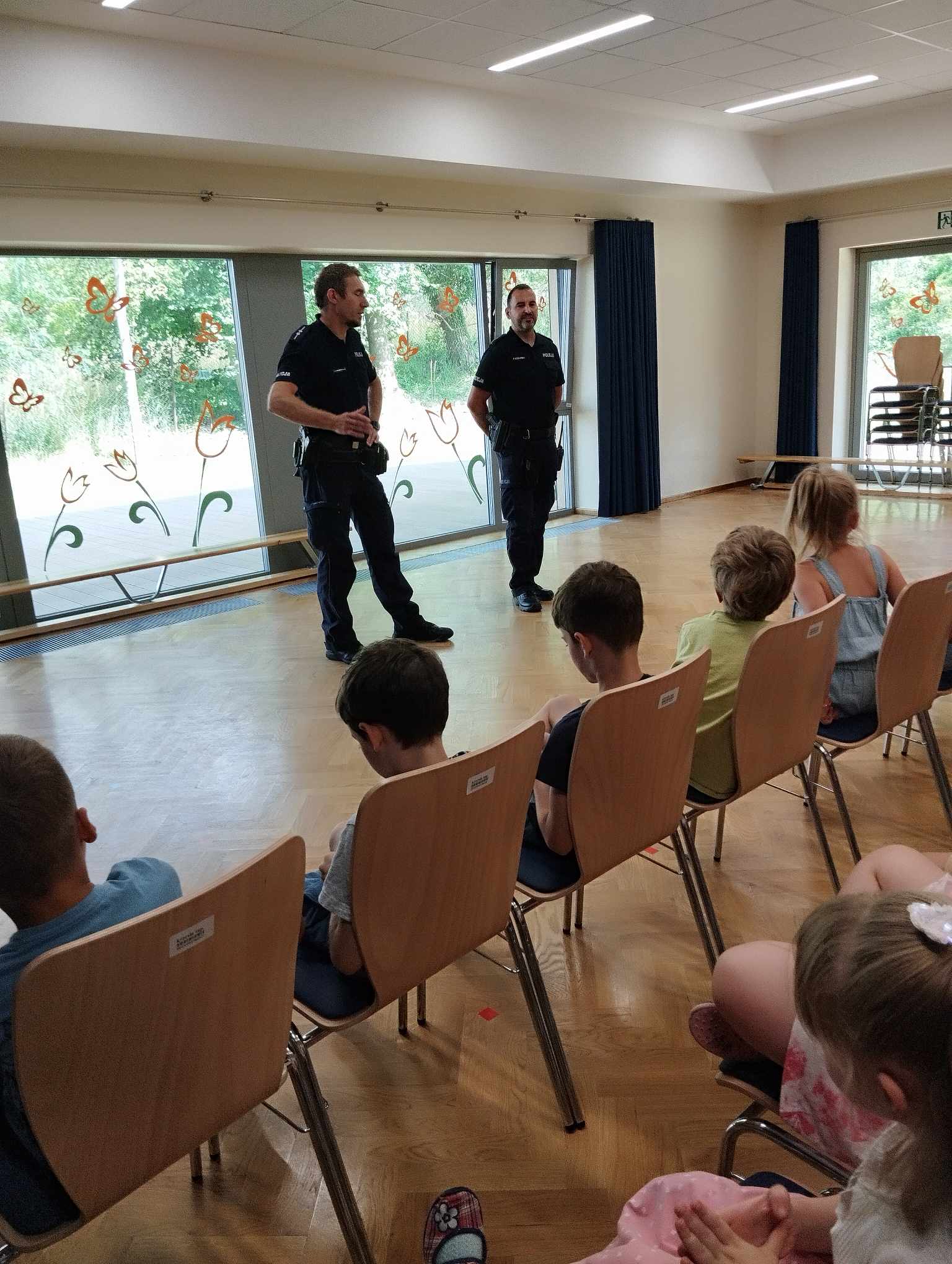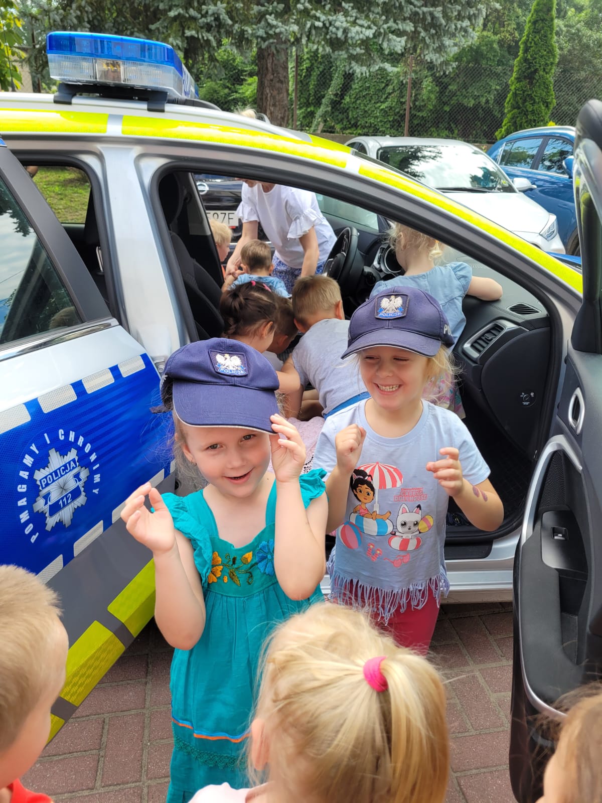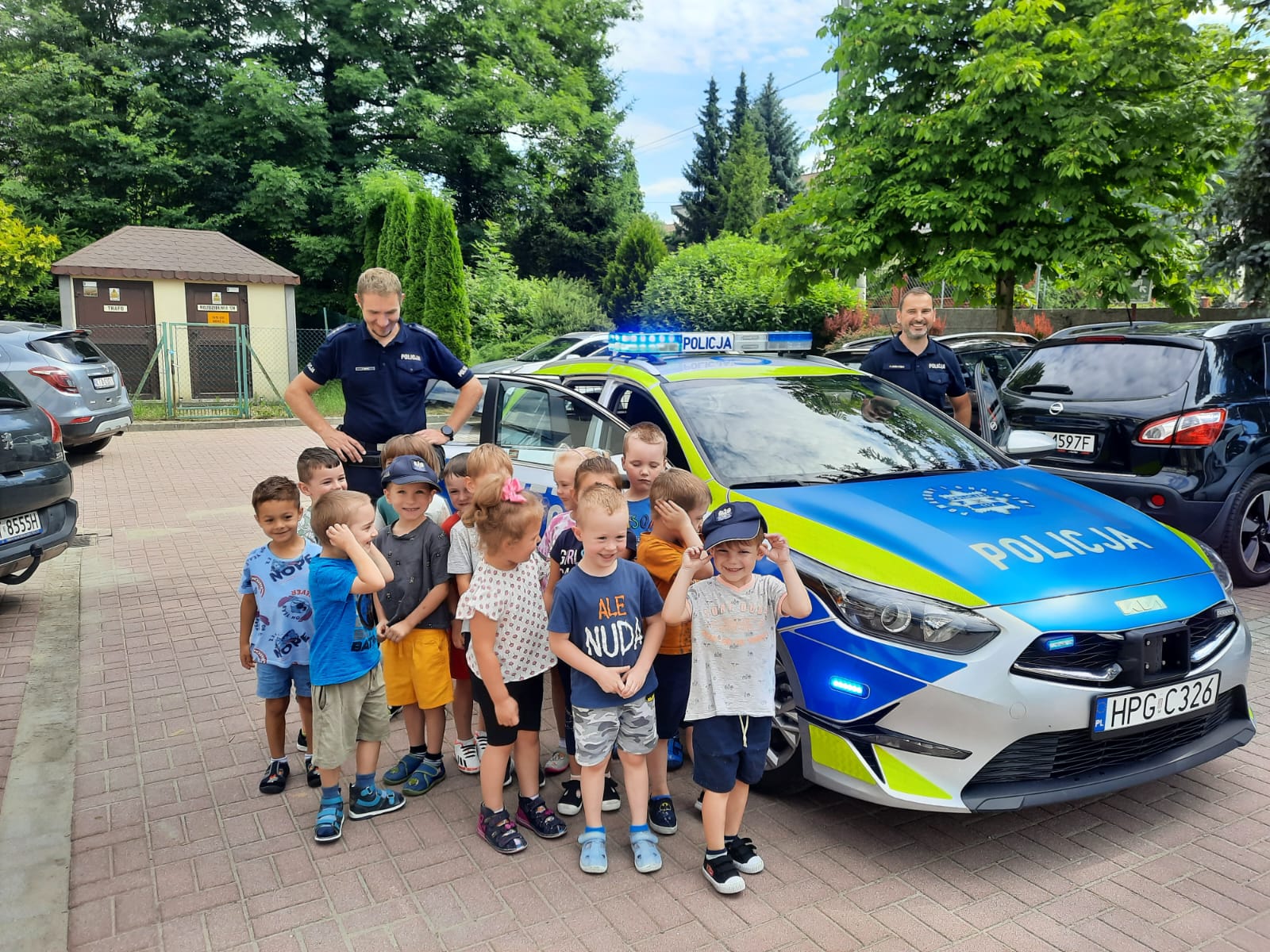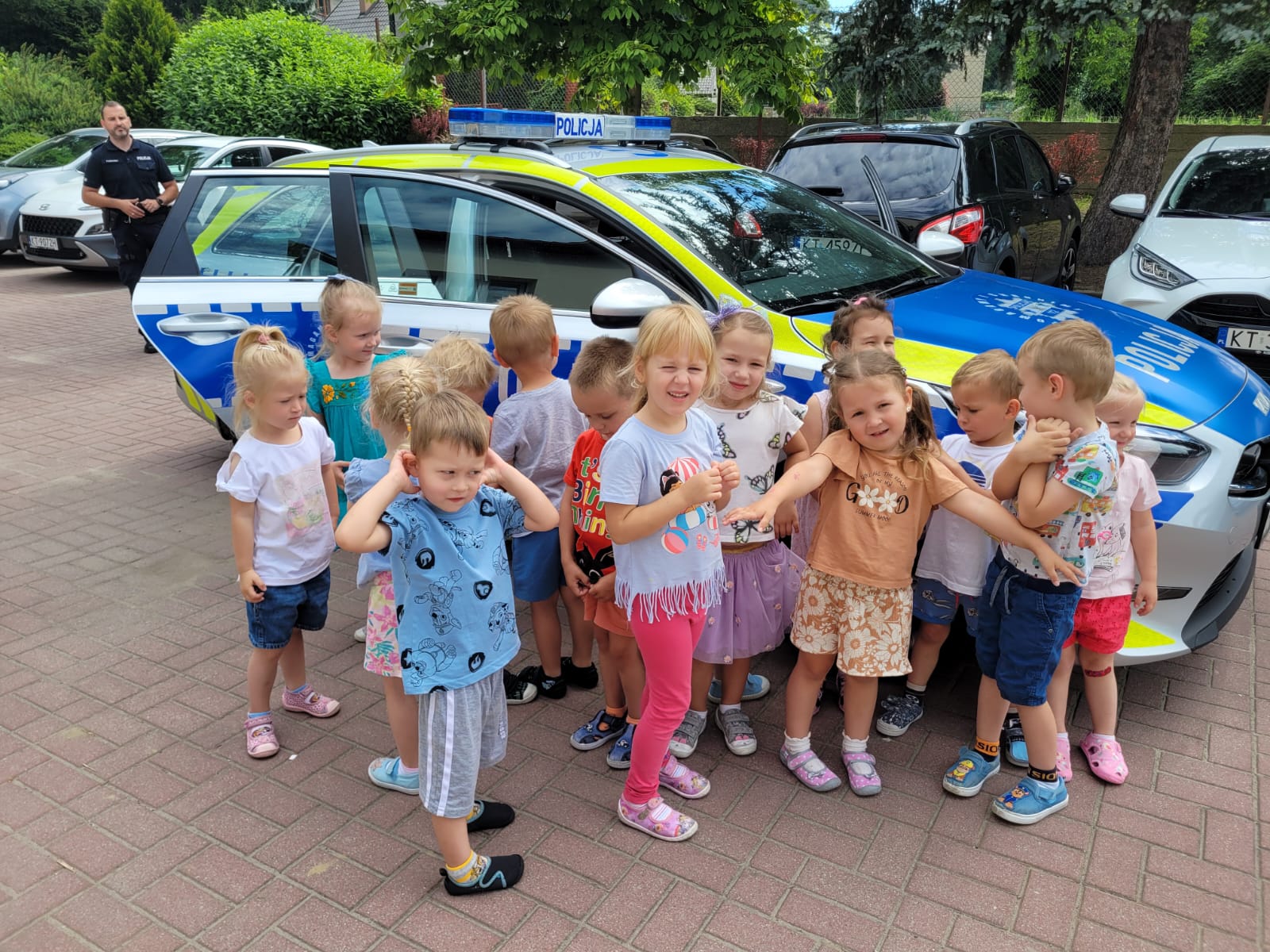 18 czerwca 2024 r. w naszym przedszkolu odbyło się spotkanie z policjantami, dzielnicowym asp. Pawłem Jędrysiem oraz asp. Pawłem Kosiarskim. Tematem spotkania były „Bezpieczne wakacje”, policjanci utrwalali z dziećmi zasady ruchu drogowego oraz przypominali zagadnienia dotyczące bezpieczeństwa dzieci w domu, nad wodą i podczas wakacyjnych wyjazdów. Panowie policjanci, w formie praktycznej, przypomnieli podstawowe zasady zachowania się podczas przechodzenia przez jezdnię. Następnie wytłumaczyli jak należy zachować się w kontaktach z obcymi ludźmi, jak dbać o bezpieczeństwo własne i innych oraz do kogo zwracać się o pomoc w sytuacji zagrożenia. Policjanci poinformowali i zademonstrowali dzieciom również, w jaki sposób należy się zachowywać podczas ataku psa. Dzieci z dużym zainteresowaniem słuchały rad i wskazówek naszych gości.